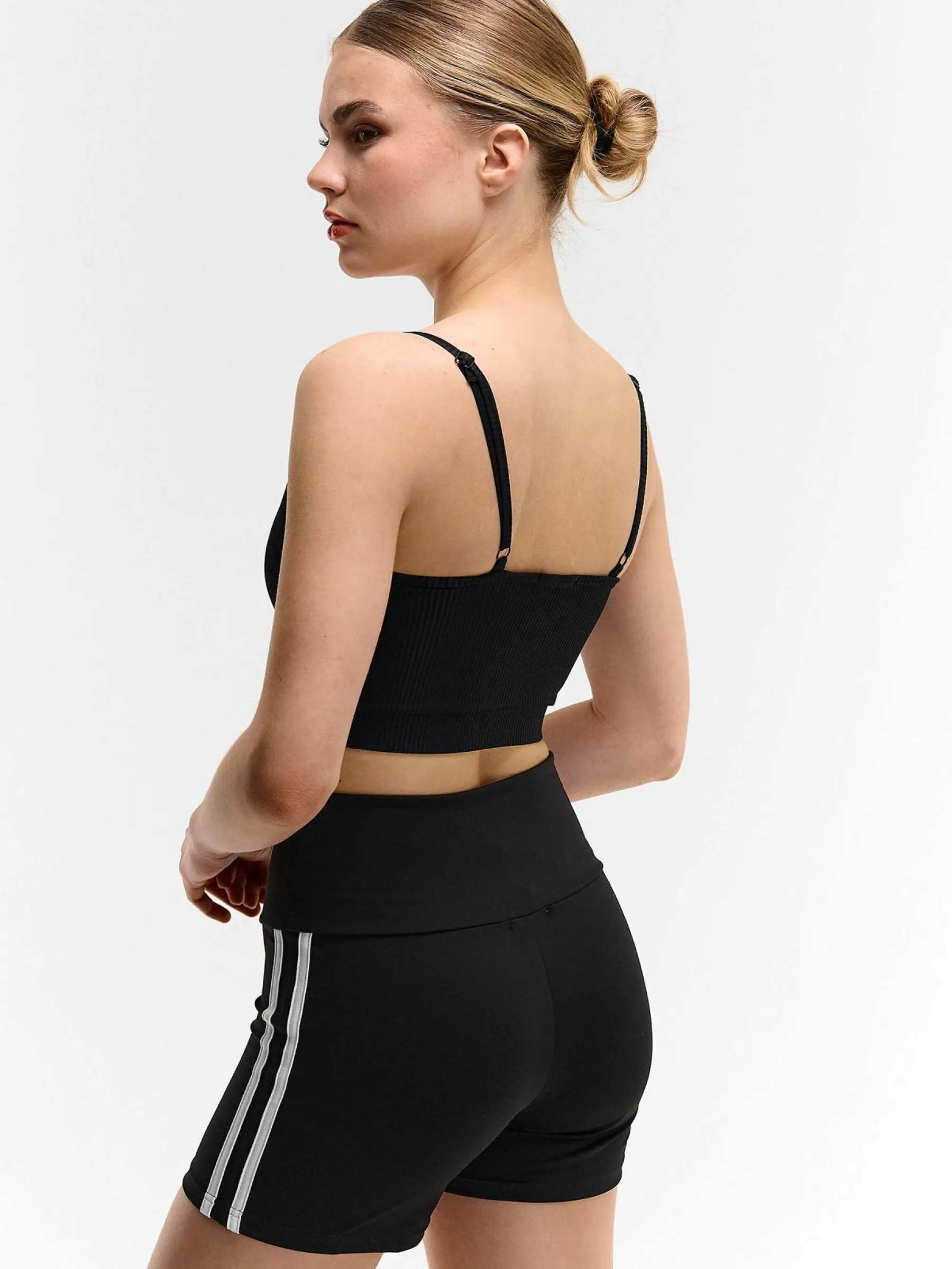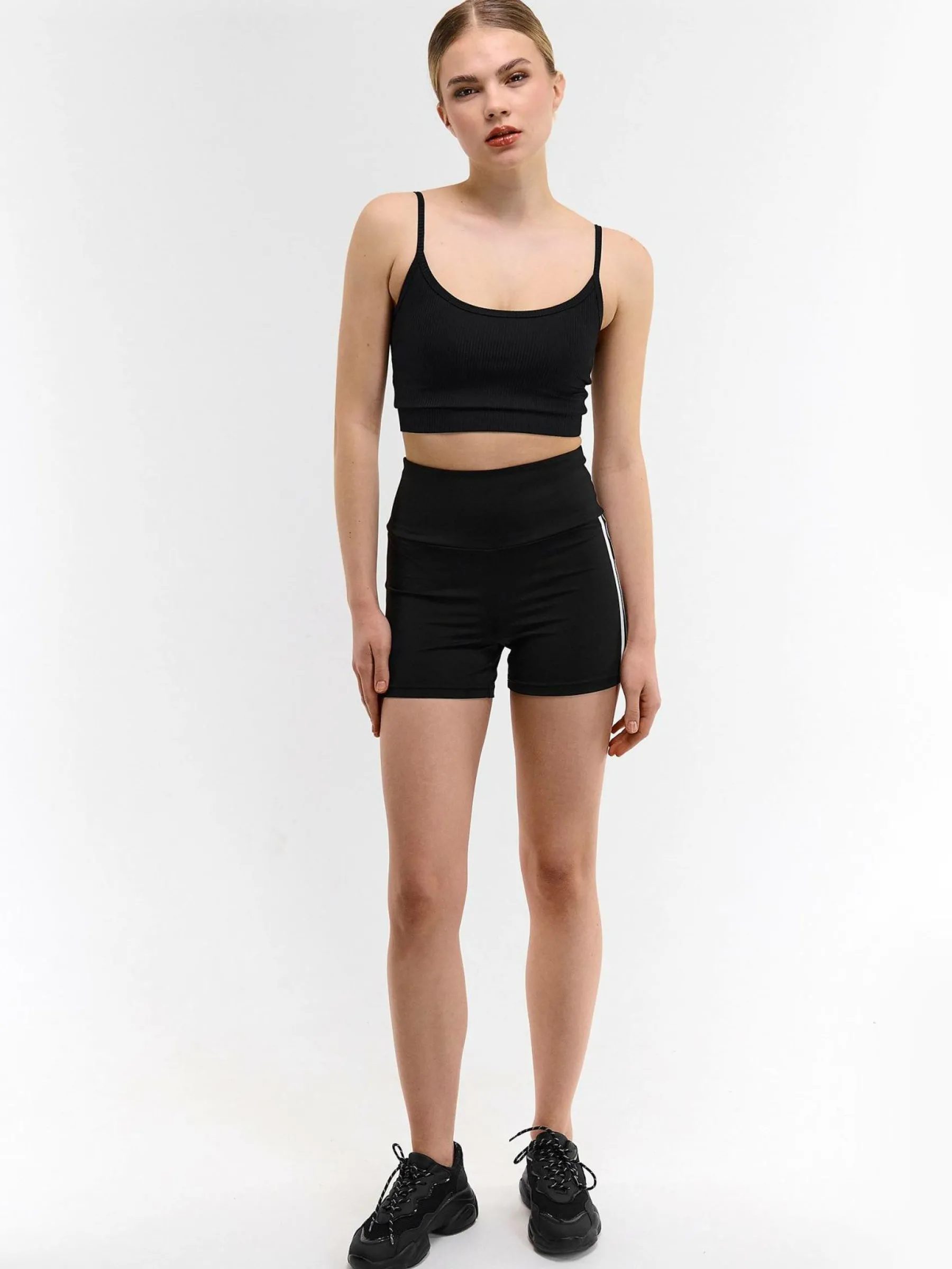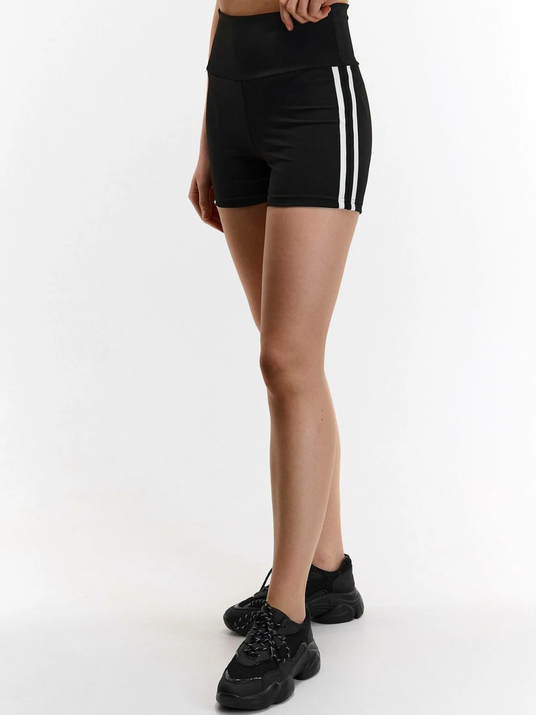 Kolor: czarnyKrój: bikerTyp: spodenkiDługość: krótkiPattern style: pojedynczy kolorDetal: z elastyczną opaską, z …