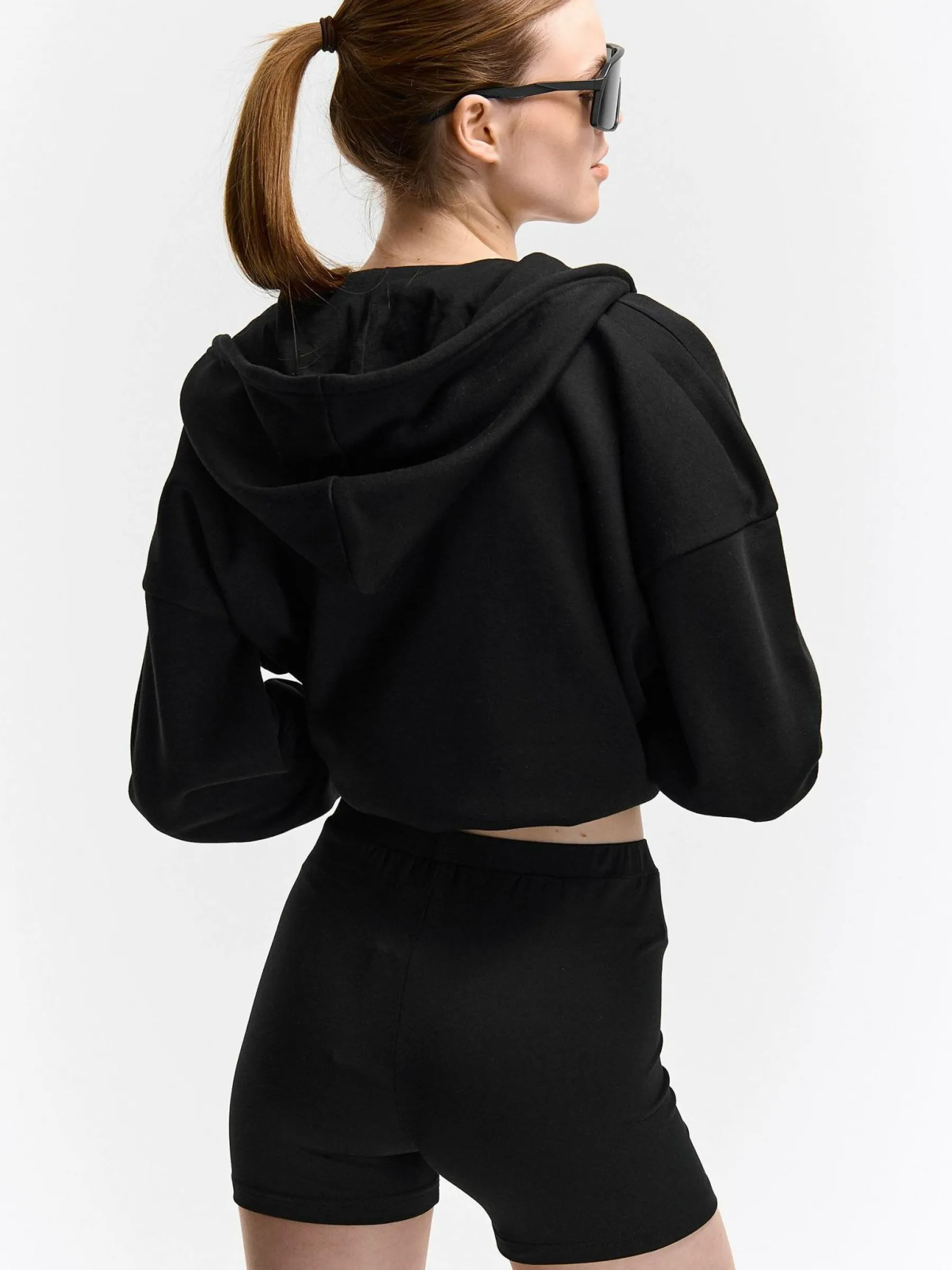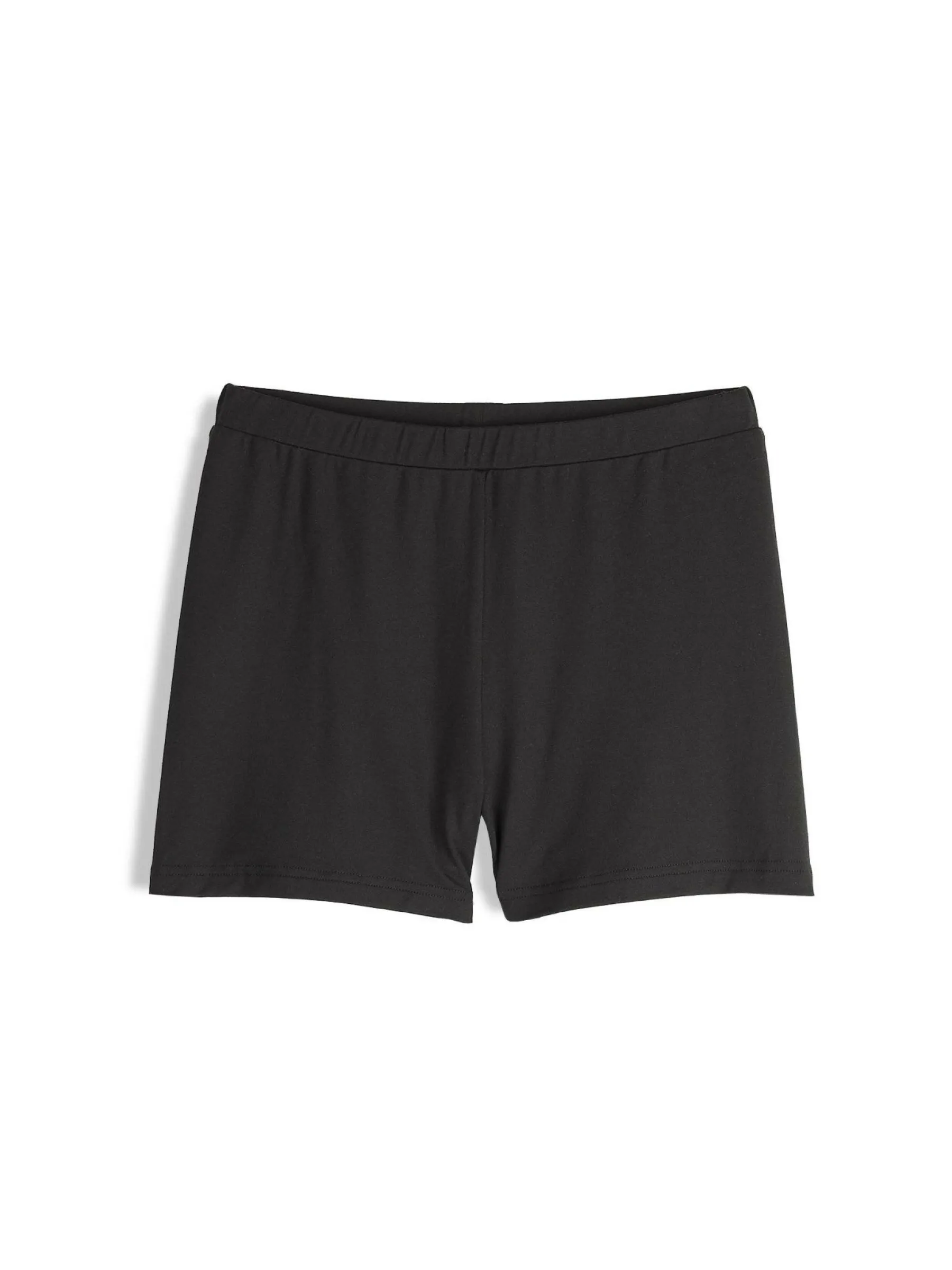 Kolor: czarnyKrój: bikerTyp: spodenkiDługość: krótkiPattern style: pojedynczy kolorDetal: z elastyczną opaskąMate…