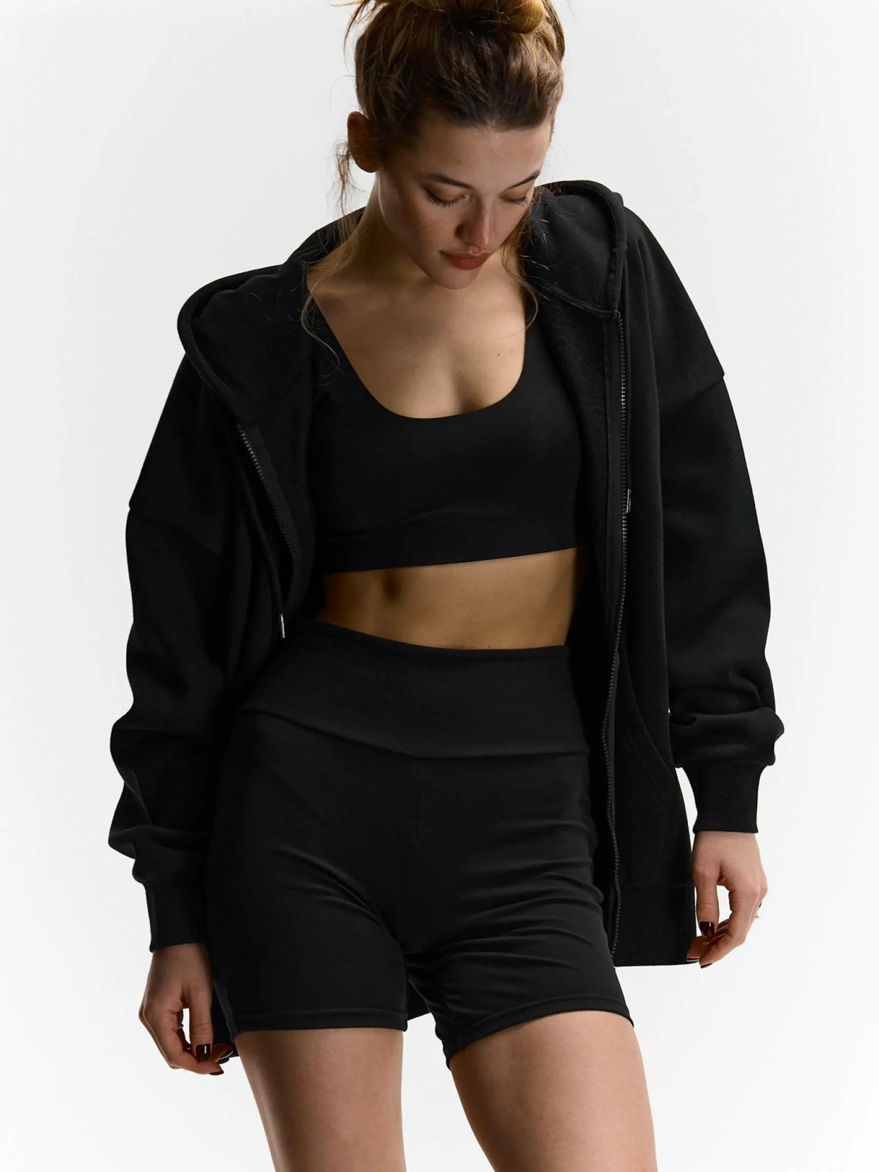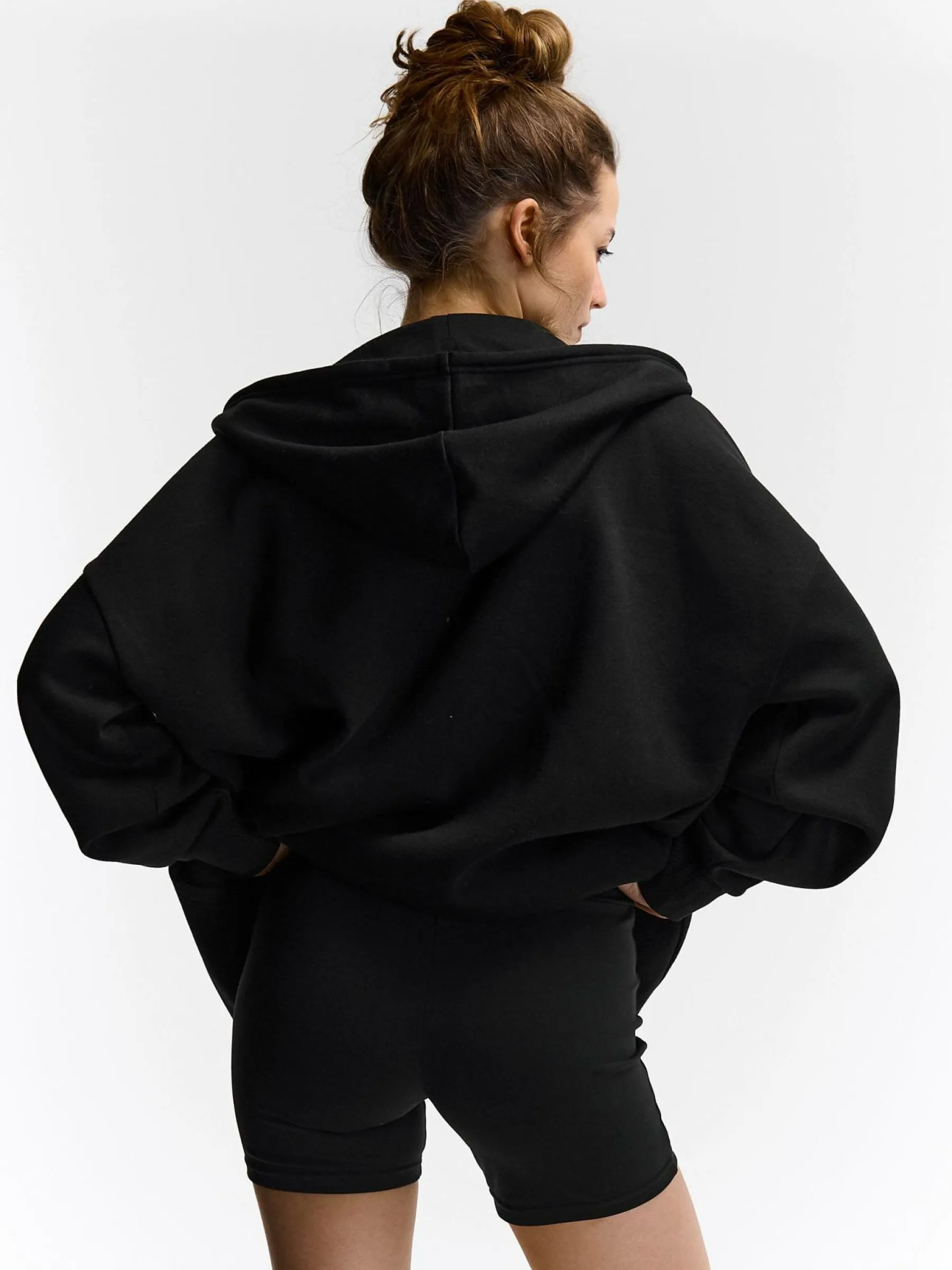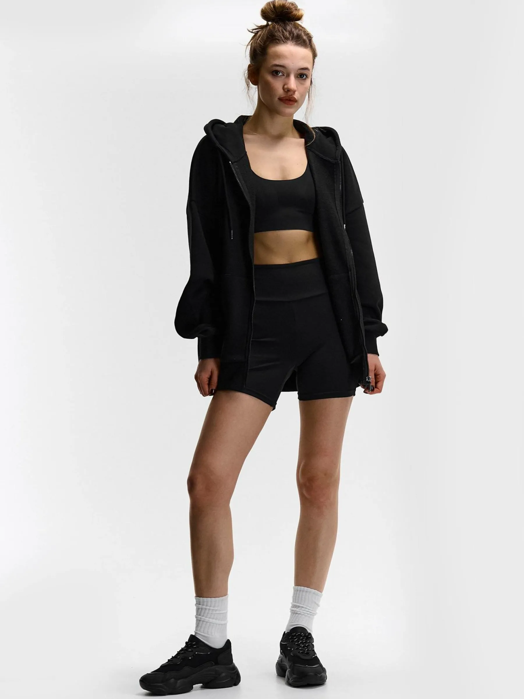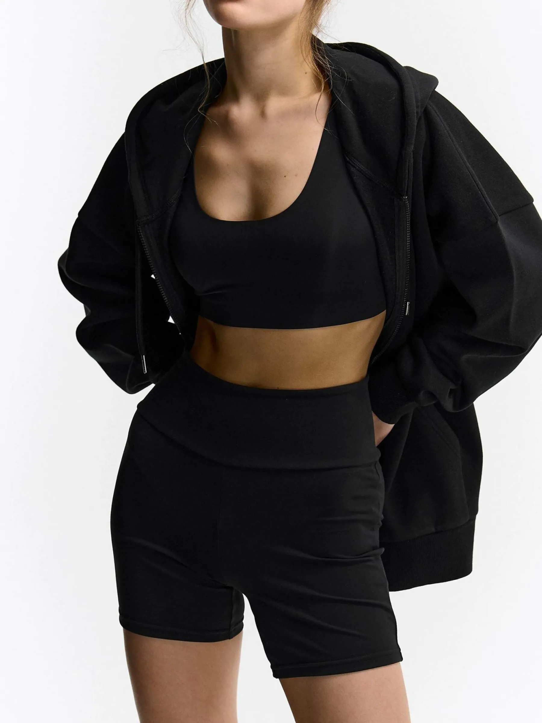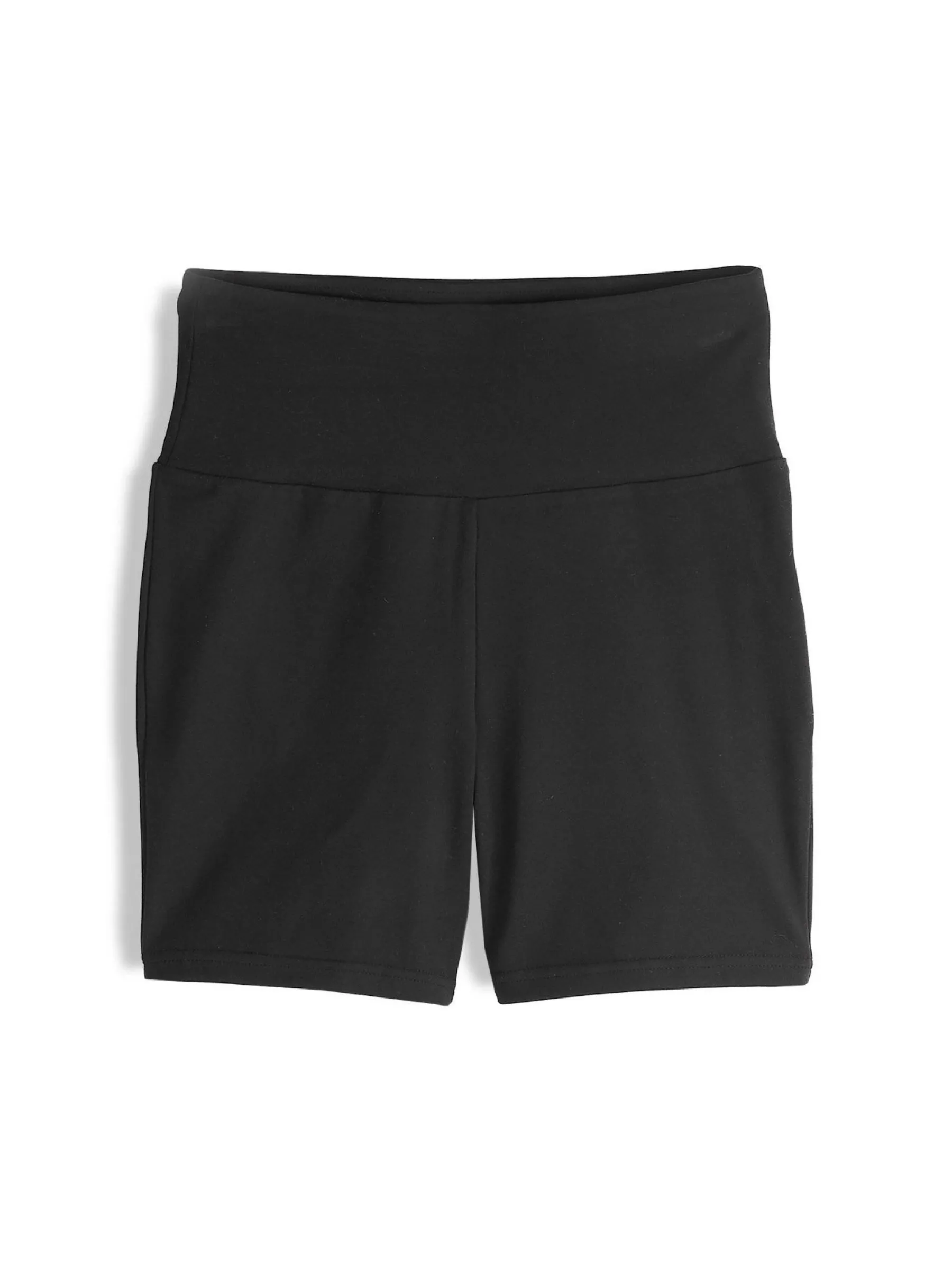 Kolor: czarnyKrój: bikerTyp: spodenkiDługość: krótkiPattern style: pojedynczy kolorDetal: z elastyczną opaskąMate…