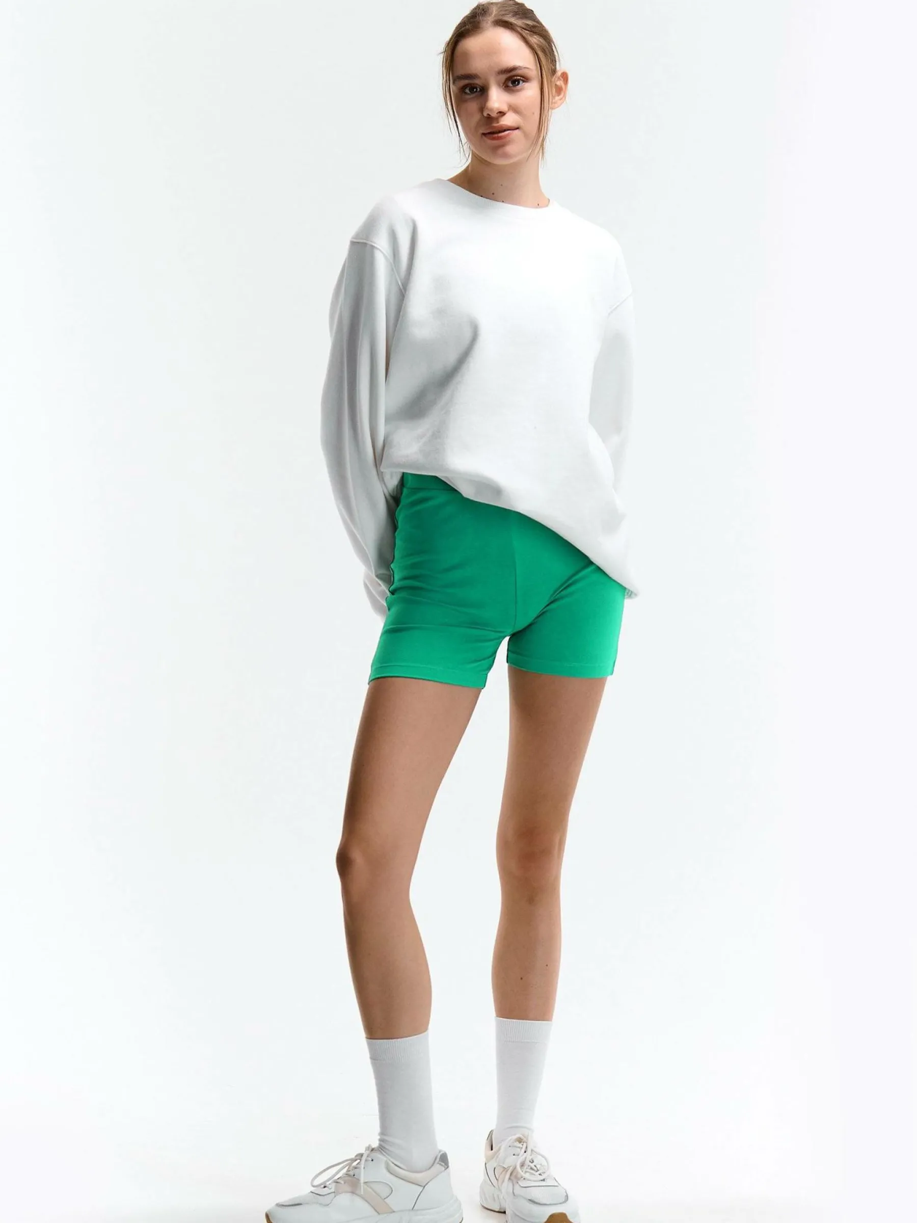 Kolor: zielonyKrój: bikerTyp: spodenkiDługość: krótkiPattern style: pojedynczy kolorDetal: z elastyczną opaskąMat…