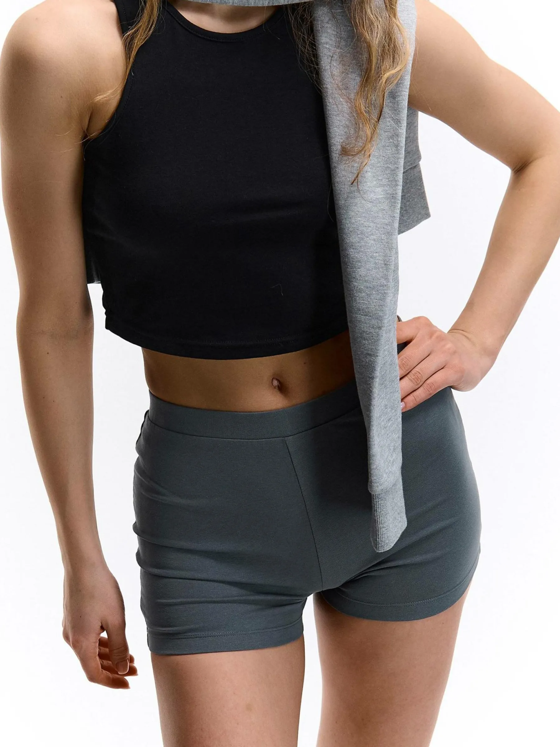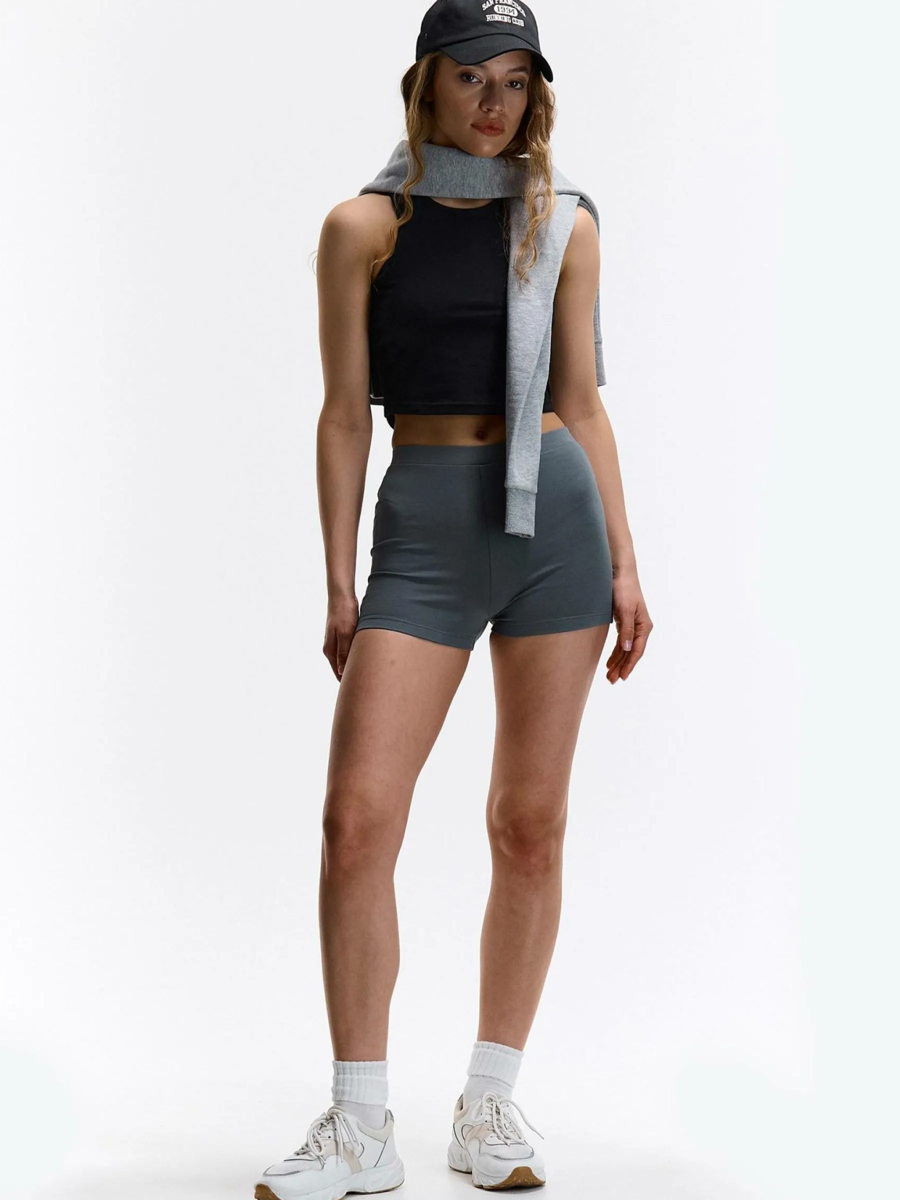 Kolor: szaryKrój: bikerTyp: spodenkiDługość: krótkiPattern style: pojedynczy kolorDetal: z elastyczną opaskąMater…