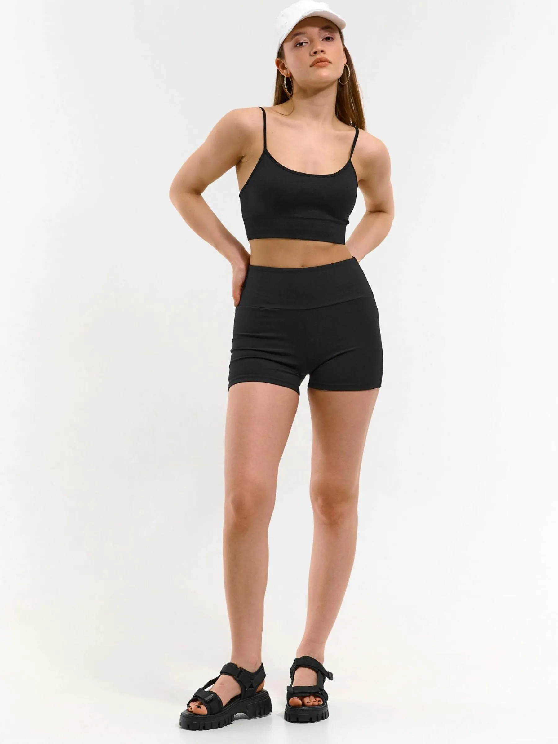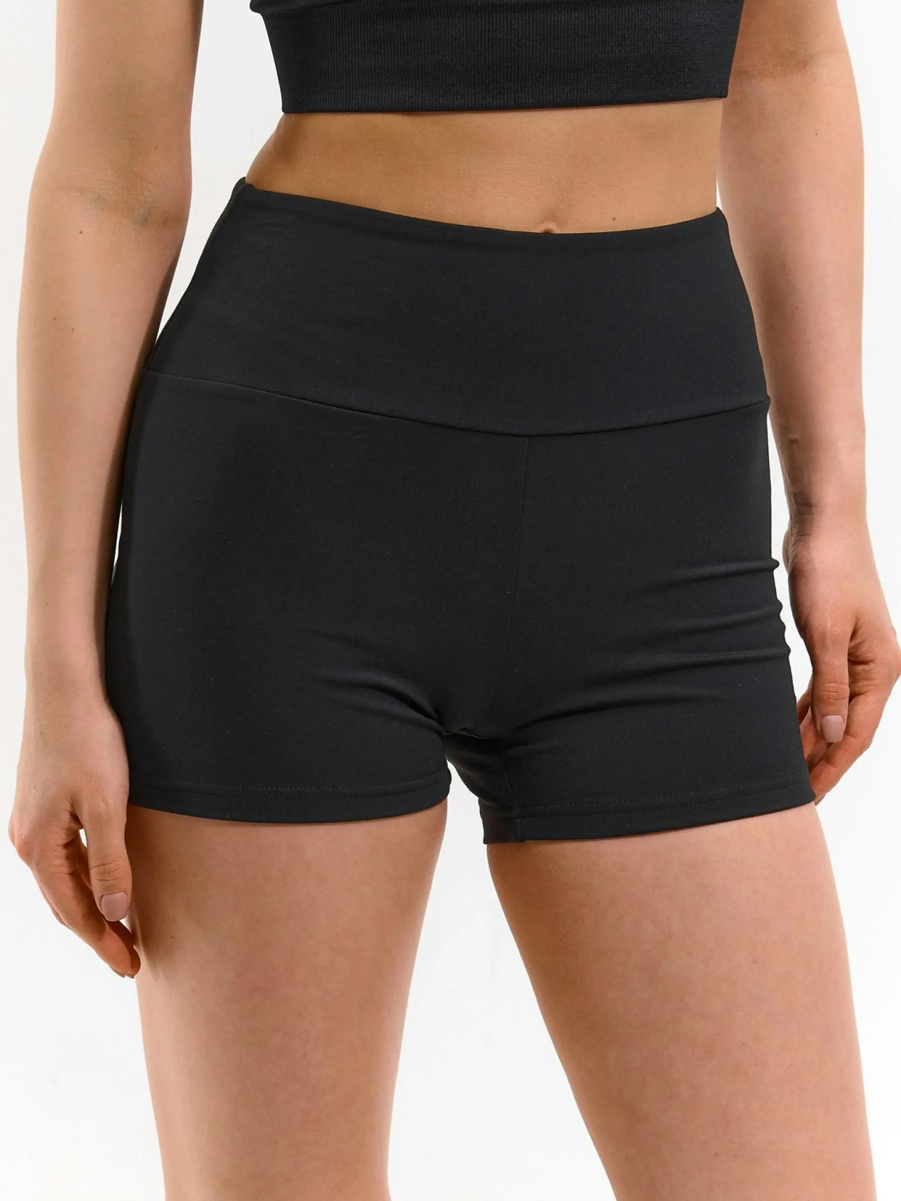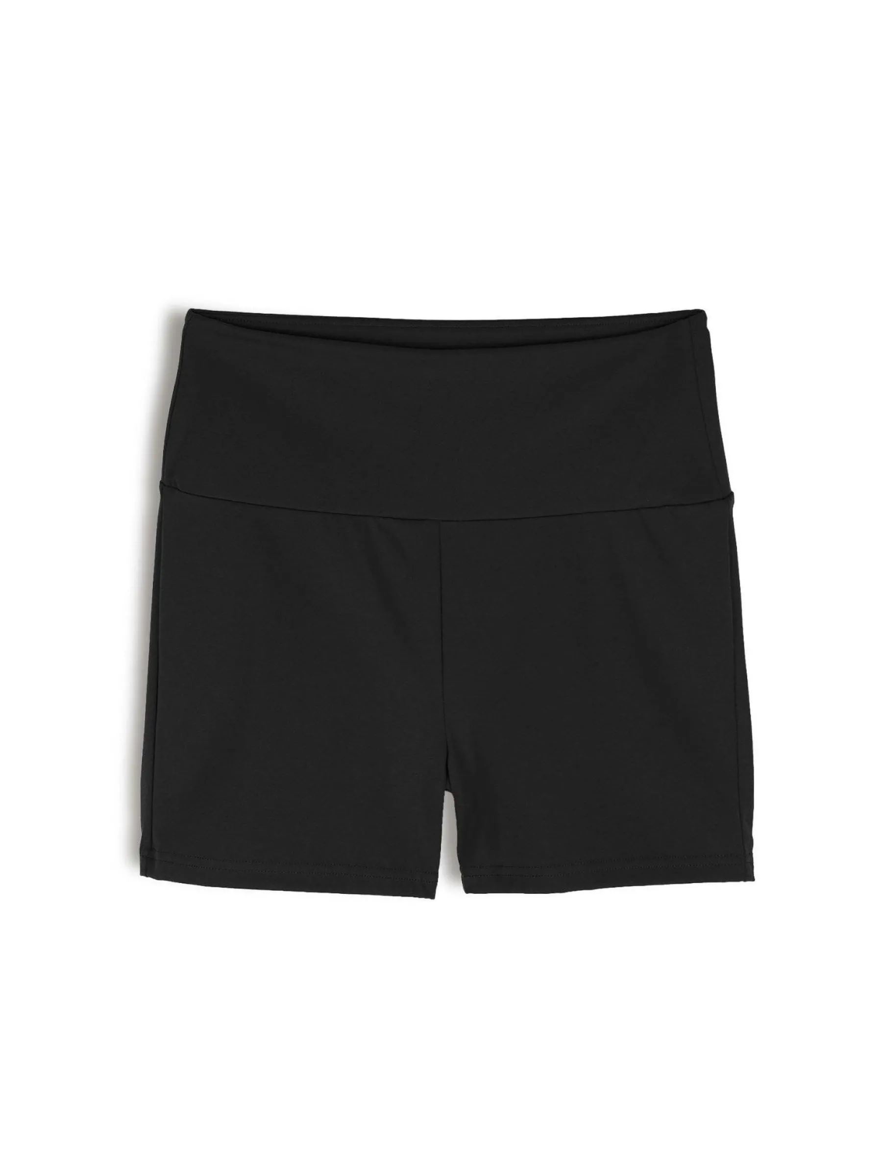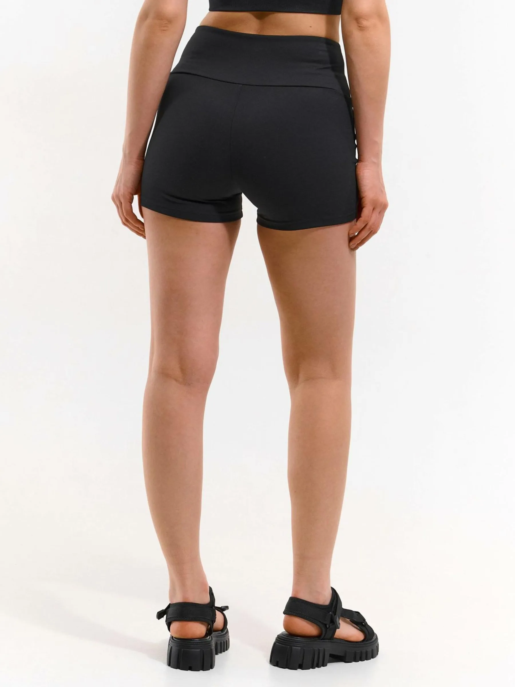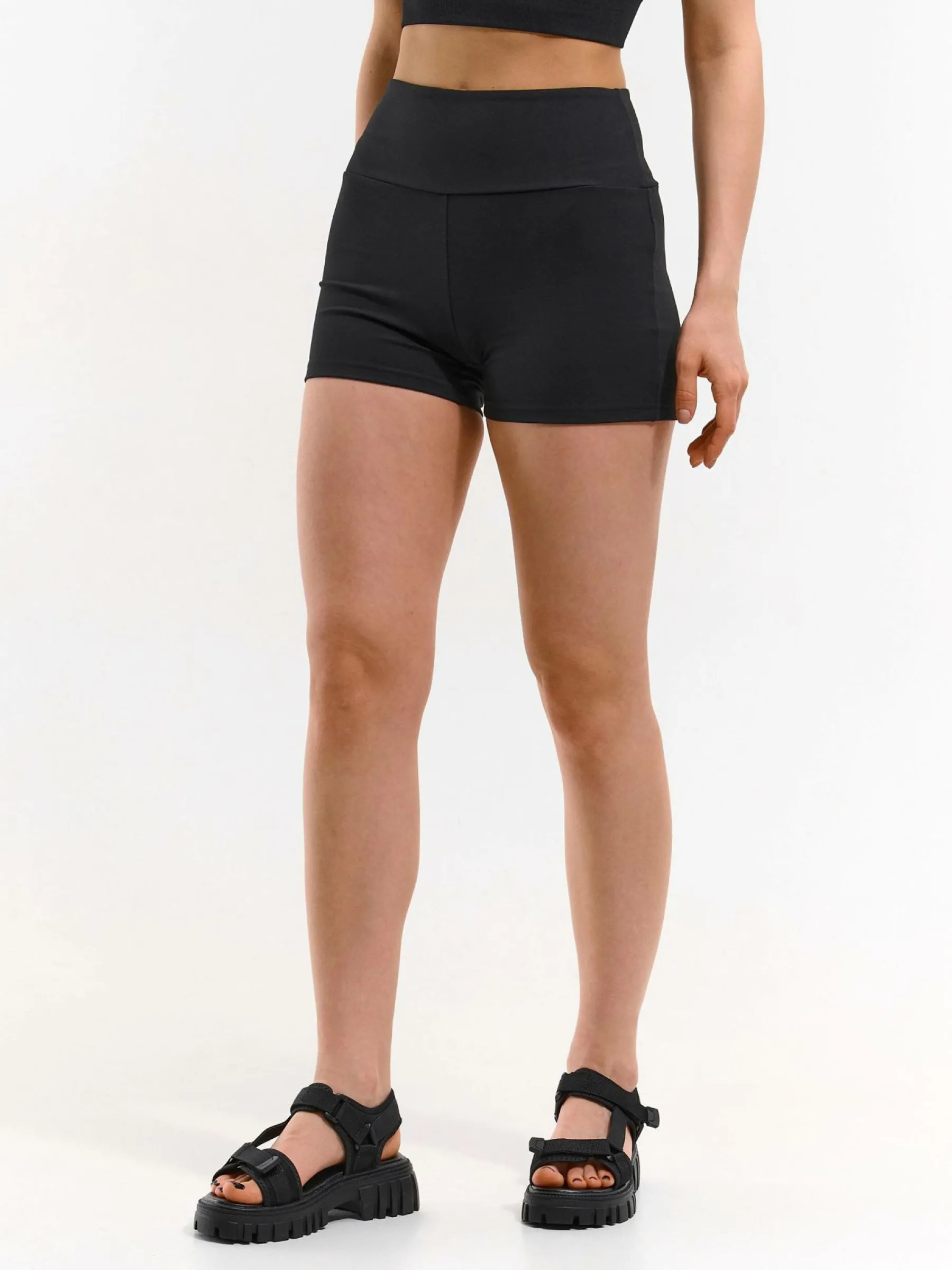 Kolor: czarnyKrój: bikerTyp: spodenkiDługość: krótkiPattern style: pojedynczy kolorMateriał: syntetycznePłeć: ko…