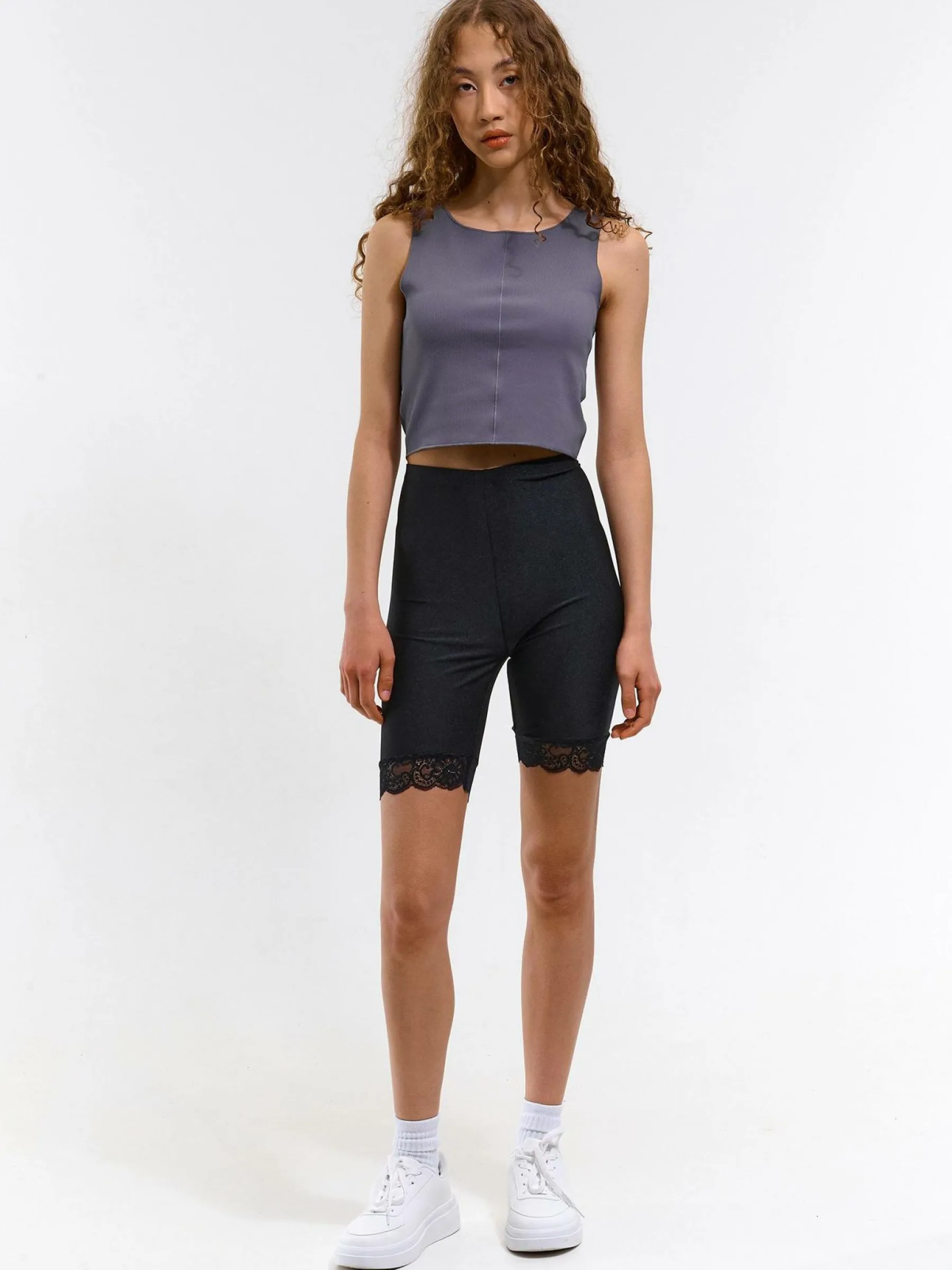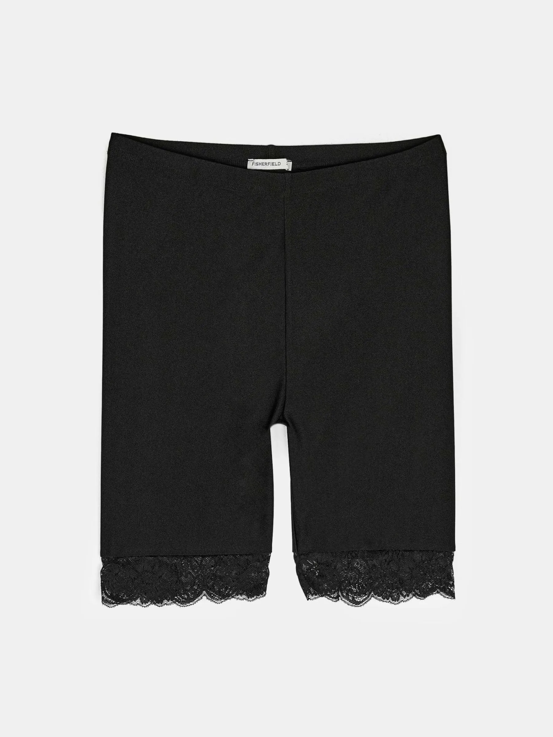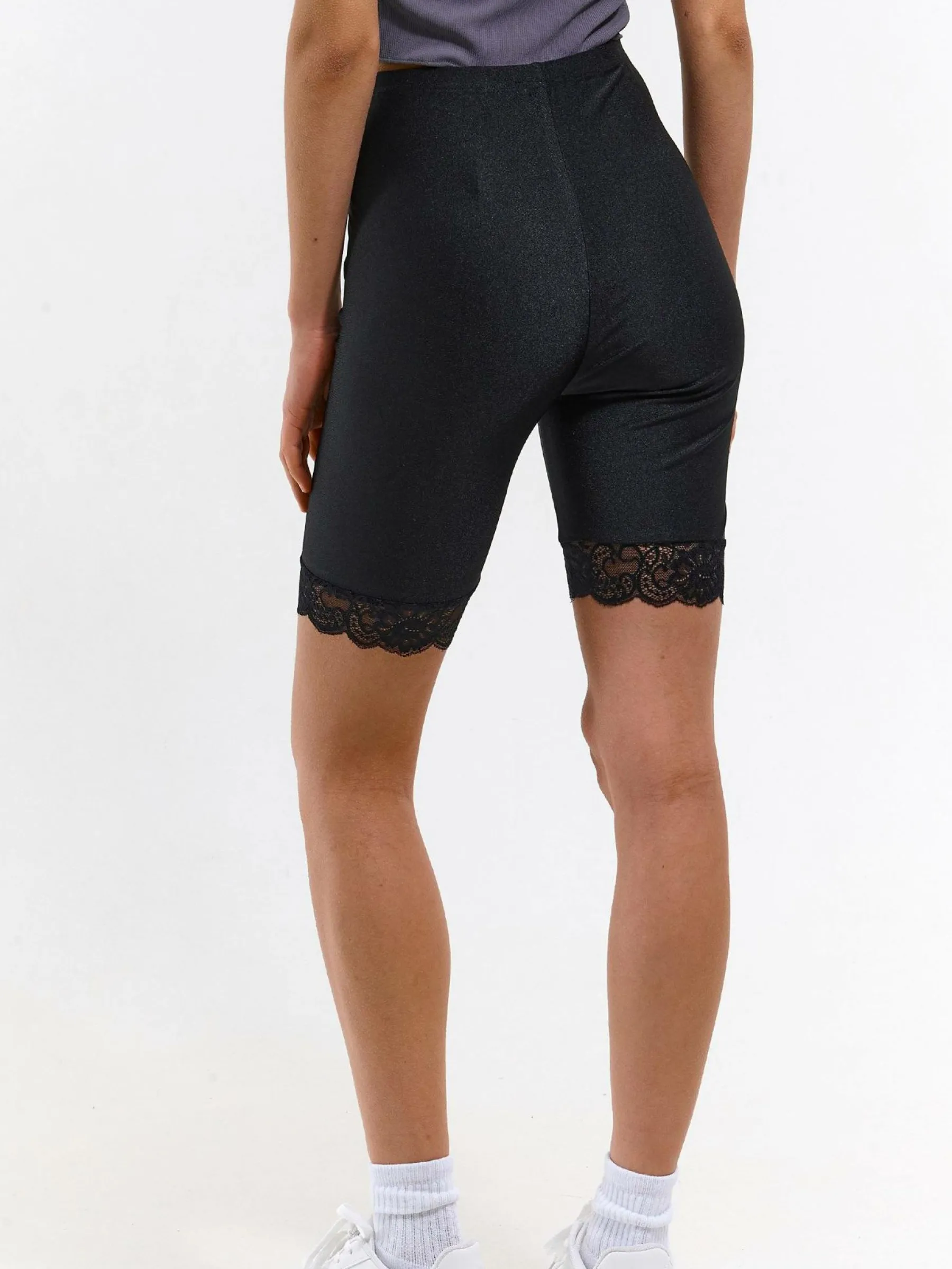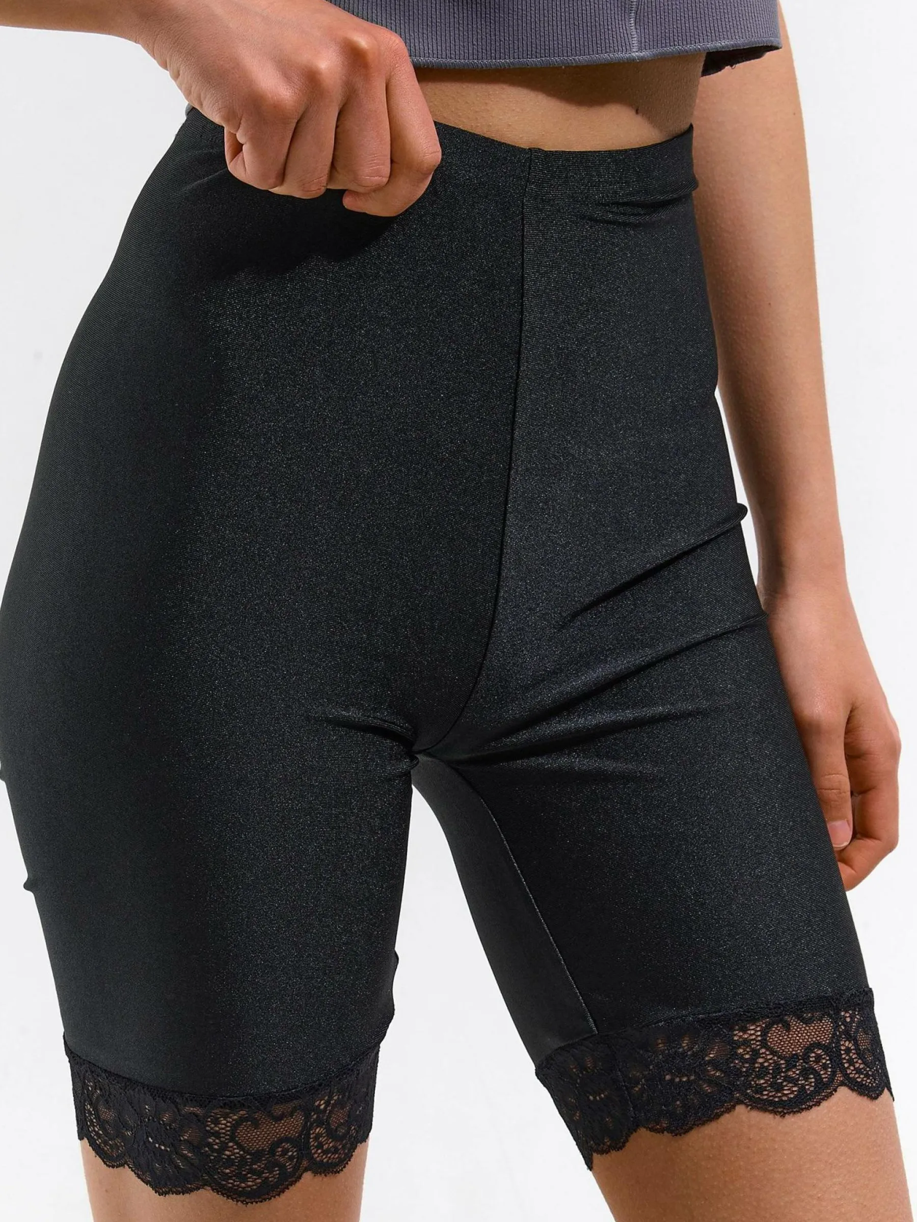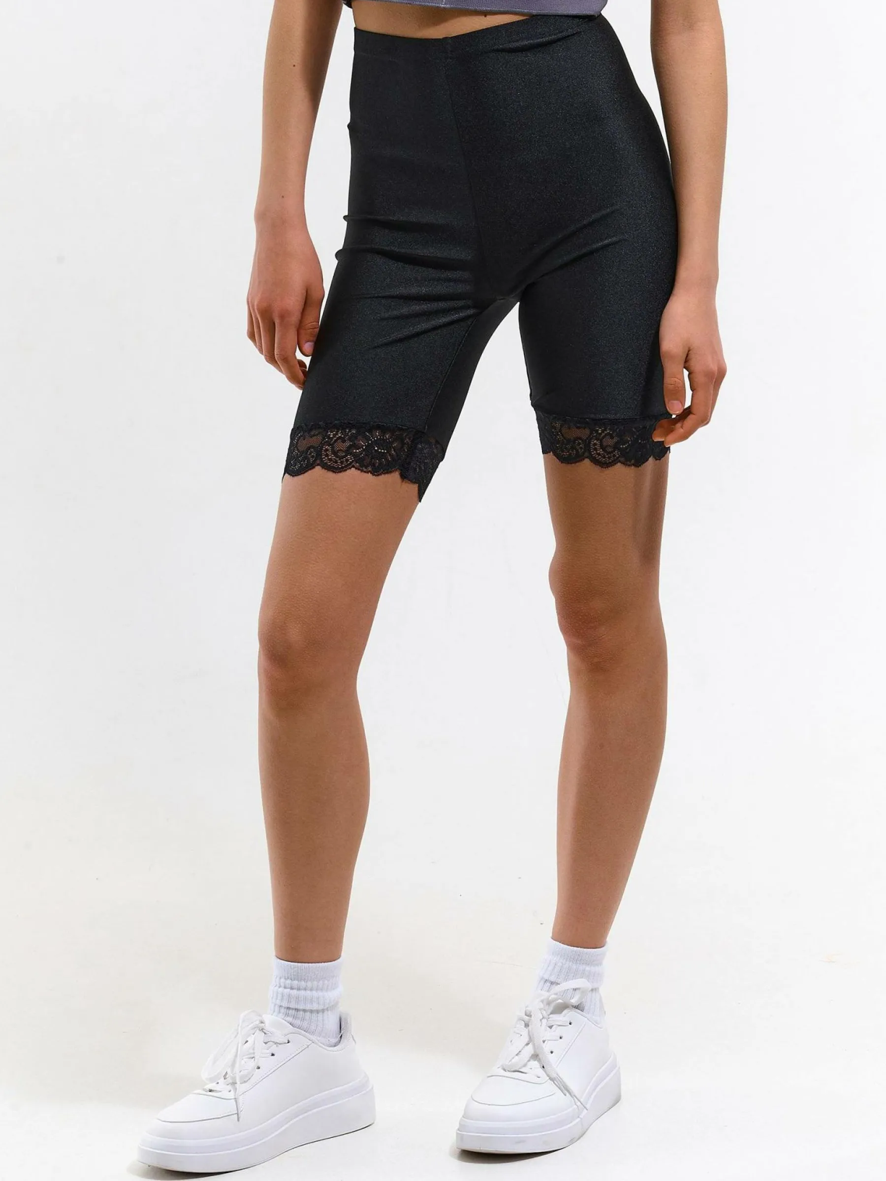 Kolor: czarnyKrój: bikerTyp: spodenkiDługość: krótkiPattern style: pojedynczy kolorDetal: z koronkąMateriał: synt…