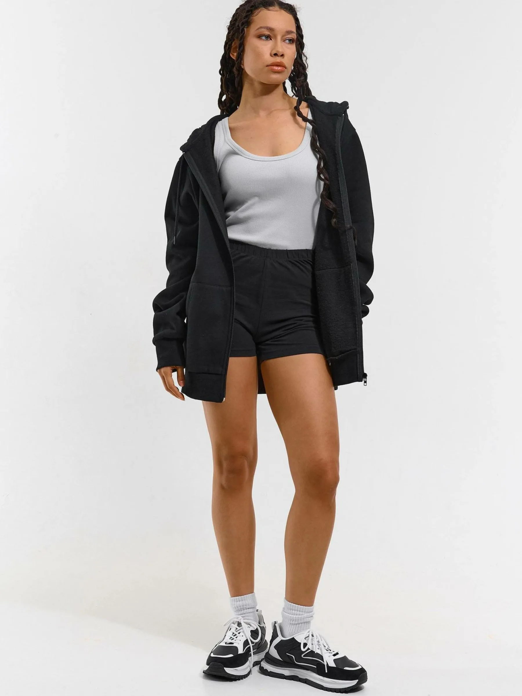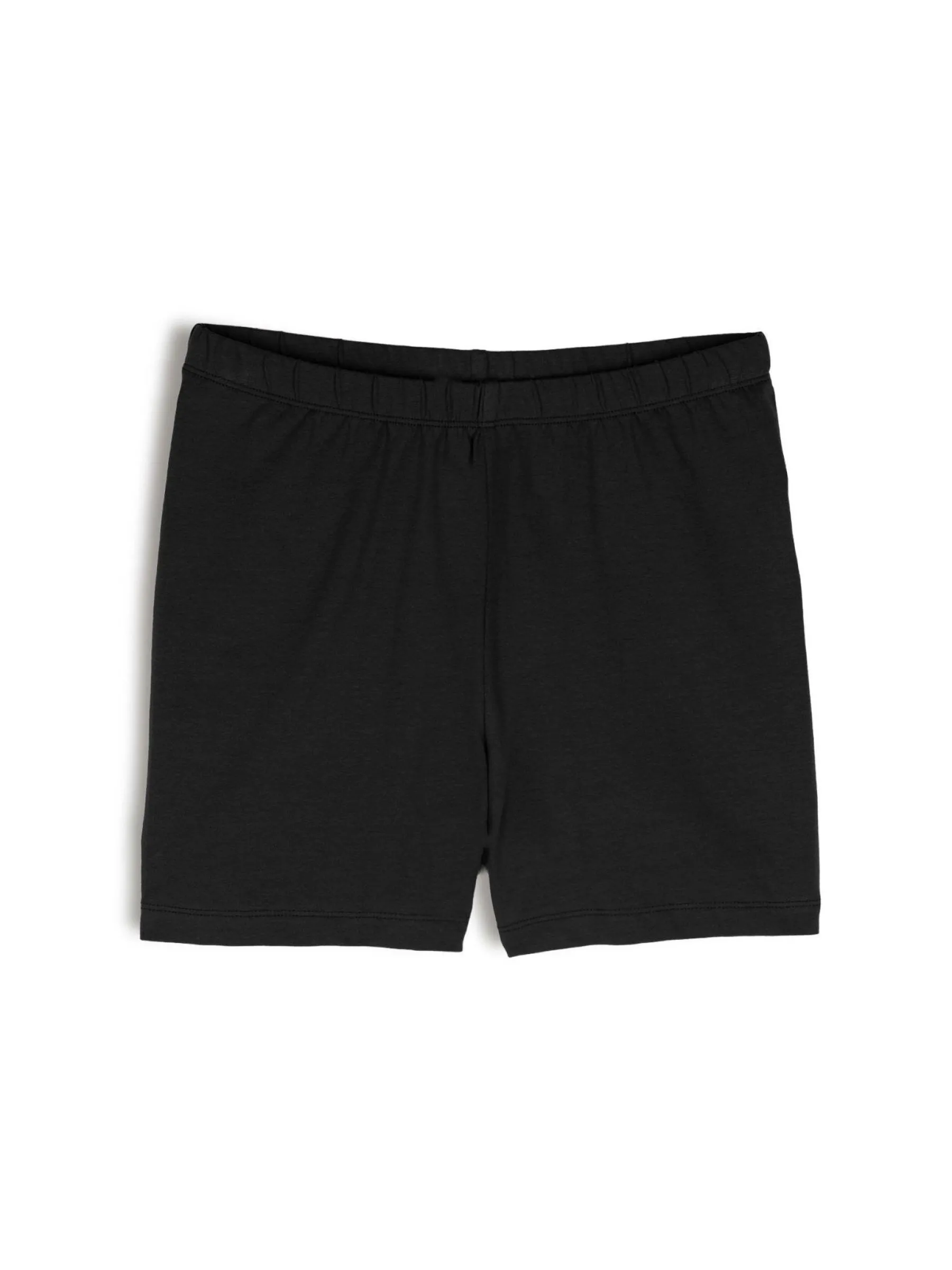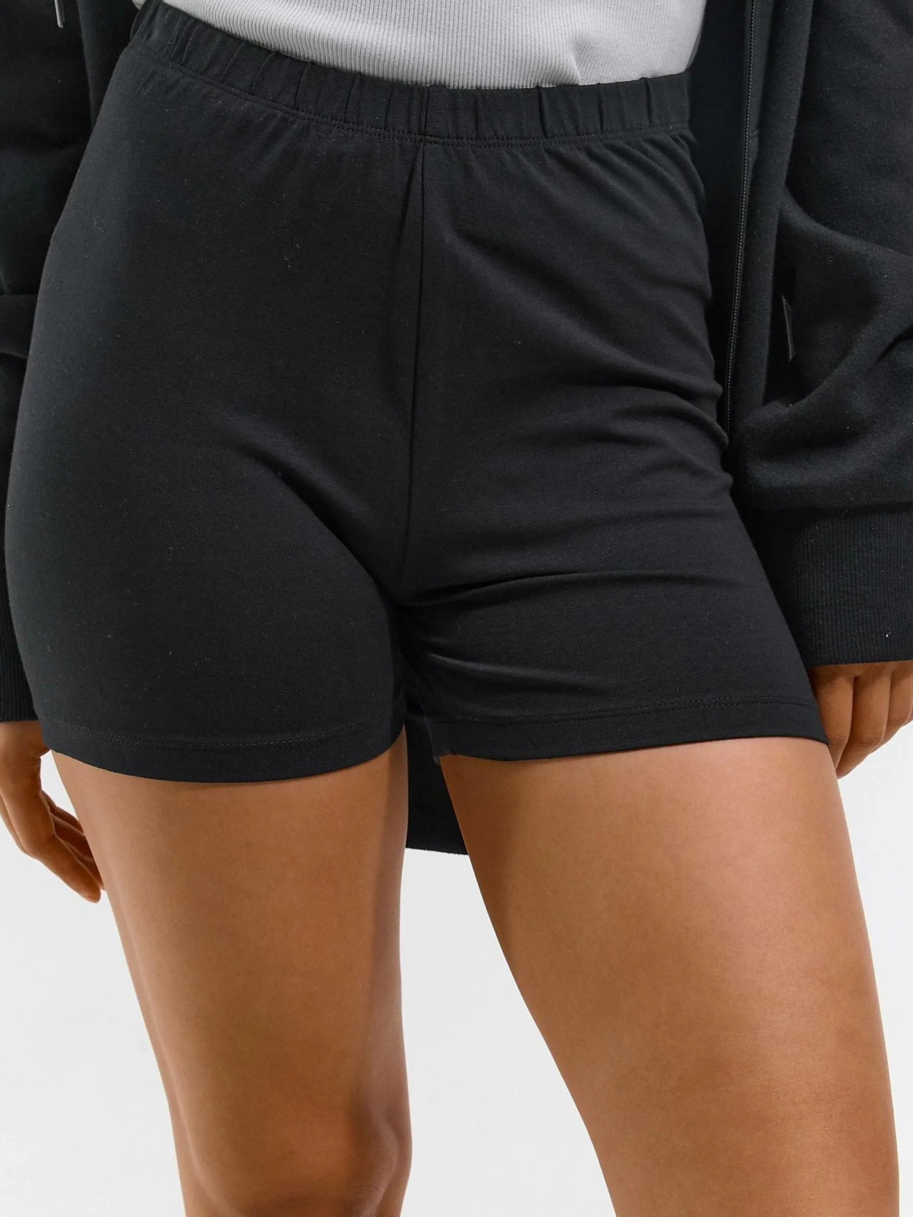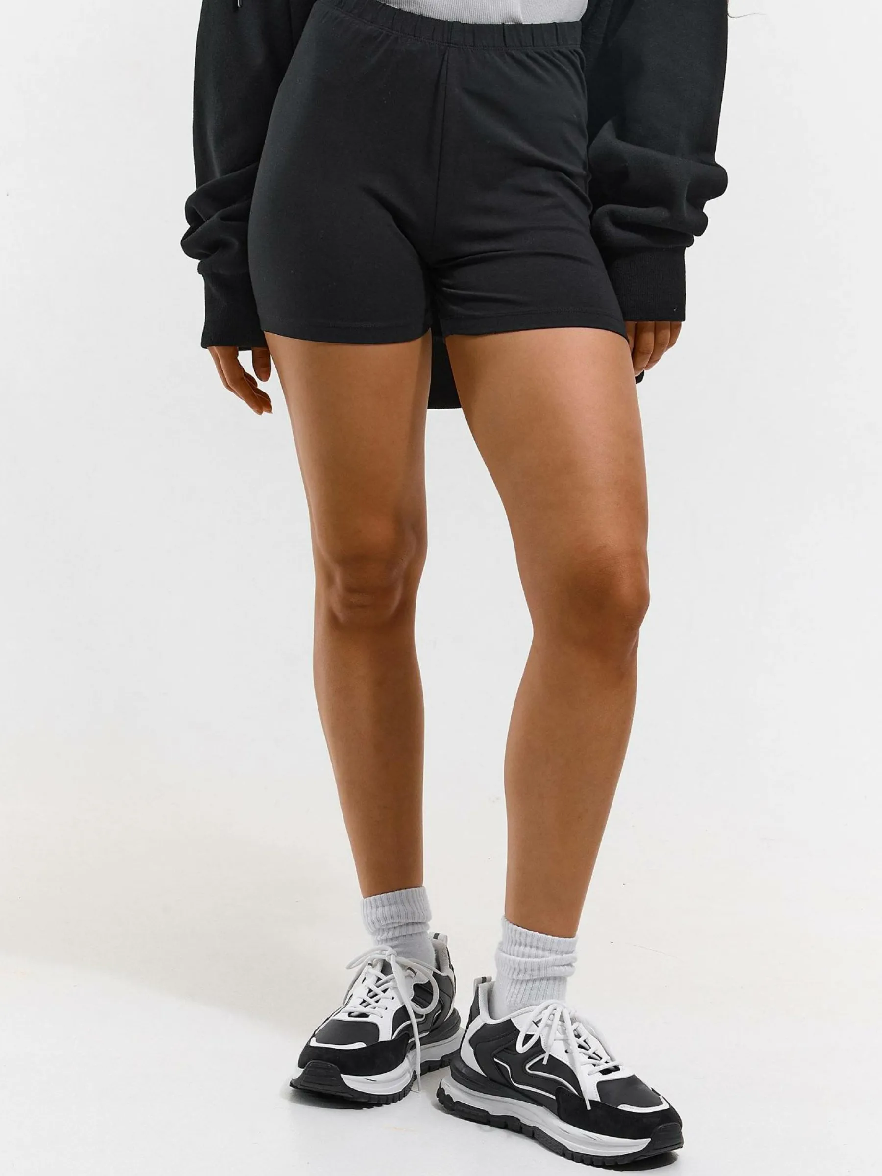 Kolor: czarnyKrój: bikerTyp: spodenkiDługość: krótkiPattern style: pojedynczy kolorMateriał: bawełnaPłeć: kobie…
