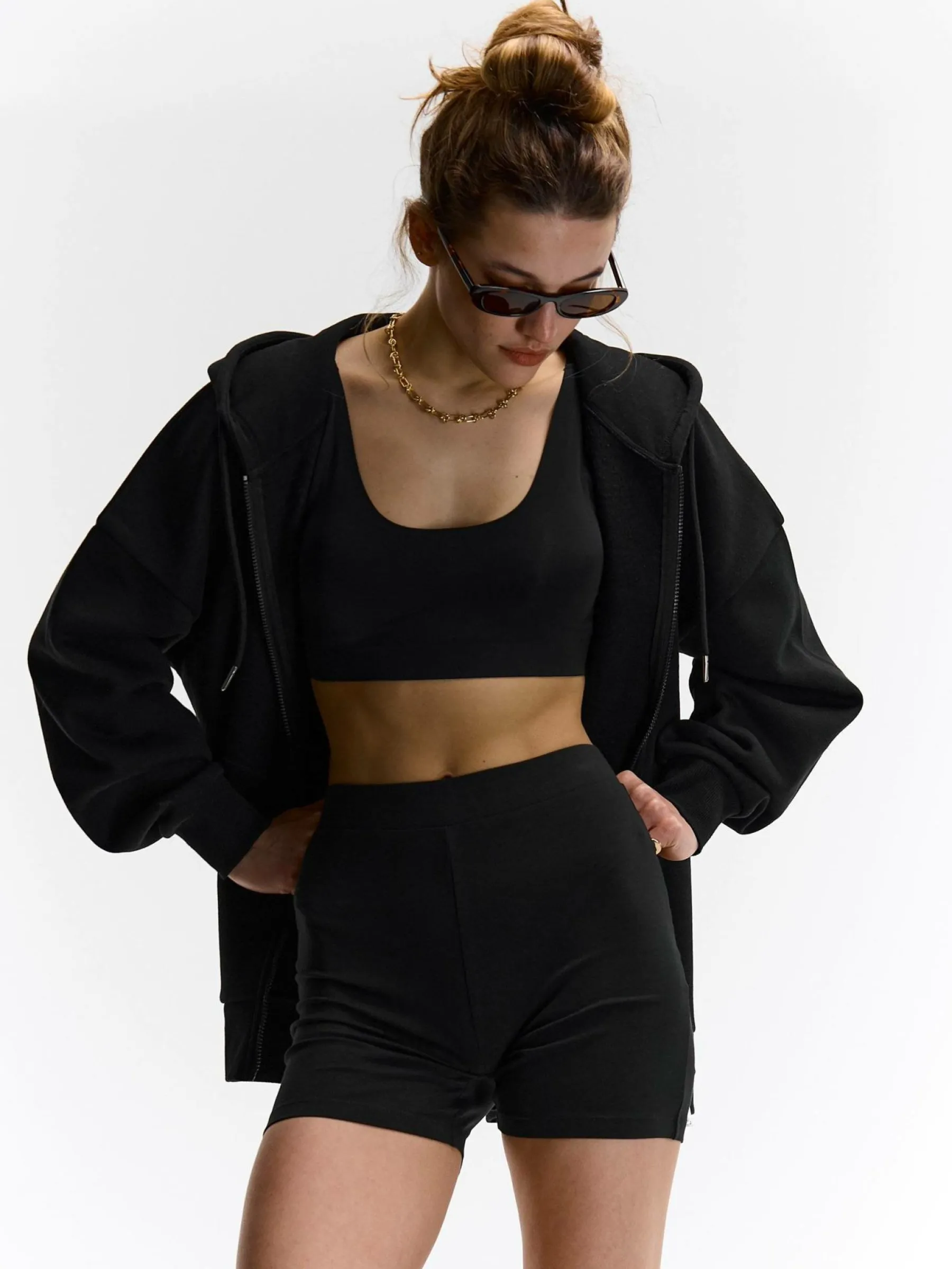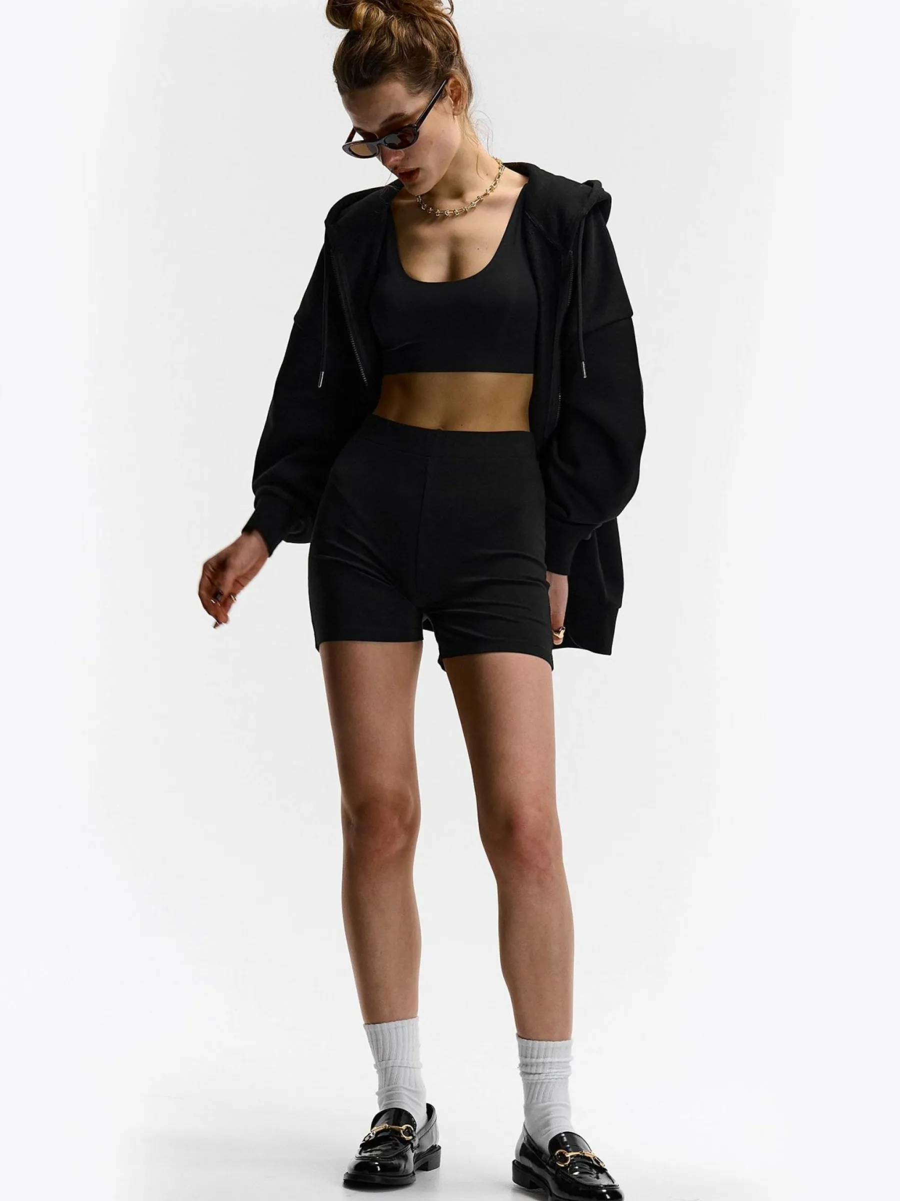 Kolor: czarnyKrój: bikerTyp: spodenkiDługość: krótkiPattern style: pojedynczy kolorDetal: z elastyczną opaskąMate…