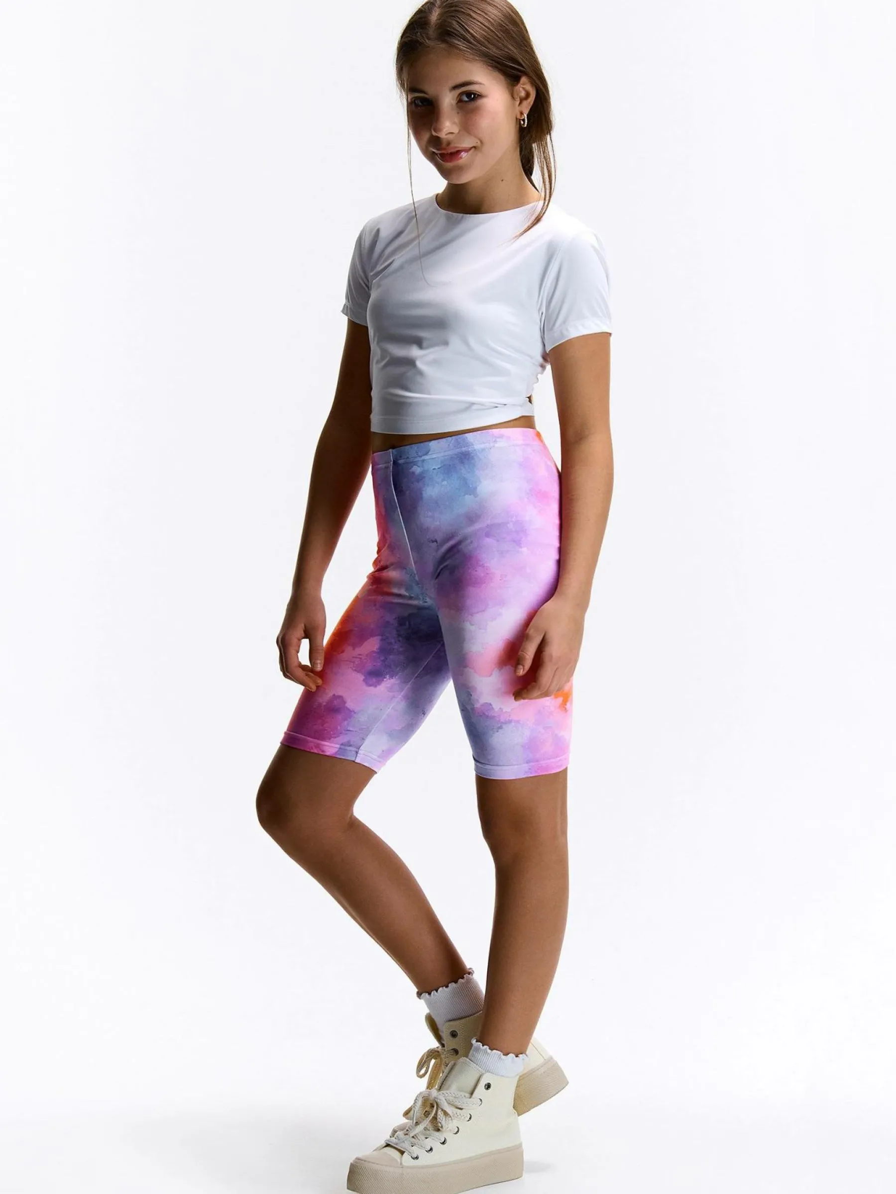 Kolor: różowyKrój: bikerTyp: spodenkiDługość: krótkiPattern style: tie dye, z nadrukiemDetal: z elastyczną opask…