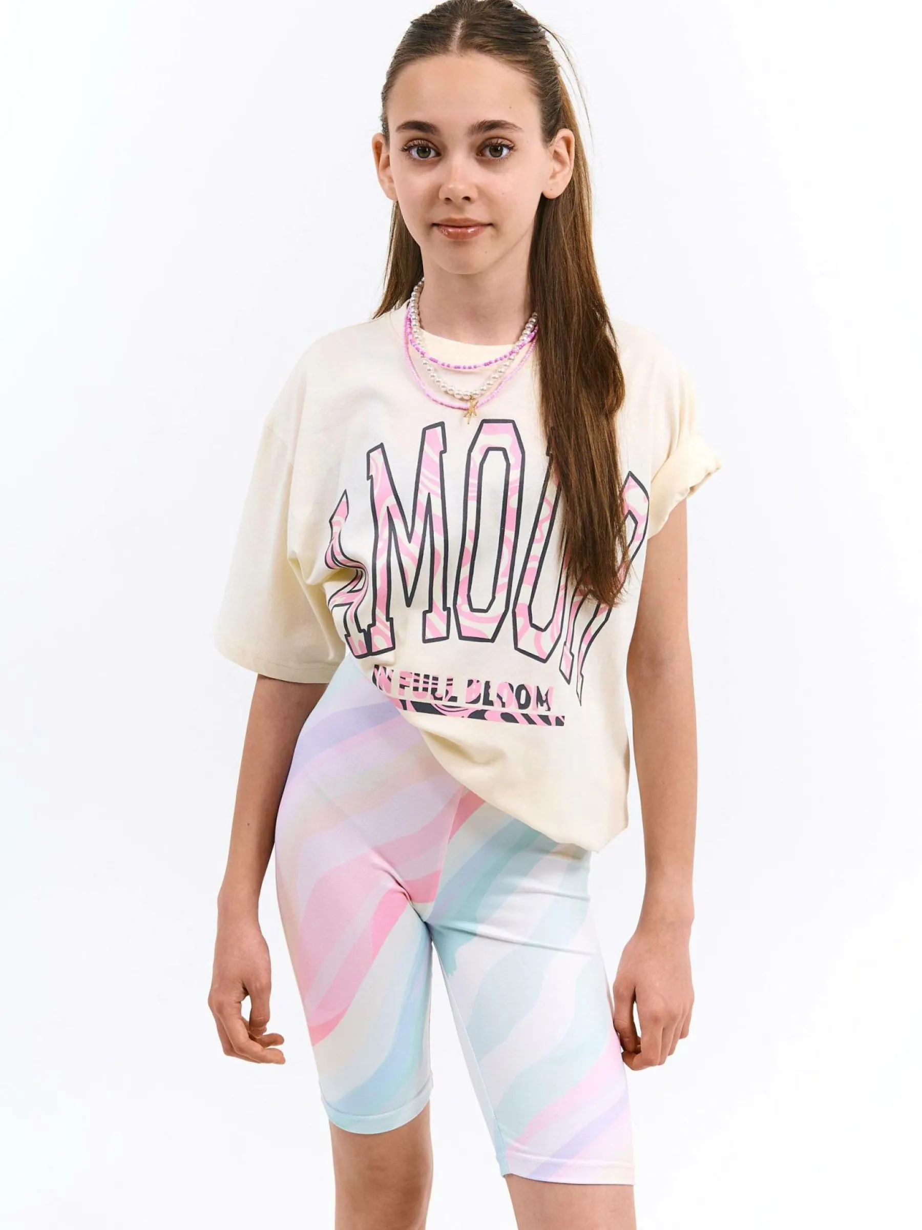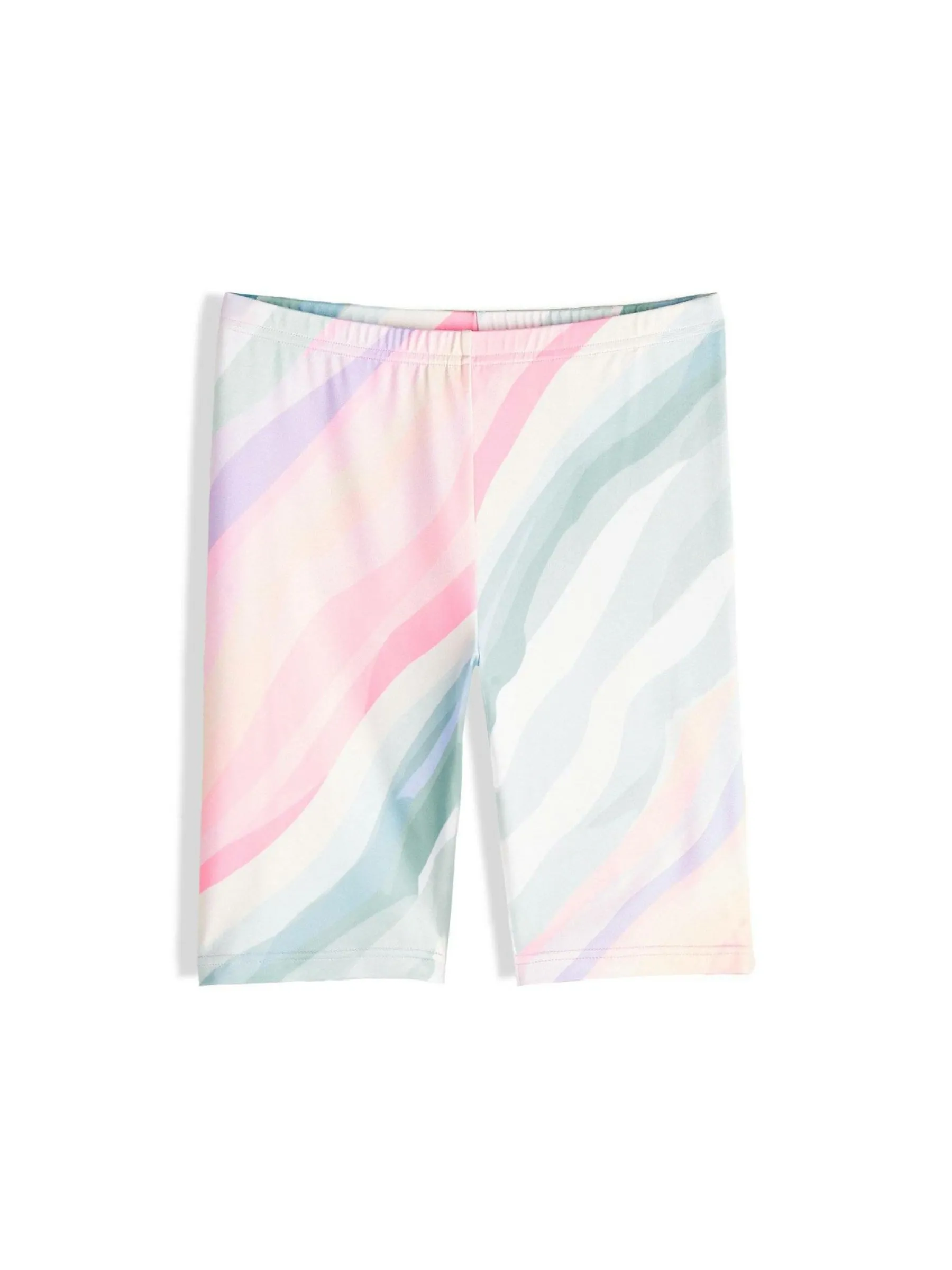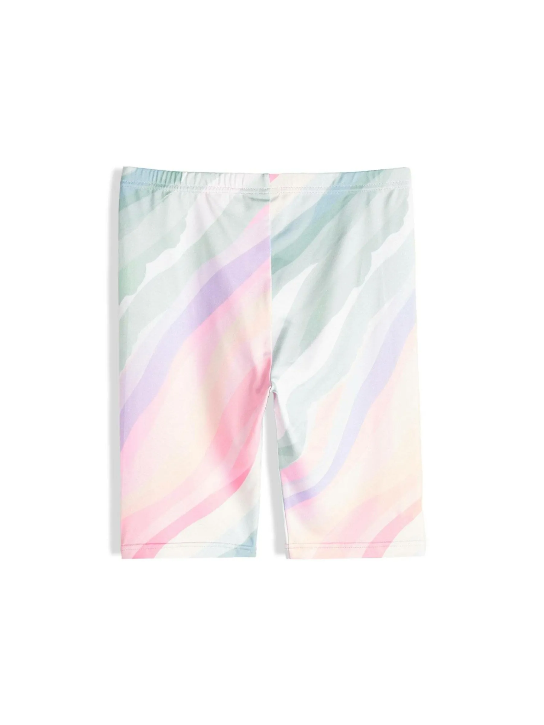 Kolor: różowyKrój: bikerTyp: spodenkiDługość: krótkiPattern style: wielobarwnyDetal: z elastyczną opaskąMateria…