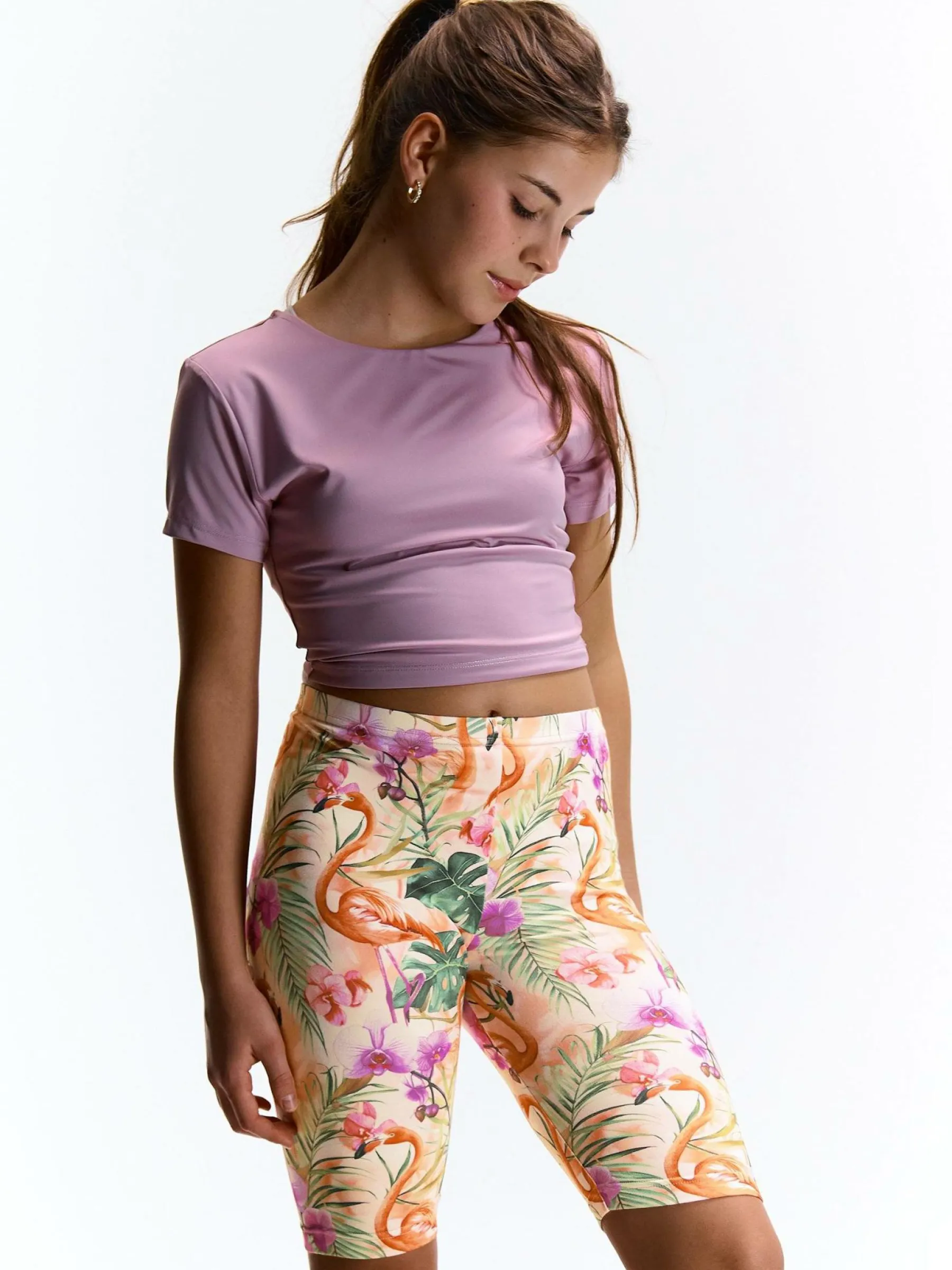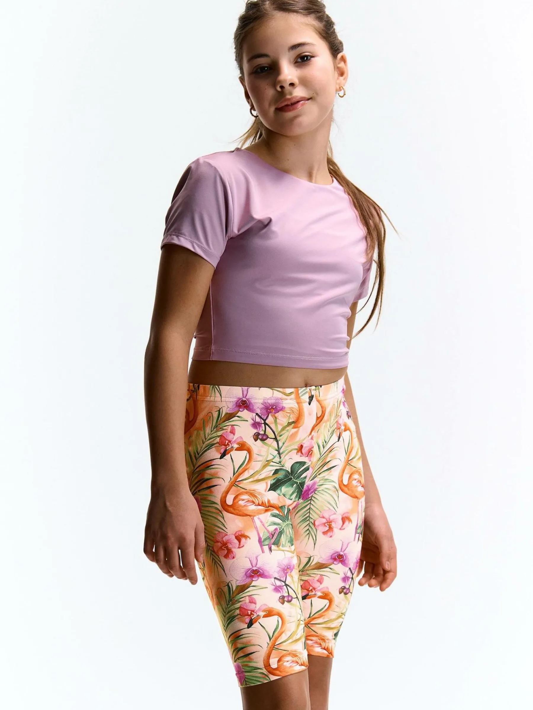 Kolor: różowyKrój: bikerTyp: spodenkiDługość: krótkiPattern style: kwiatoweDetal: z elastyczną opaskąMateriał:…