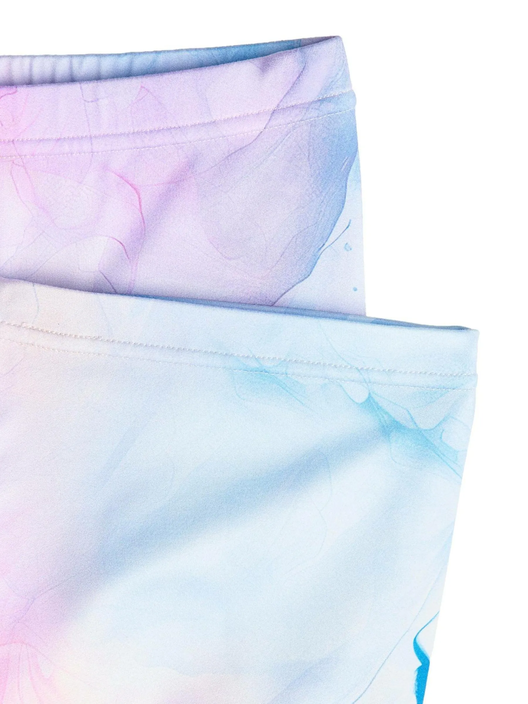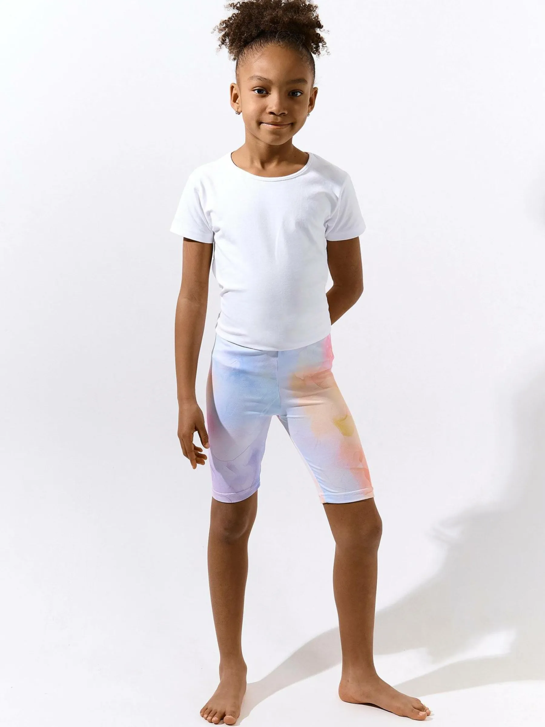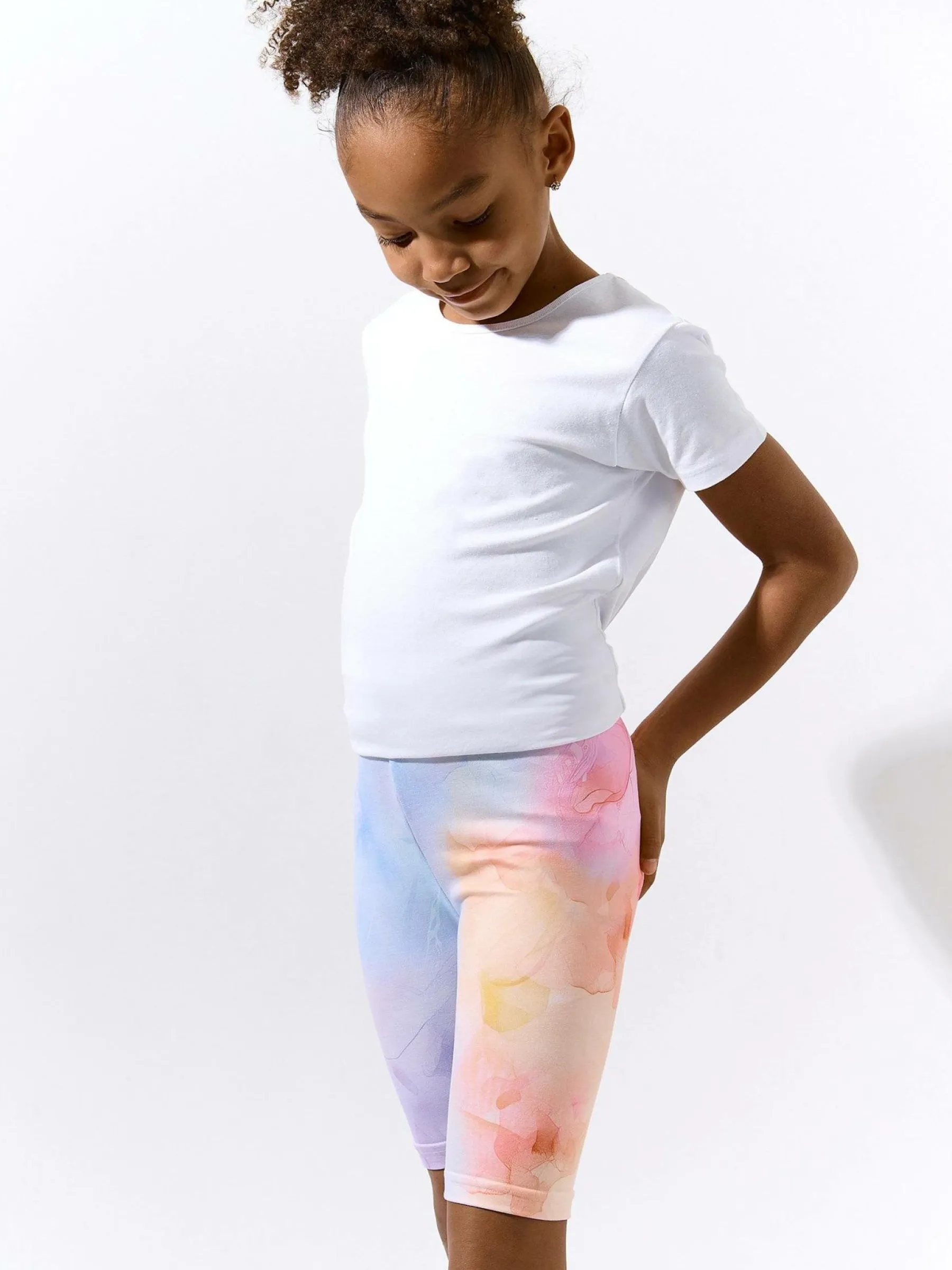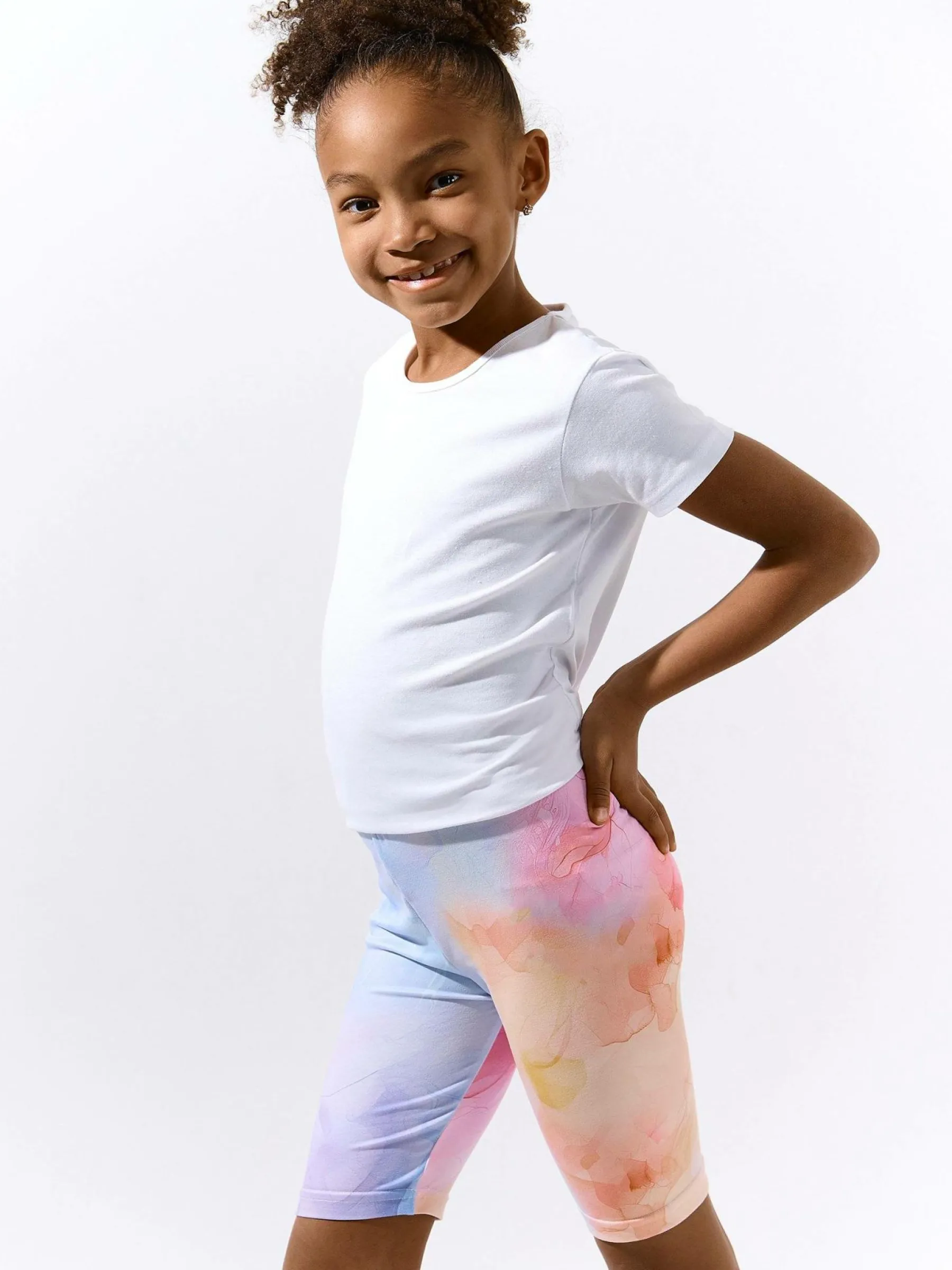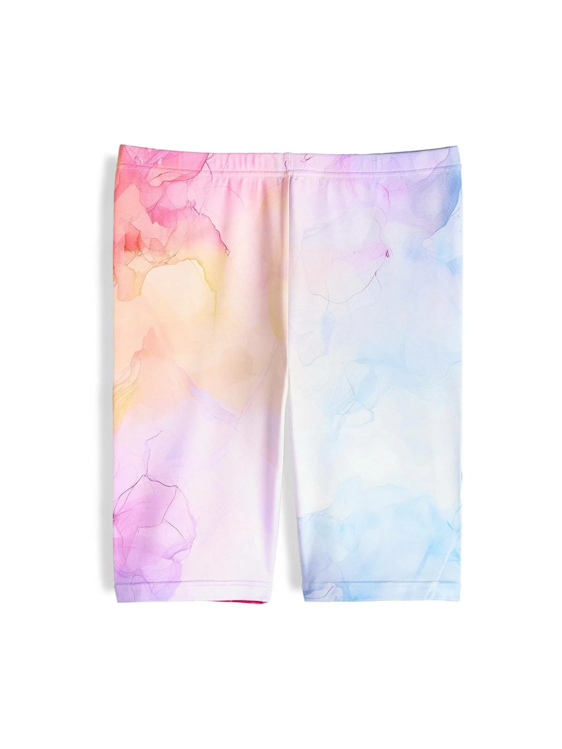 Kolor: różowyKrój: bikerTyp: spodenkiDługość: krótkiPattern style: tie dye, wielobarwnyDetal: z elastyczną opask…