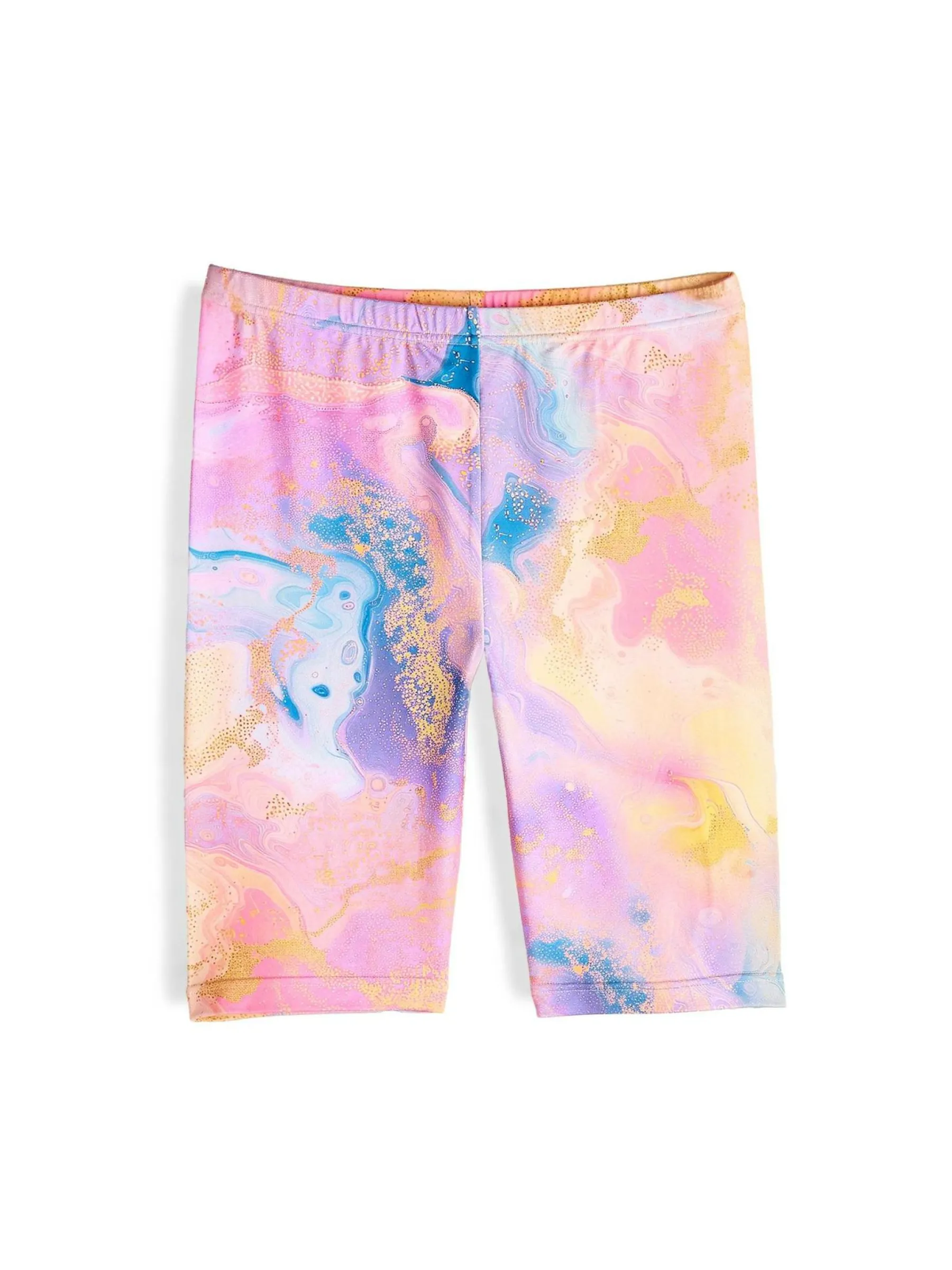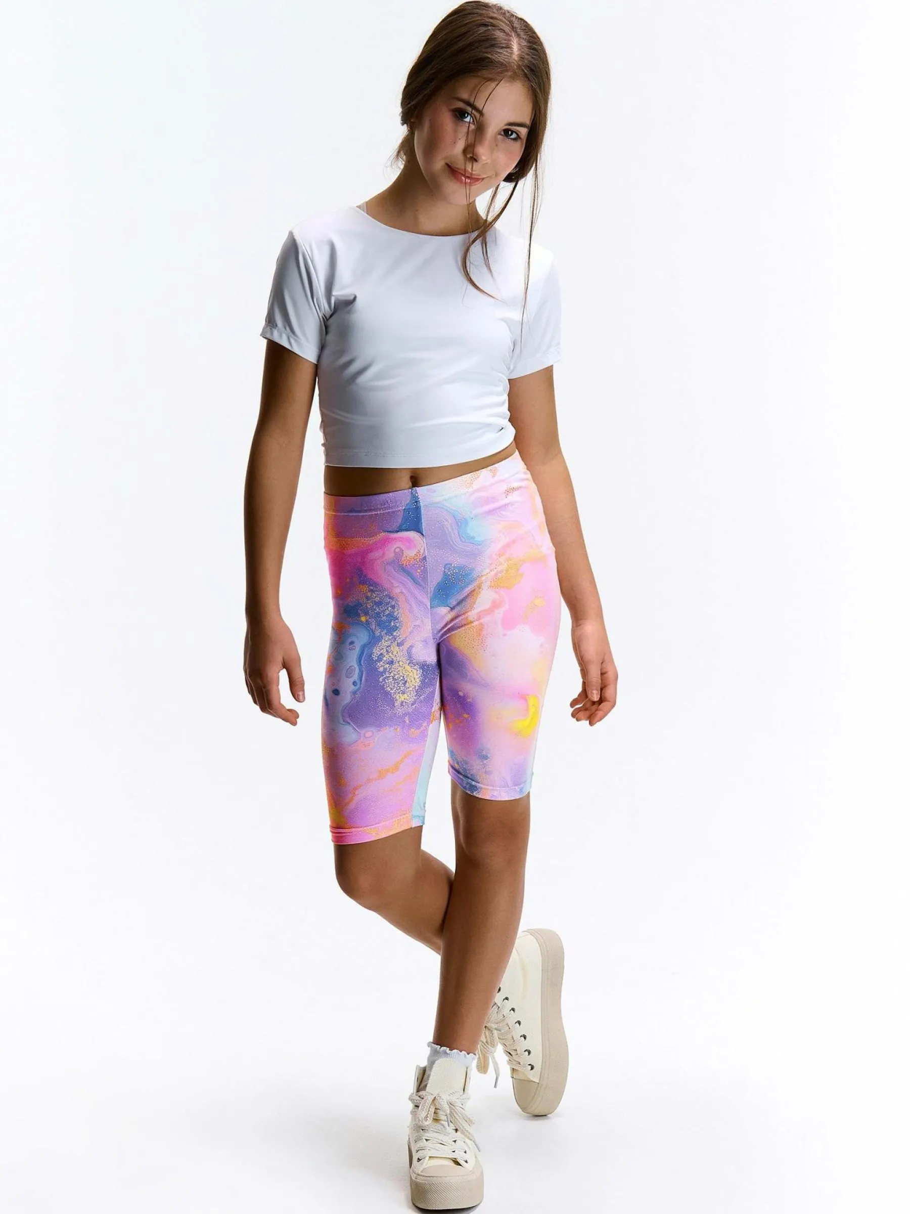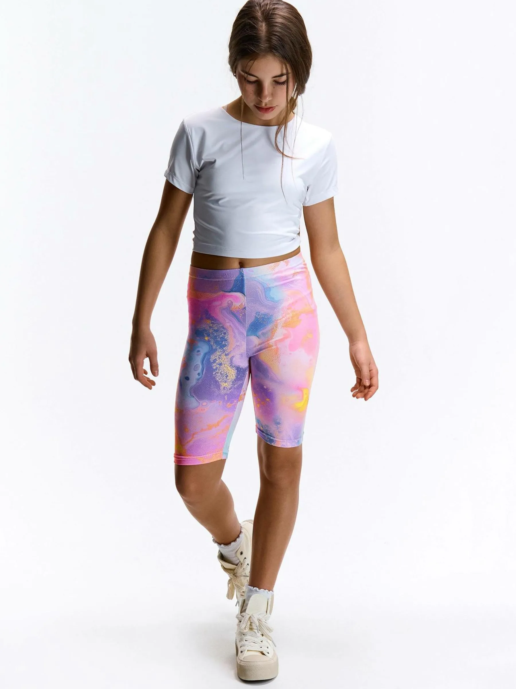 Kolor: różowyKrój: bikerTyp: spodenkiDługość: krótkiPattern style: tie dyeDetal: z elastyczną opaskąMateriał: …