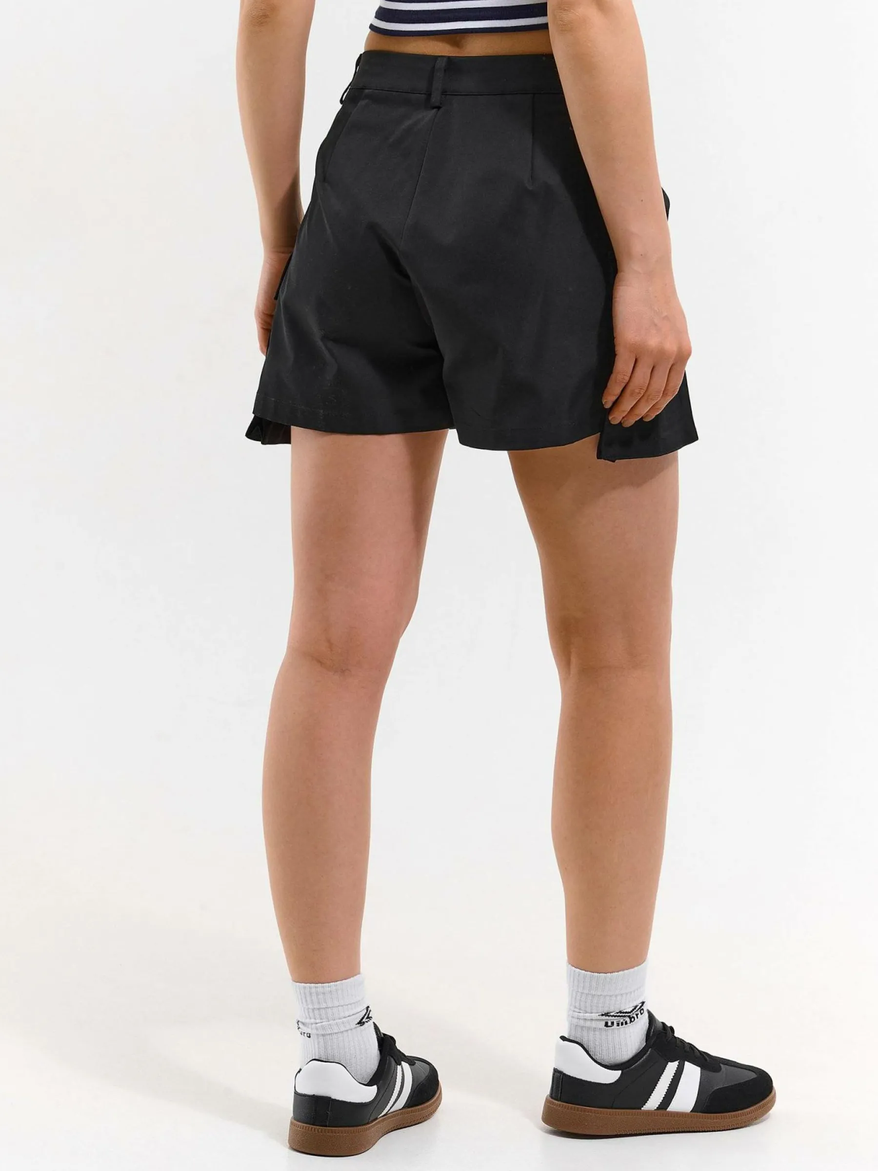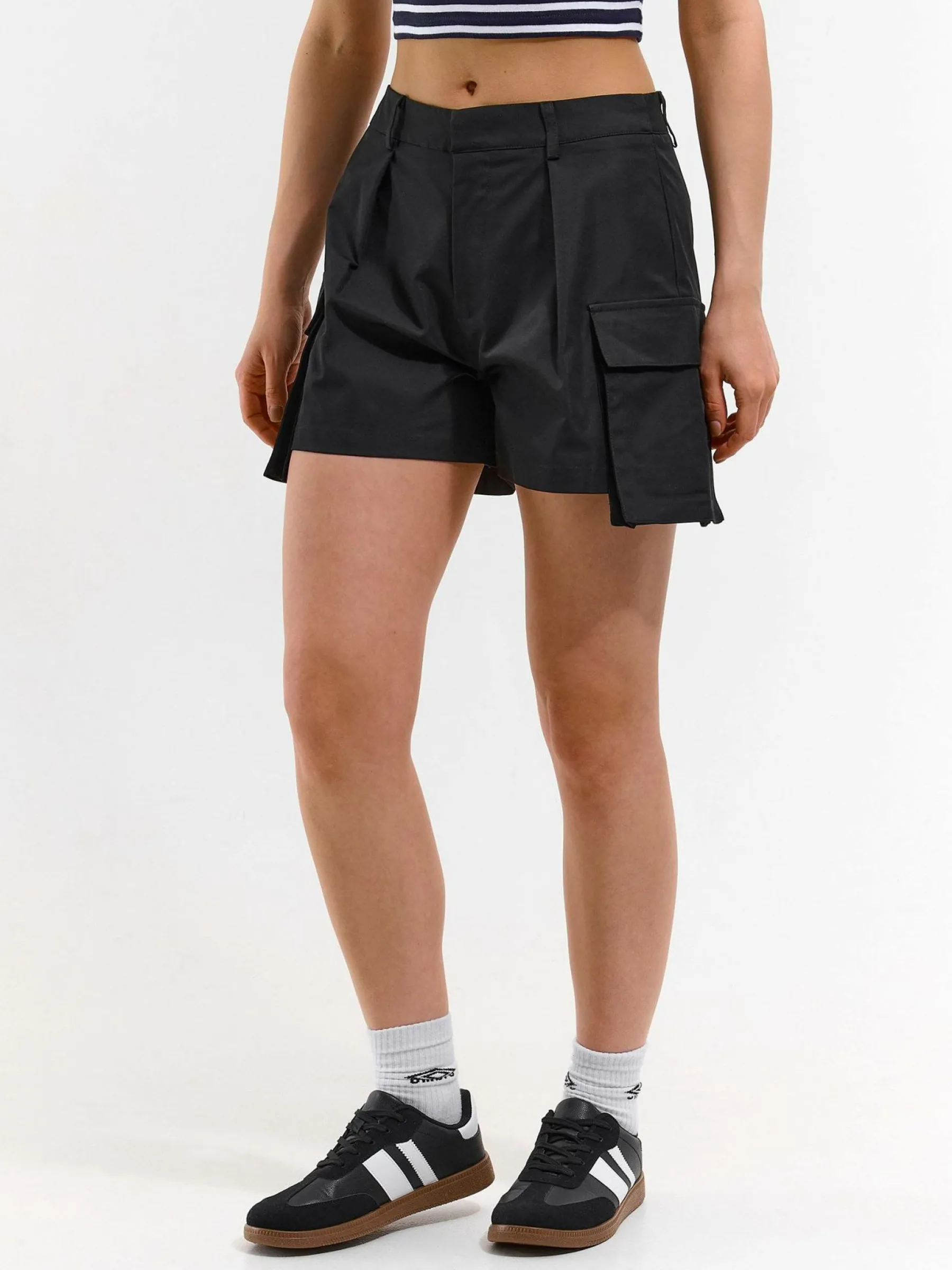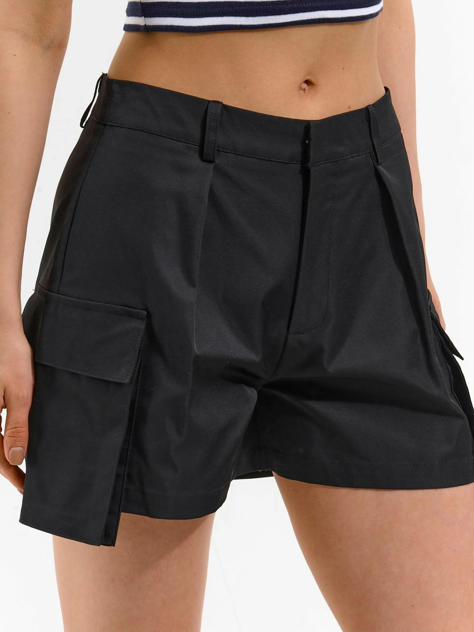 Kolor: czarnyKrój: cargoTyp: spodenkiDługość: krótkiPattern style: pojedynczy kolorDetal: z kieszeniamiMateriał: s…