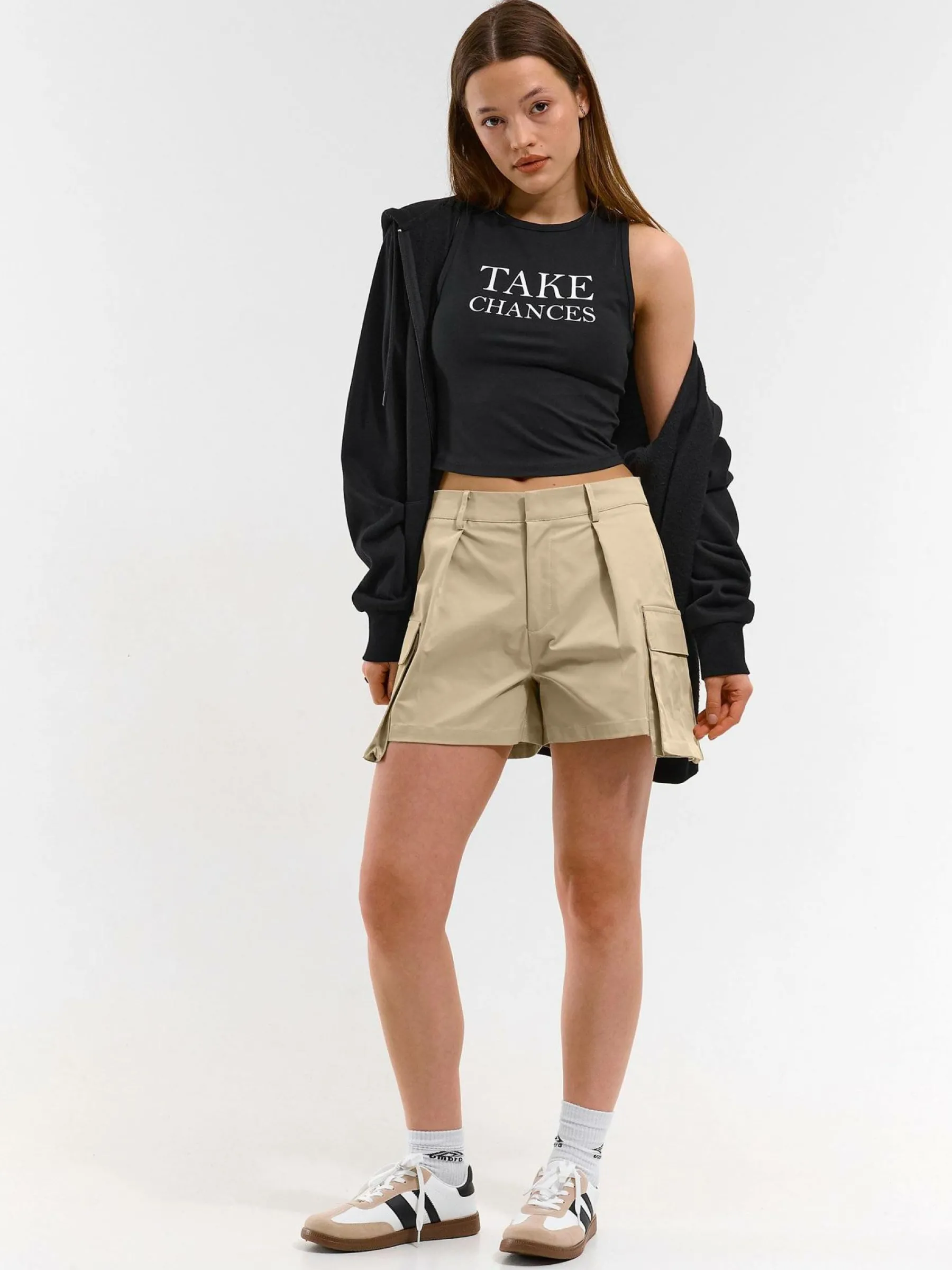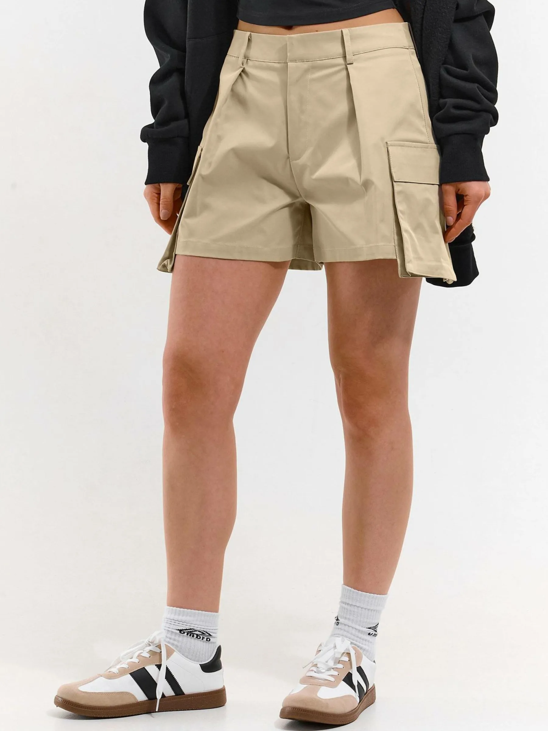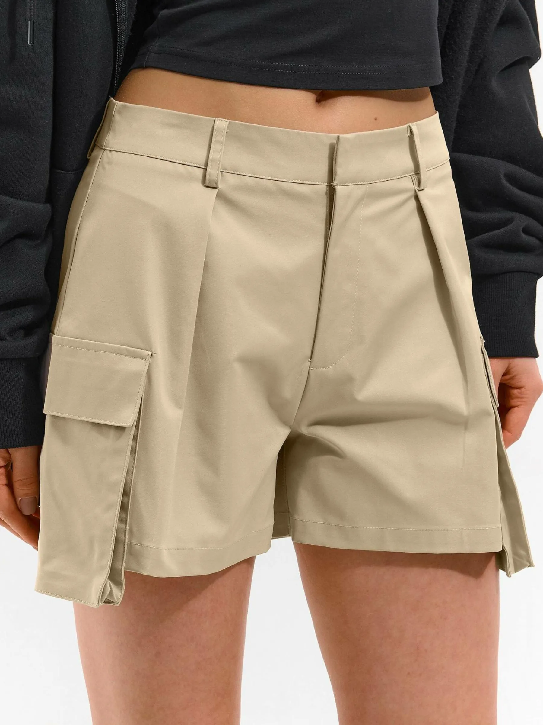 Kolor: beżowyKrój: cargoTyp: spodenkiDługość: krótkiPattern style: pojedynczy kolorDetal: na zamekMateriał: synte…