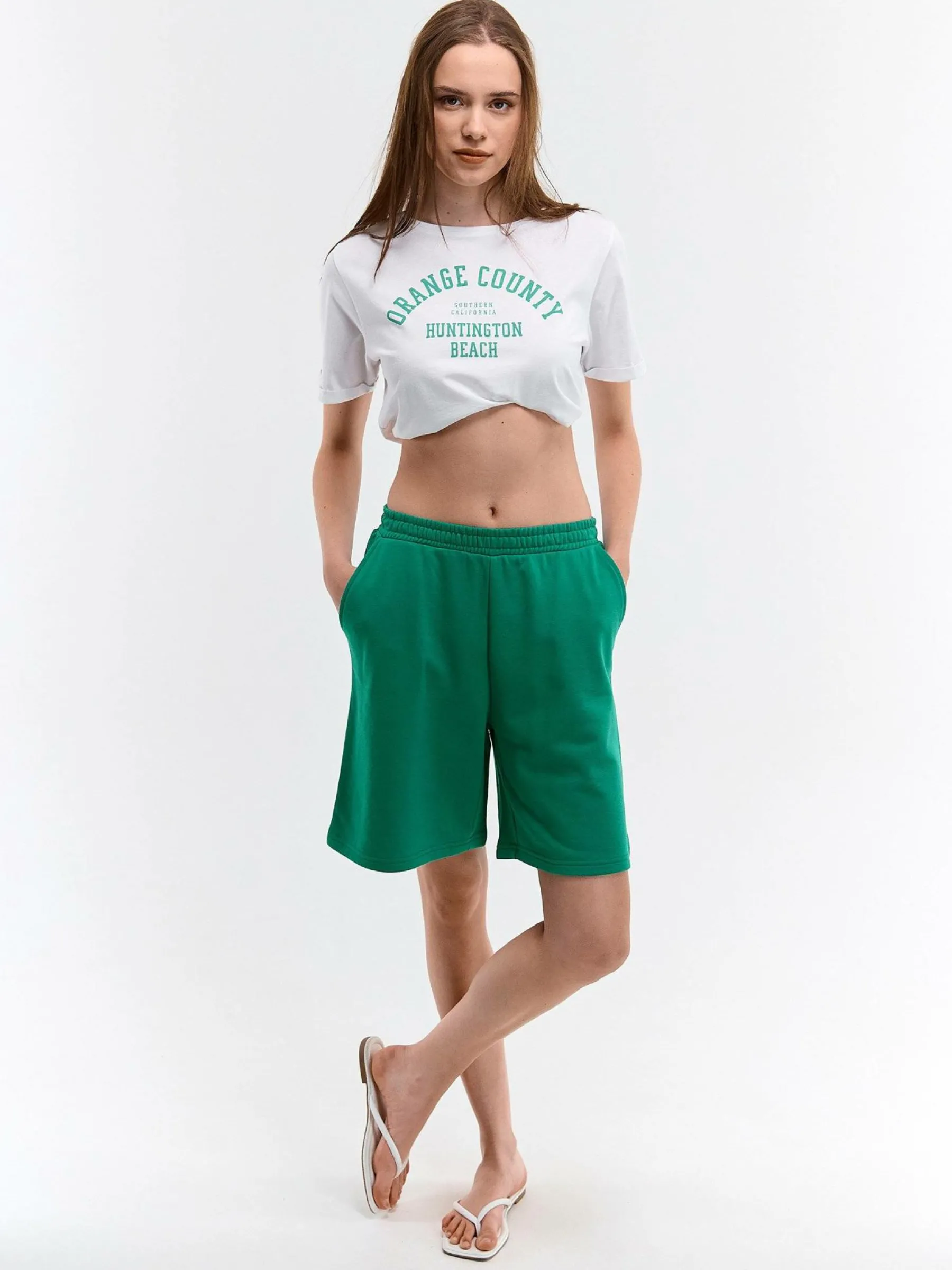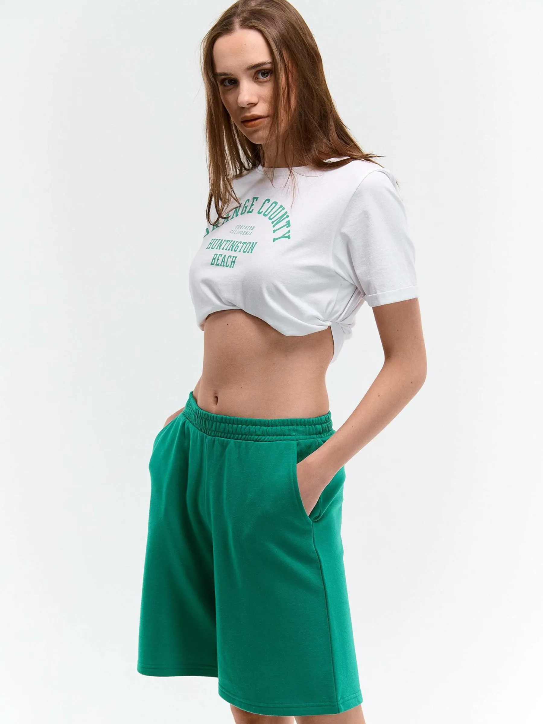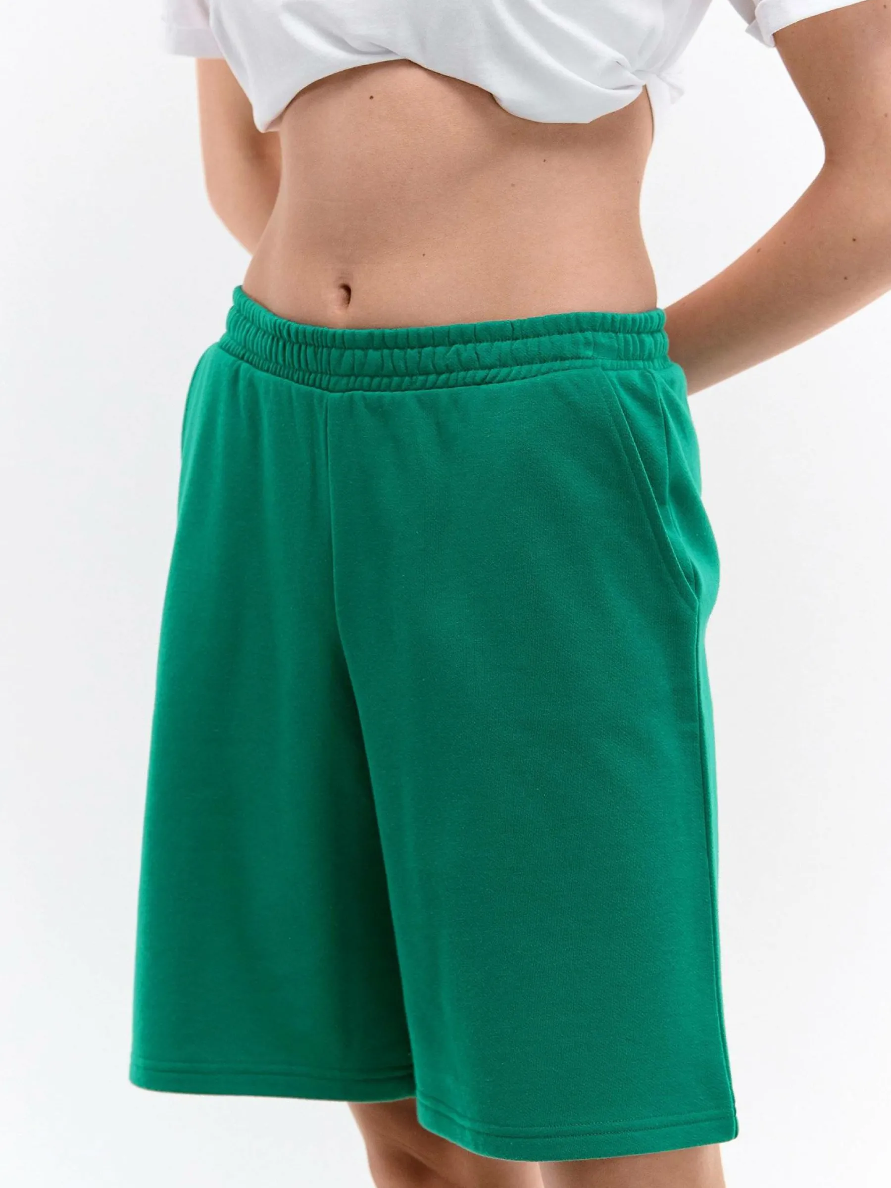 Kolor: zielonyKrój: regularTyp: spodenkiDługość: krótkiPattern style: pojedynczy kolorDetal: z elastyczną opaską,…
