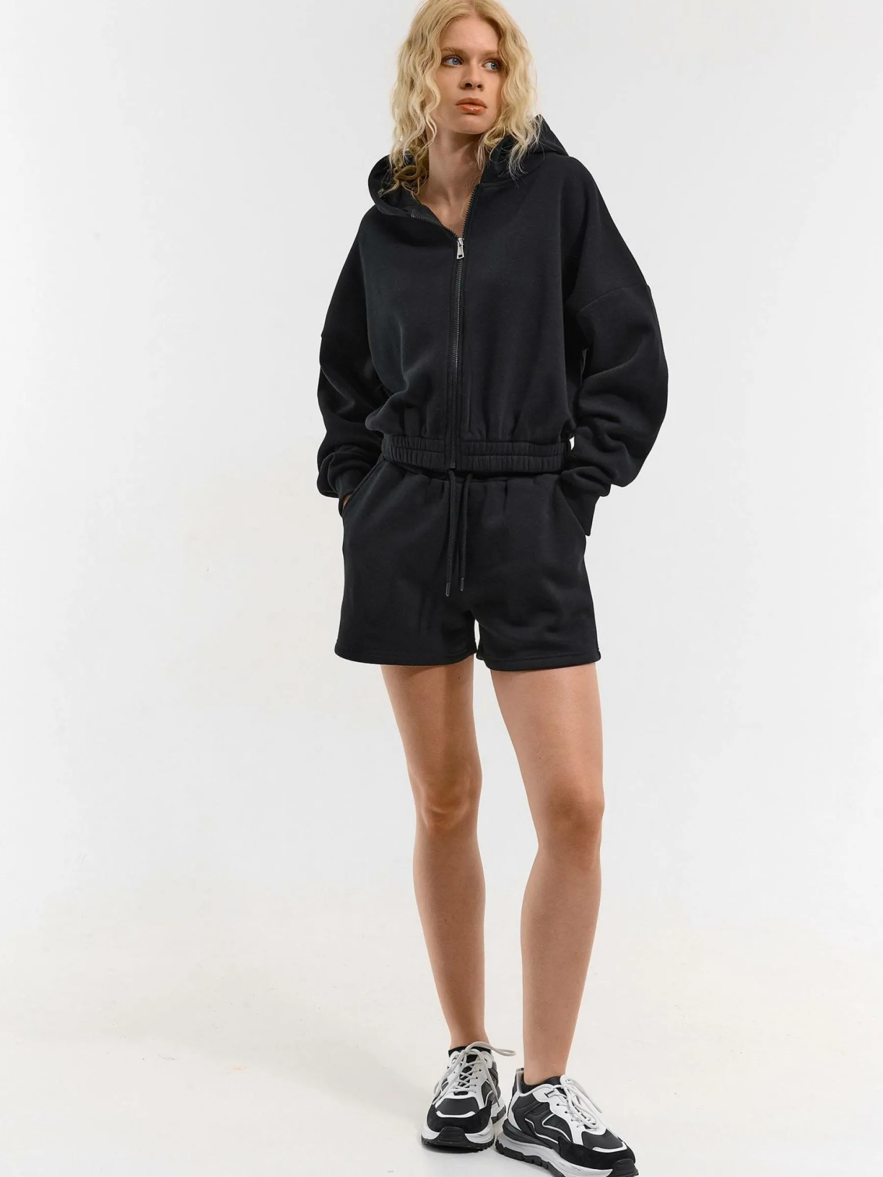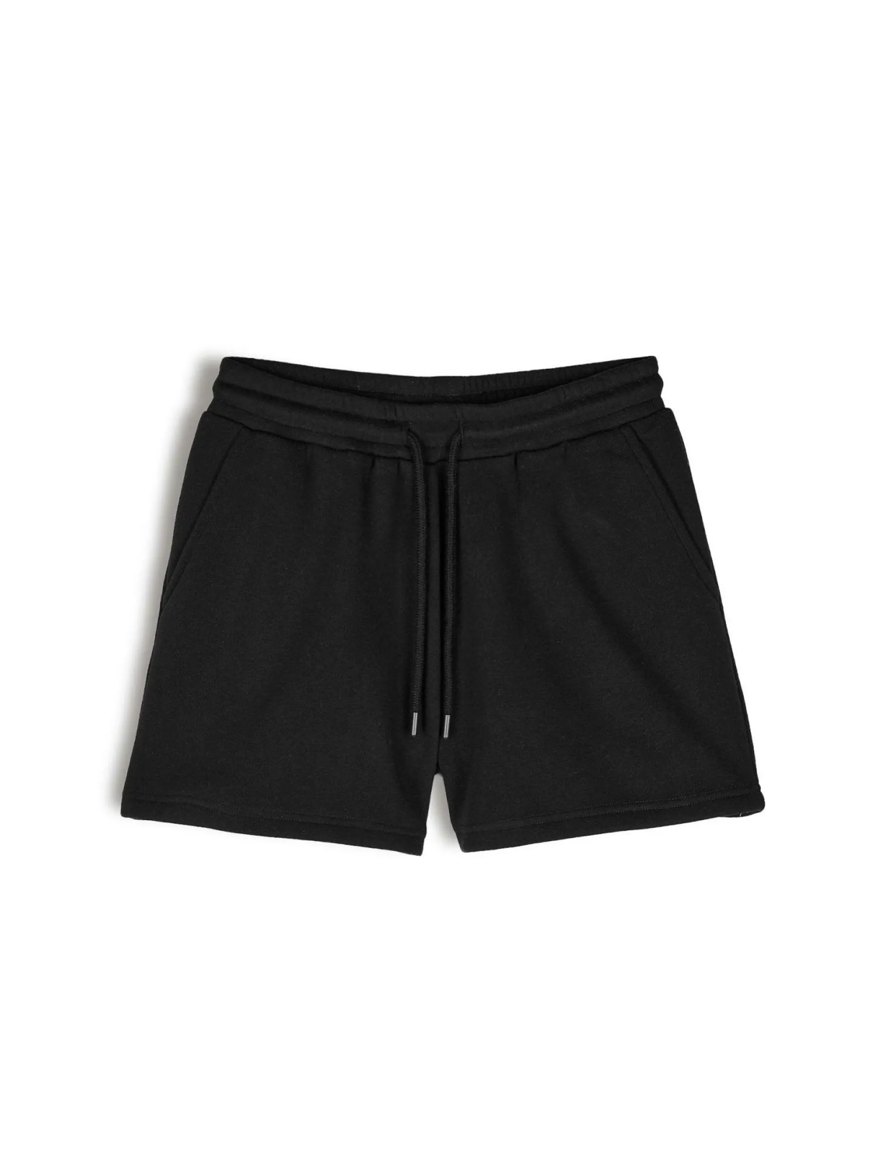 Kolor: czarnyKrój: straightTyp: spodenkiDługość: krótkiPattern style: pojedynczy kolorDetal: ze sznurowaniem, z kie…