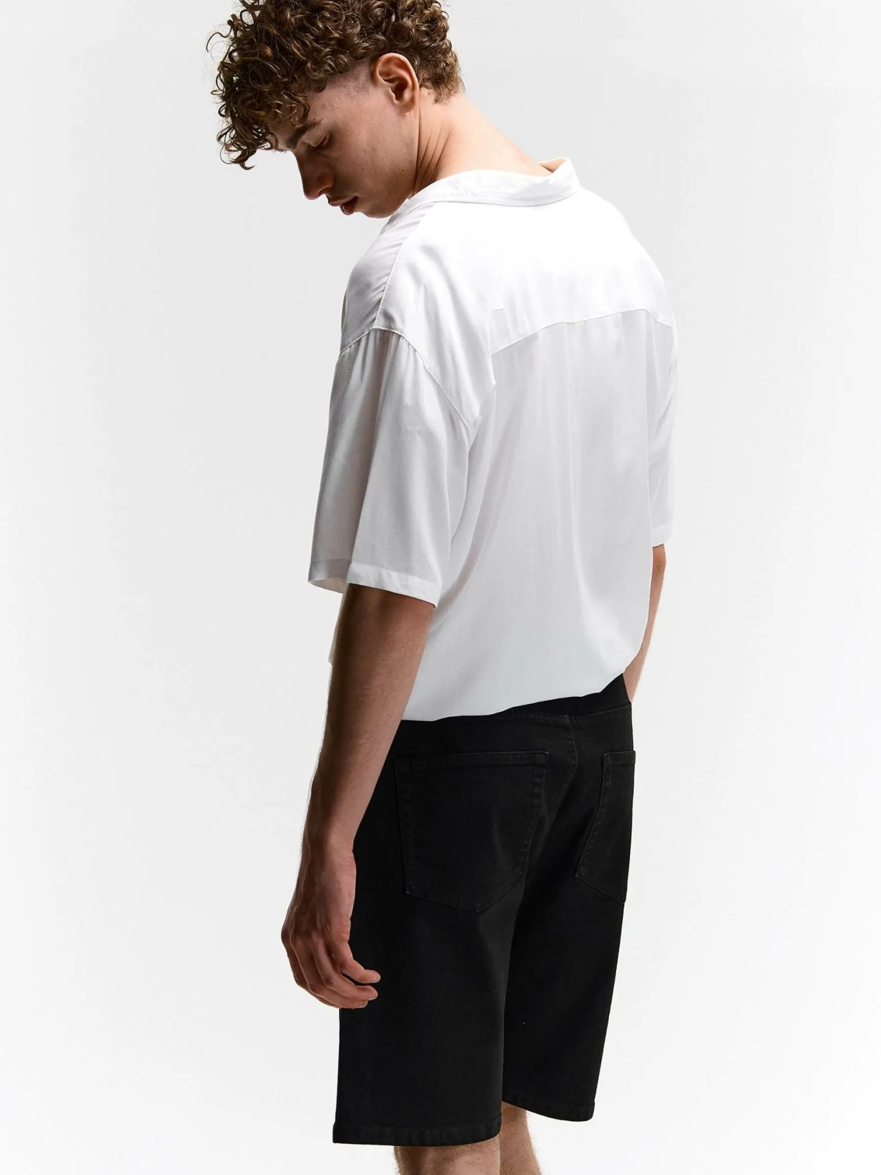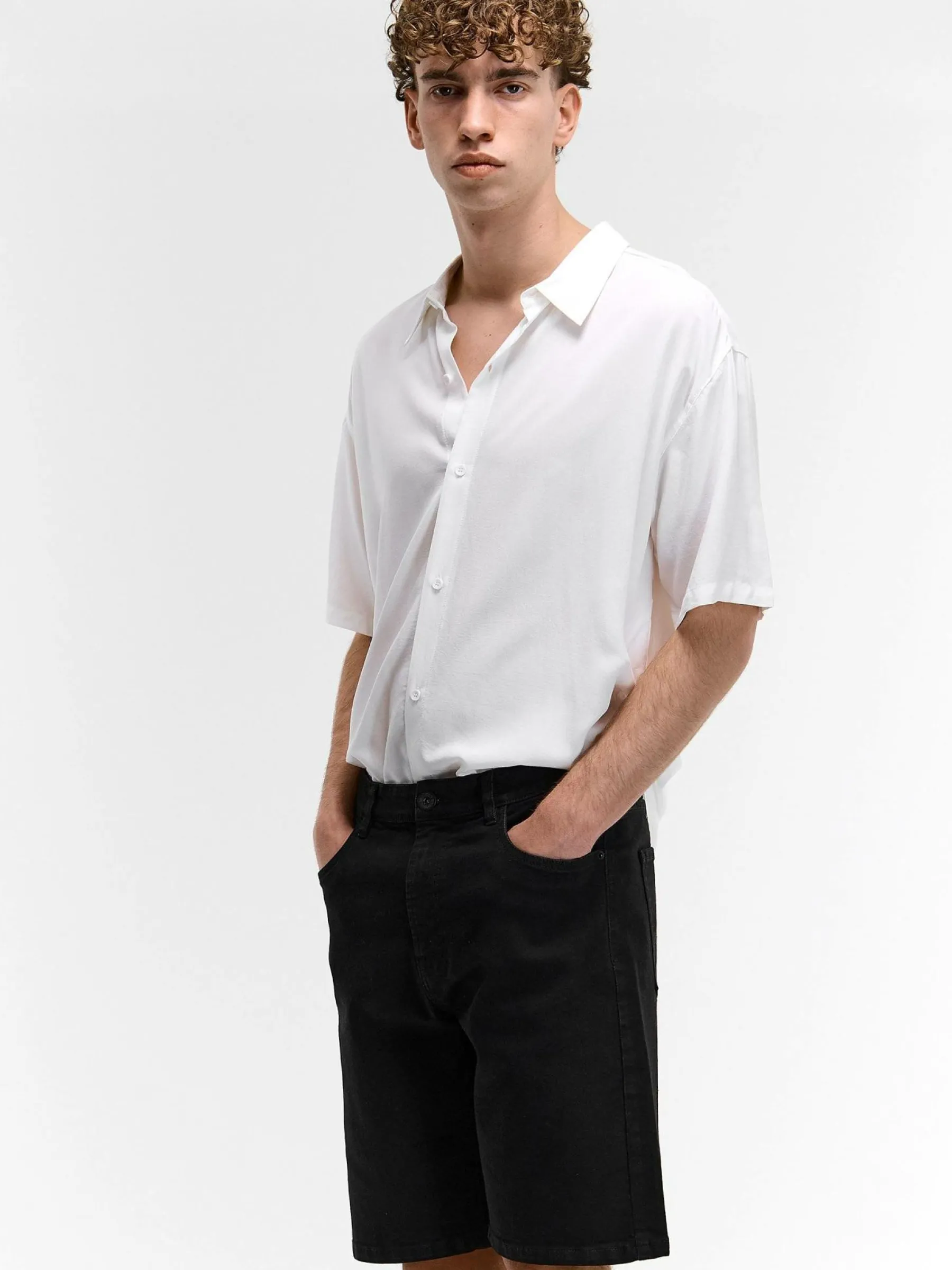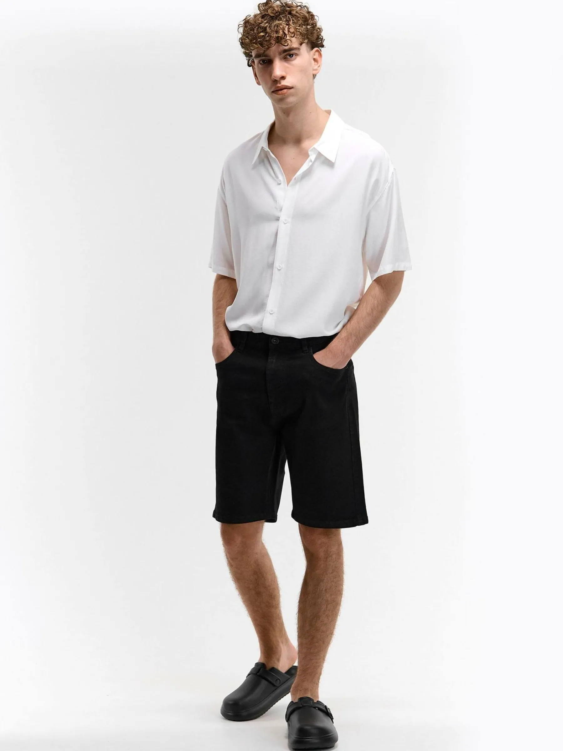 Kolor: czarnyKrój: straightTyp: spodenkiDługość: krótkiPattern style: pojedynczy kolorDetal: na zamek, z kieszeniam…