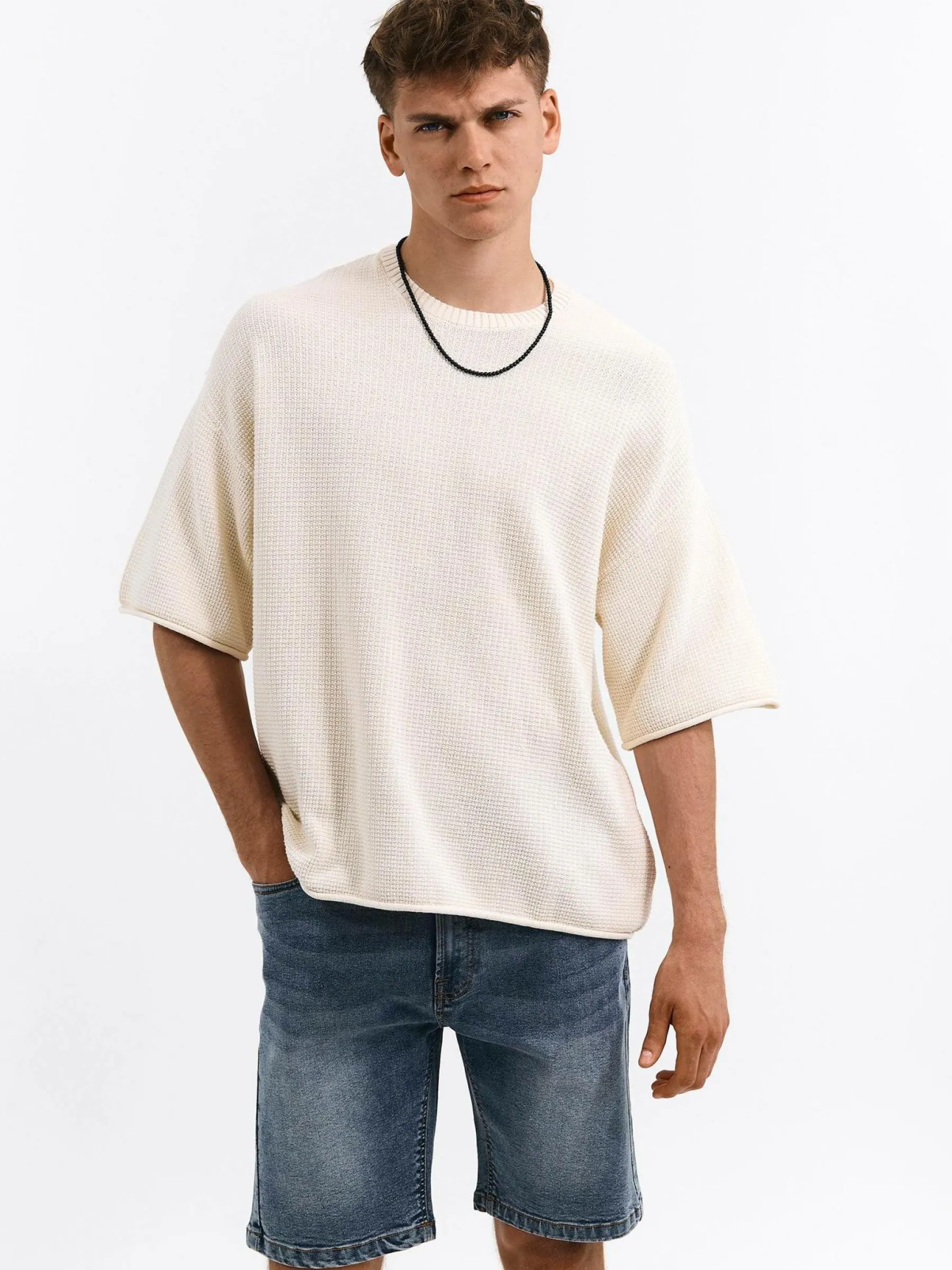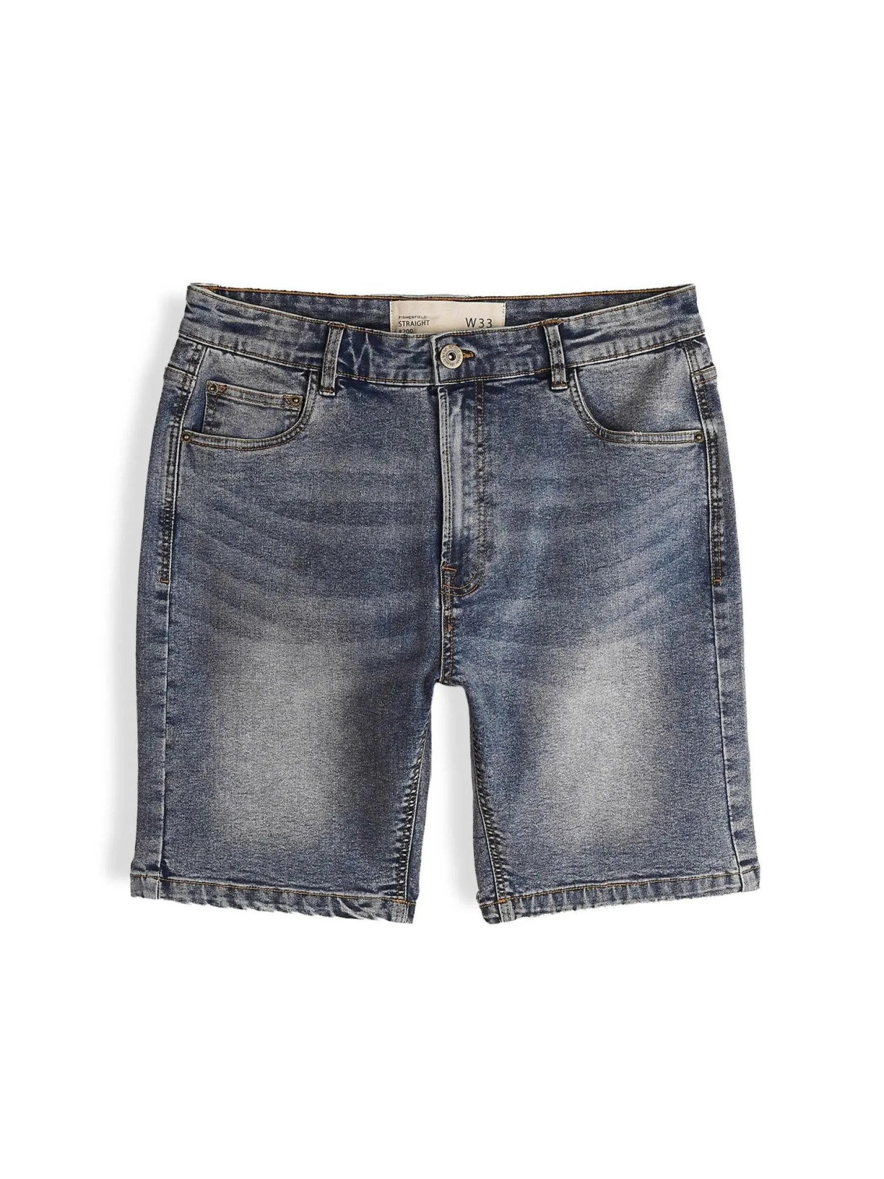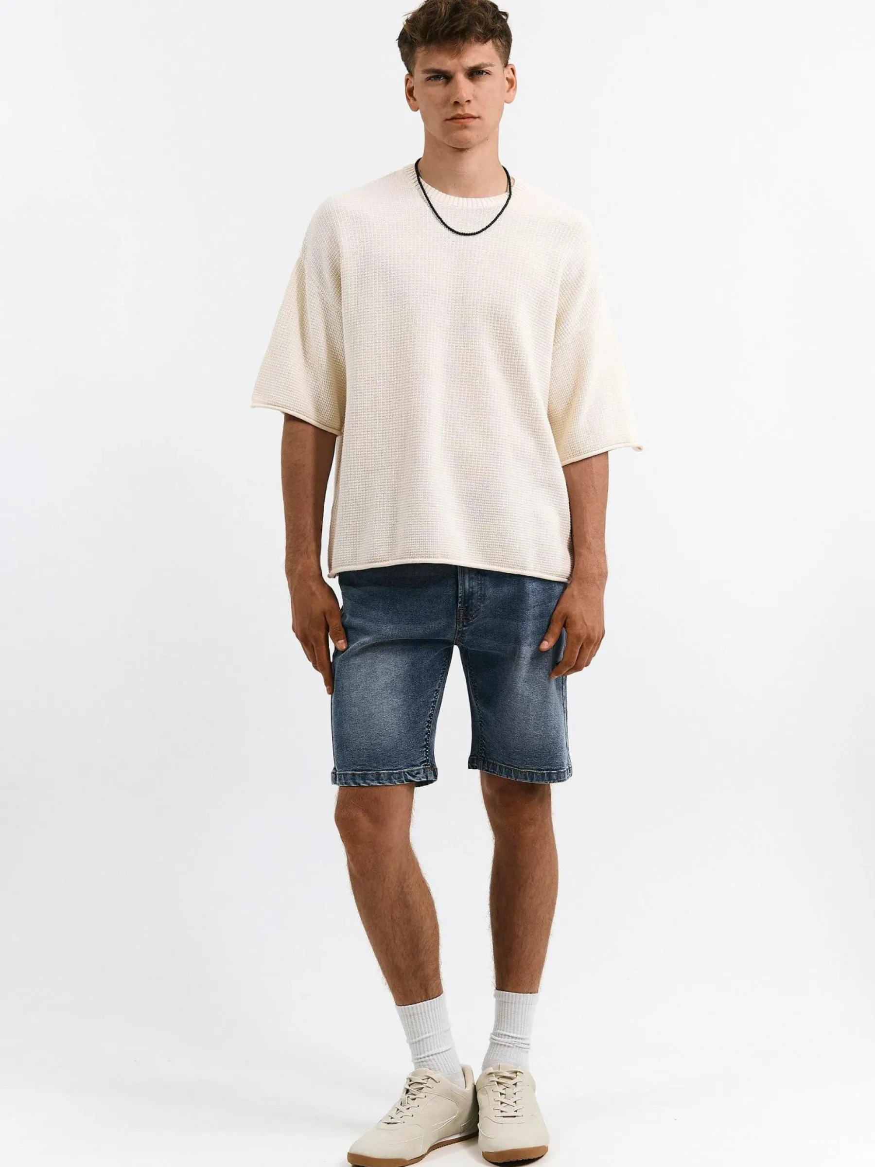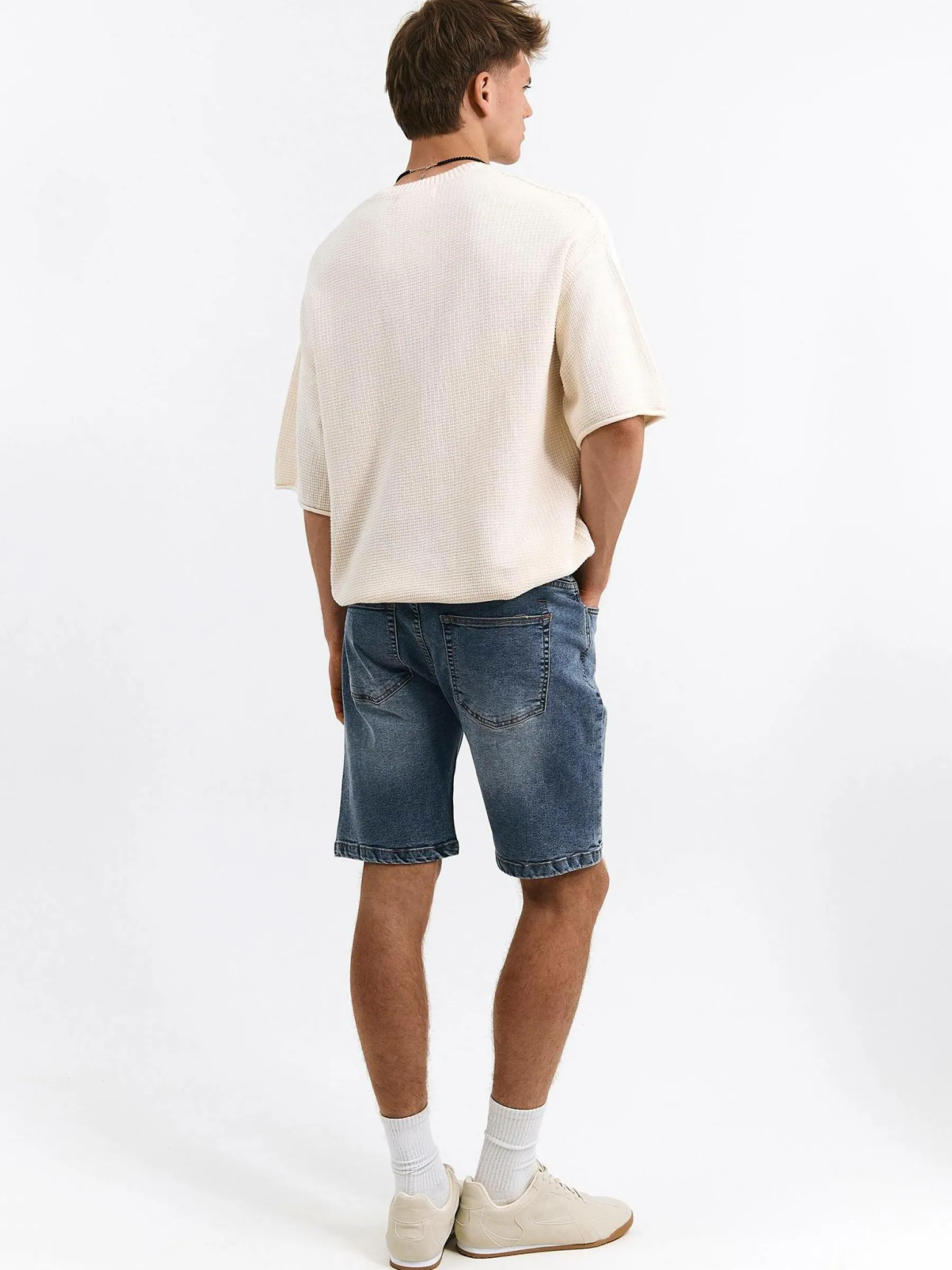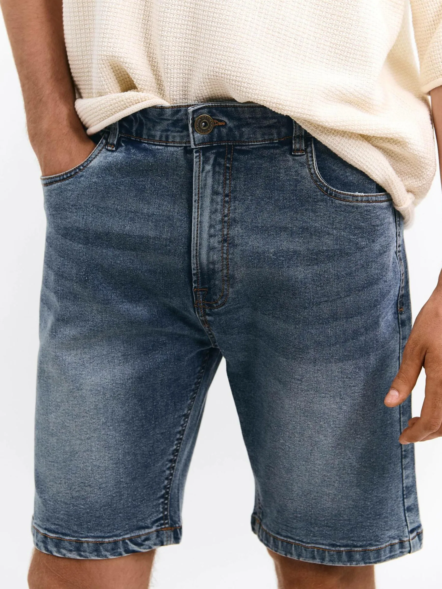 Kolor: niebieskiKrój: straightTyp: spodenkiDługość: krótkiPattern style: pojedynczy kolorDetal: na zamek, z kieszen…