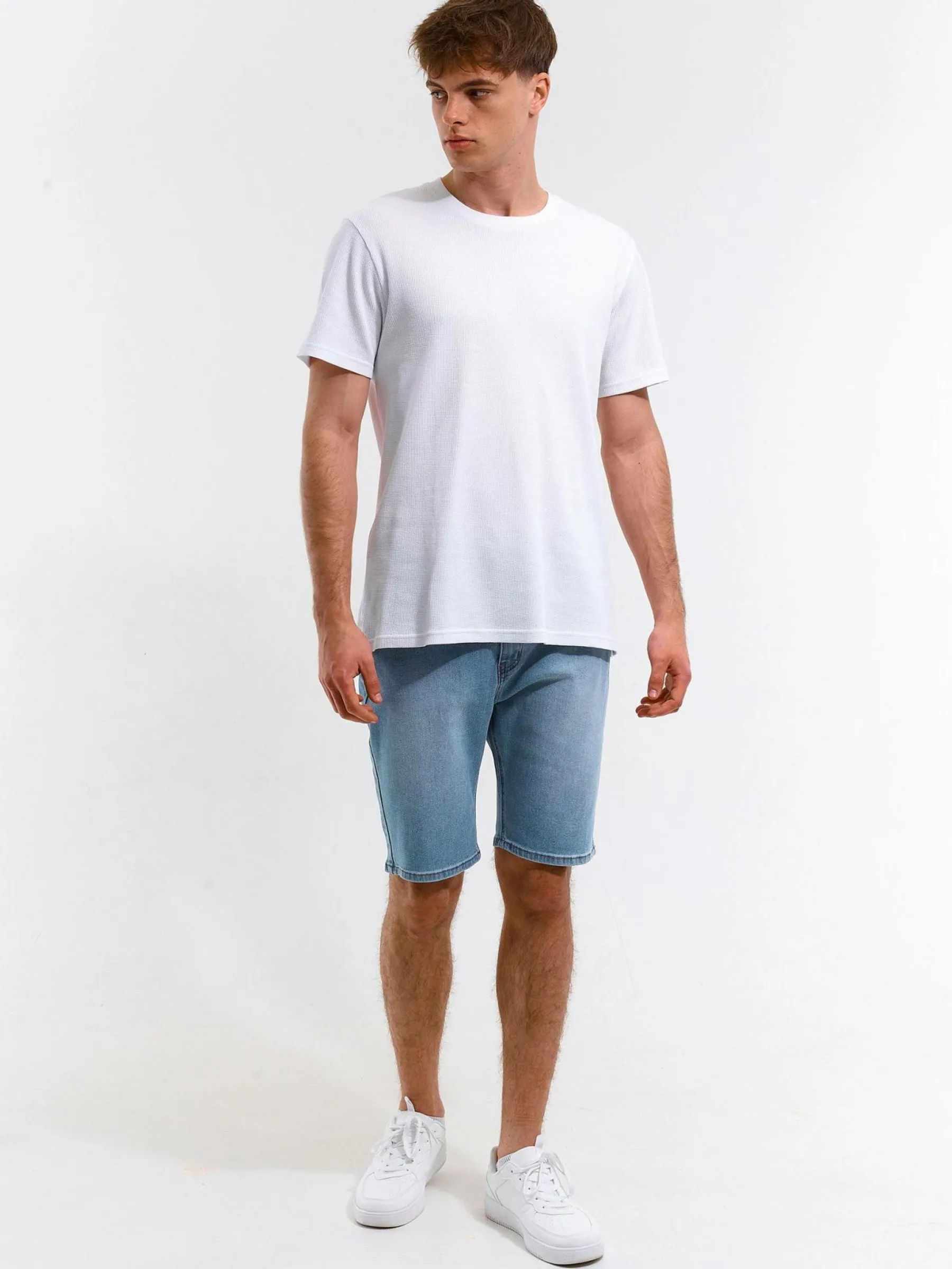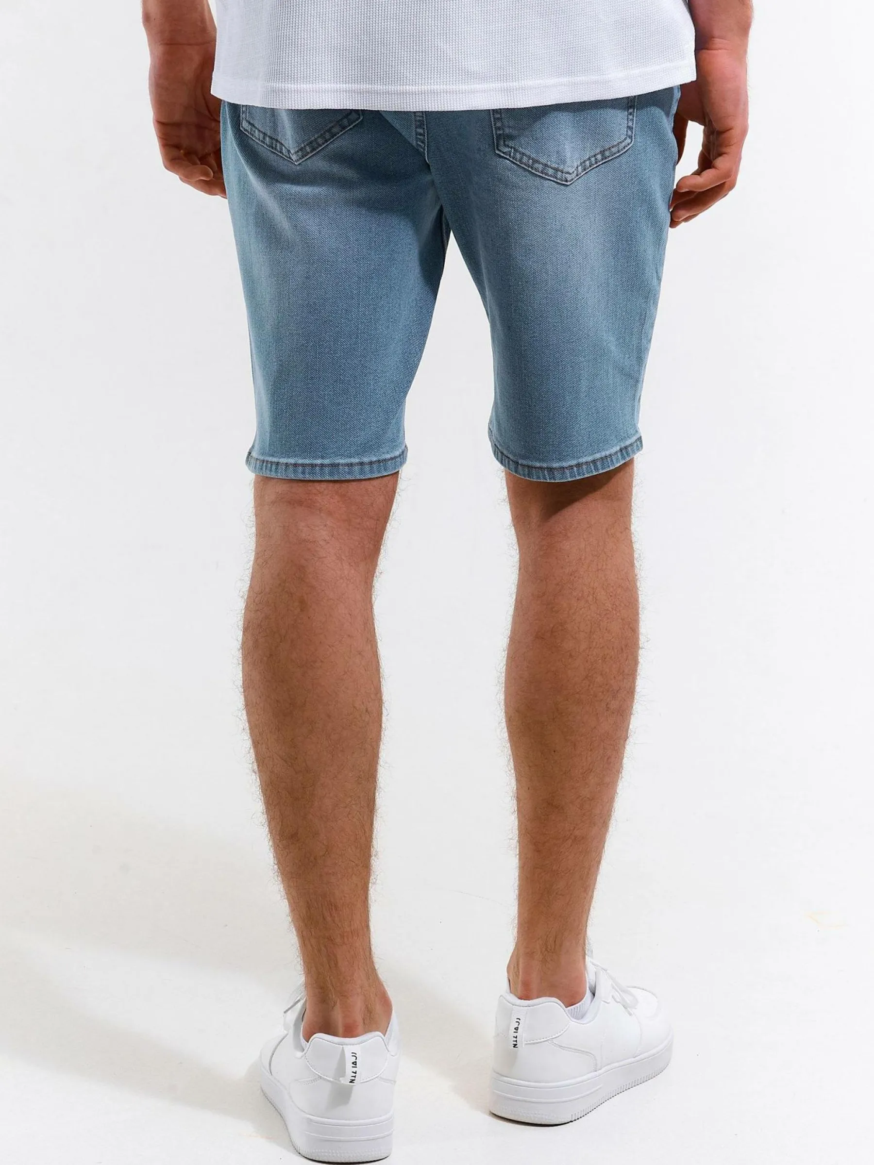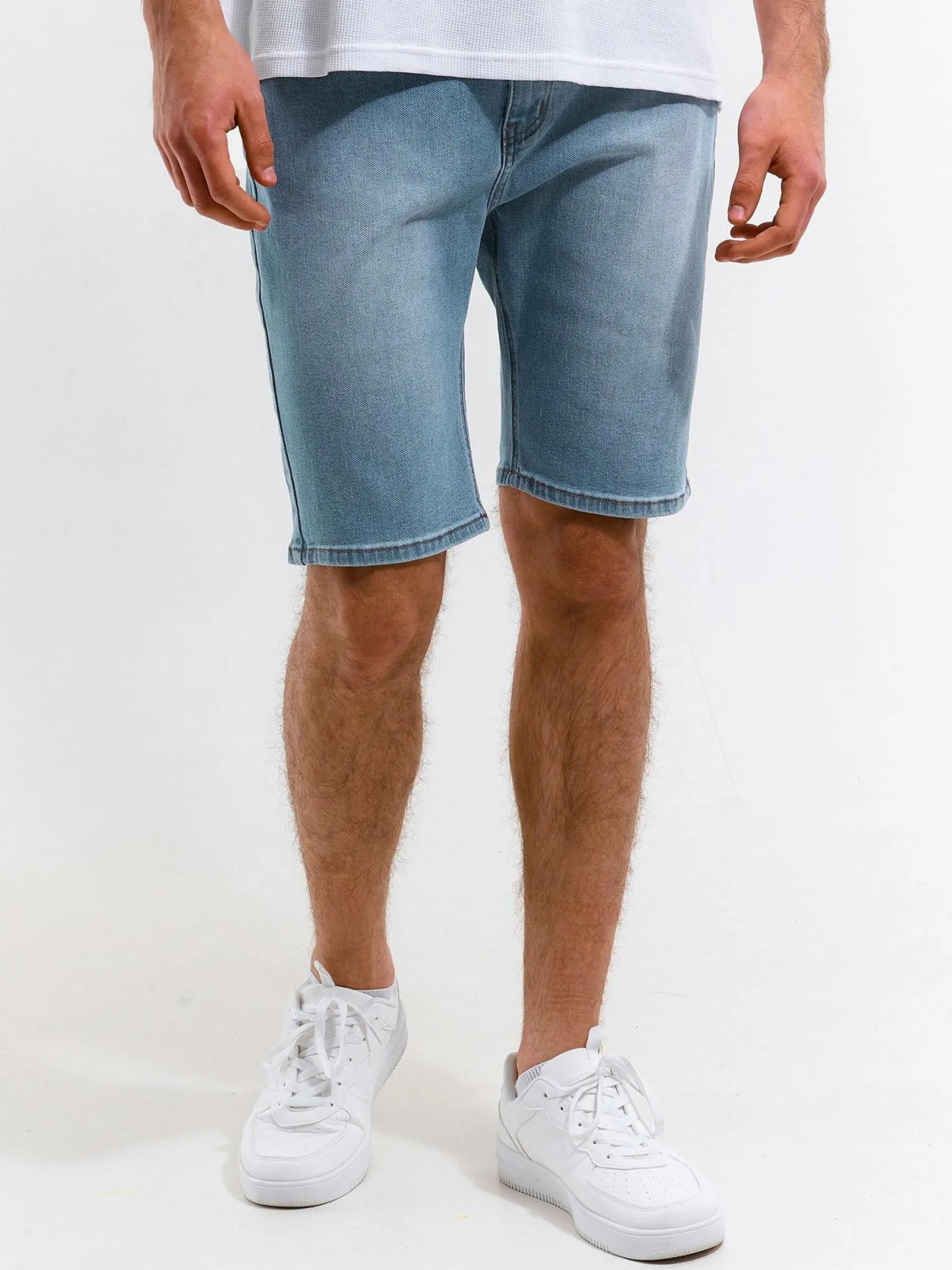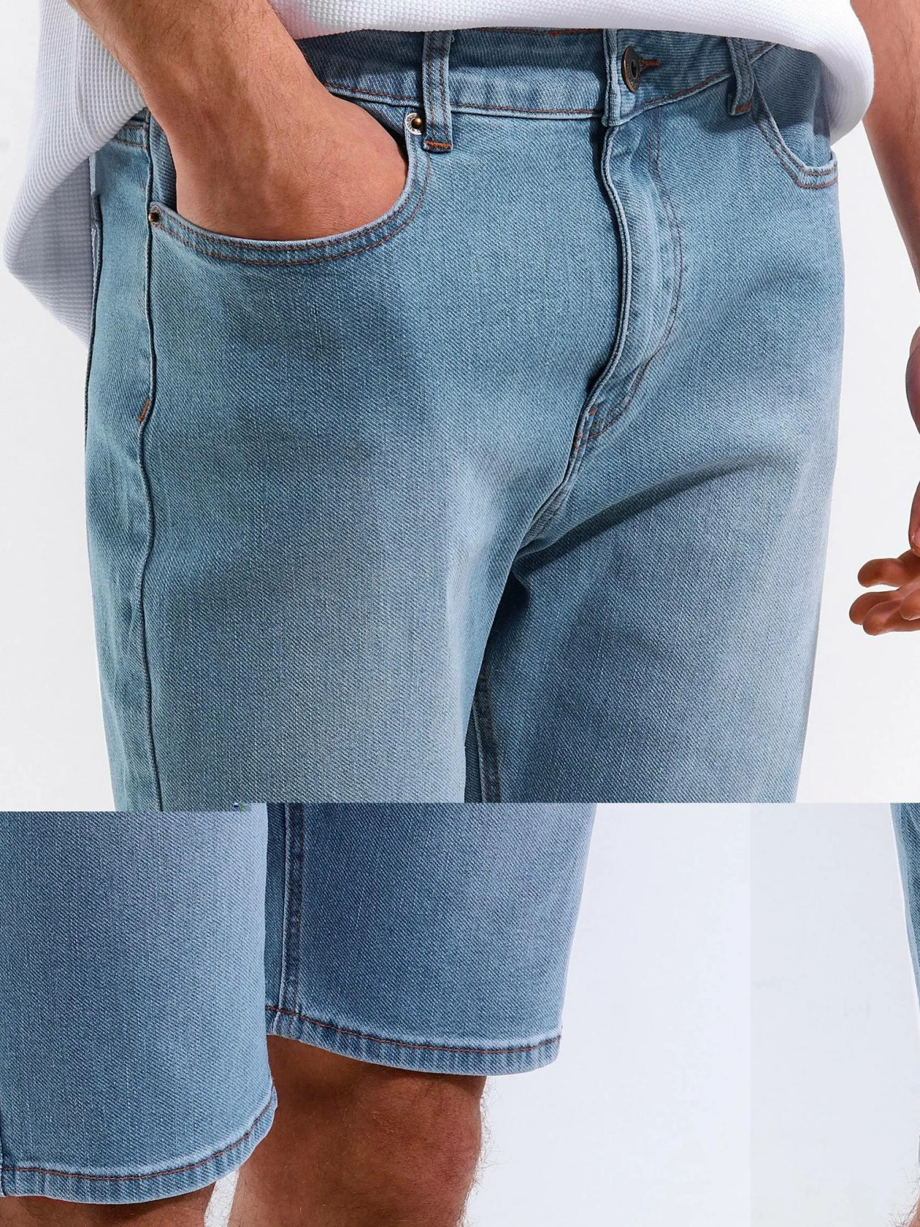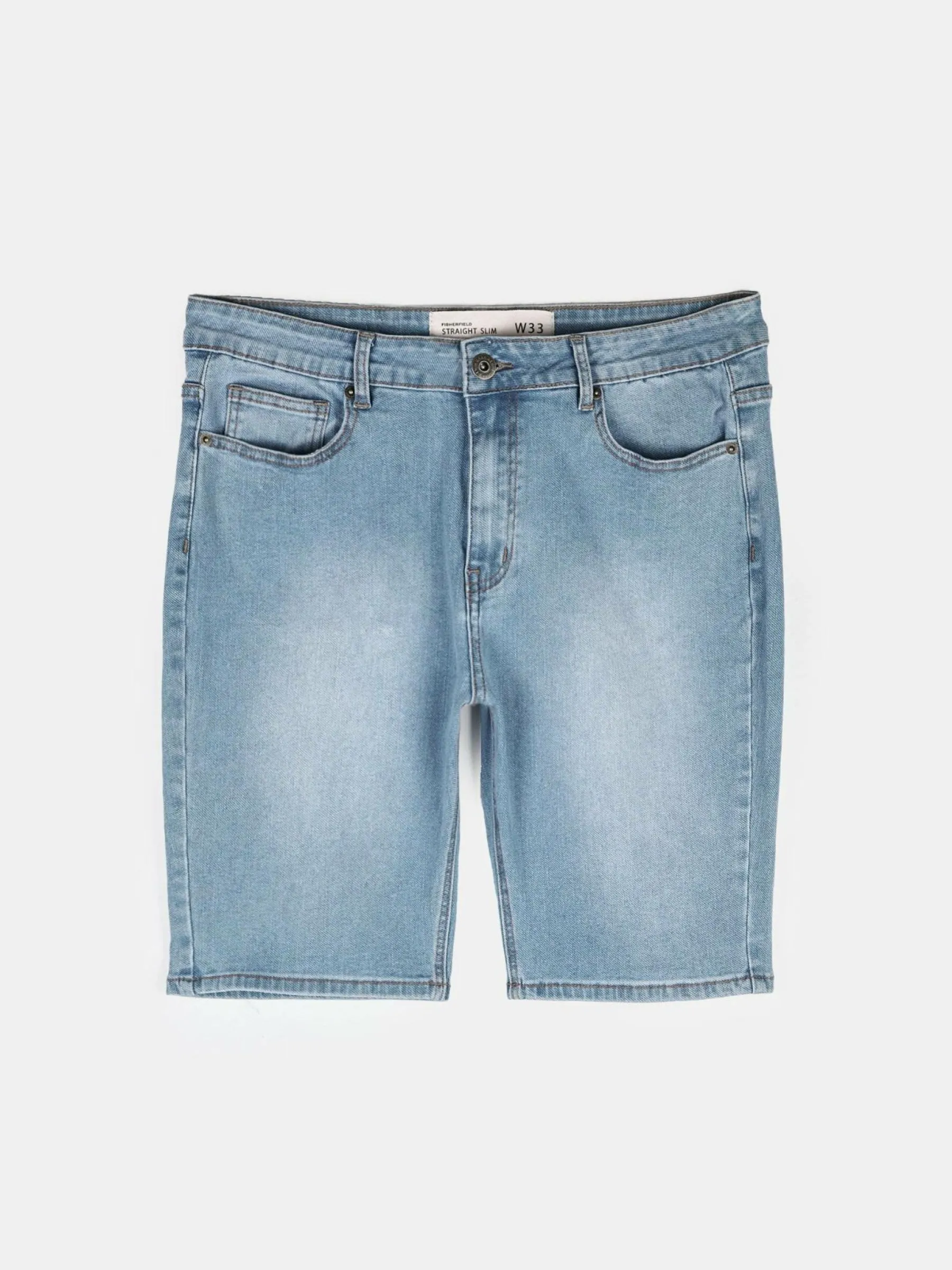 Kolor: niebieskiKrój: prosty slimTyp: spodenkiDługość: krótkiPattern style: pojedynczy kolorDetal: na zamek, z kies…