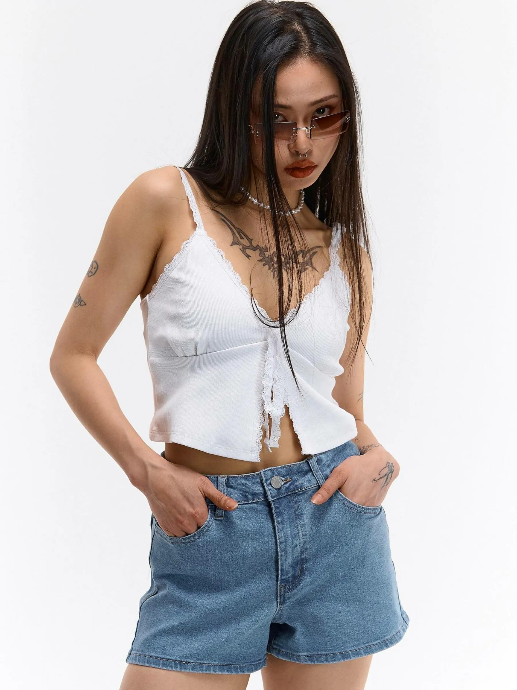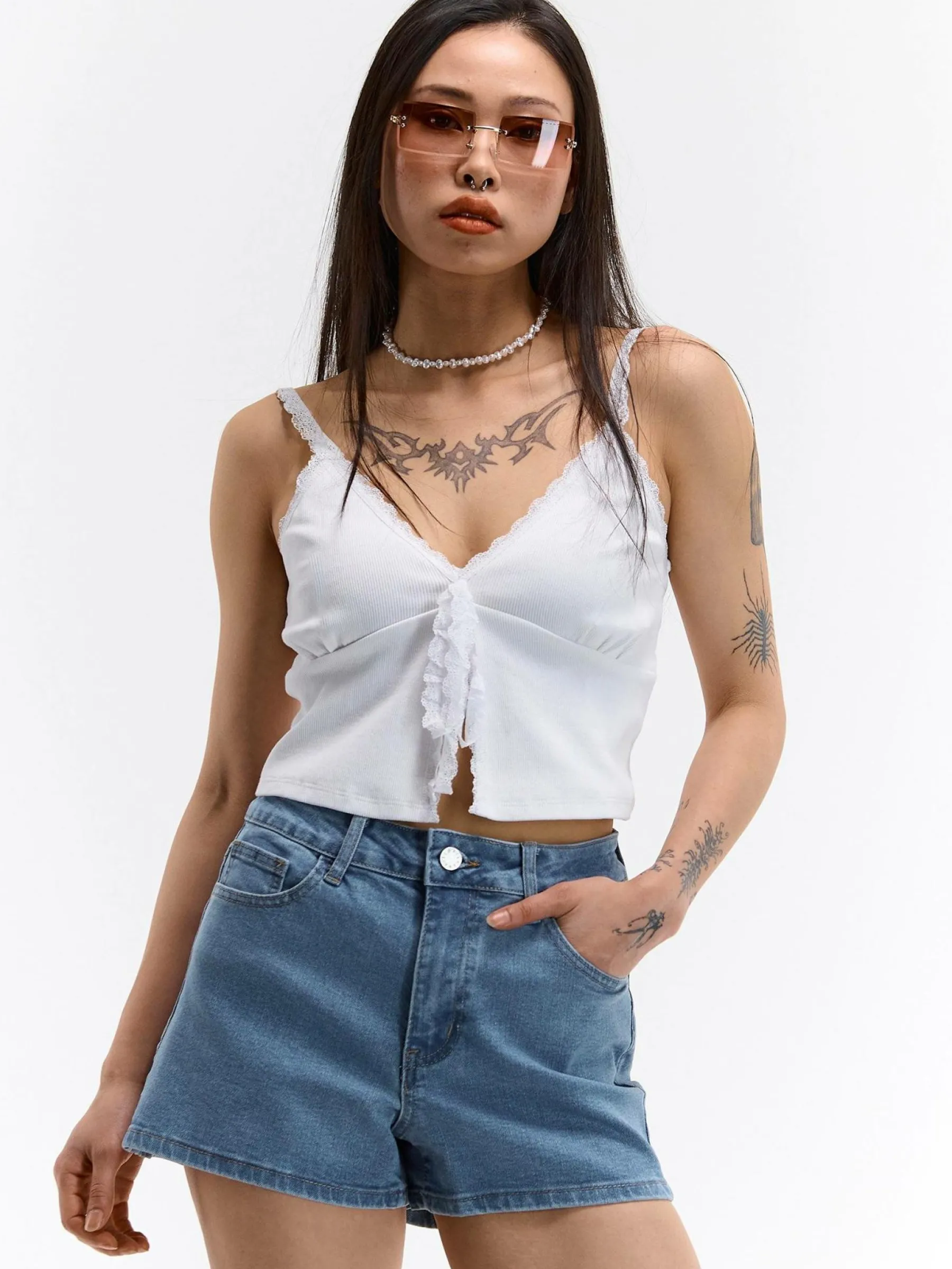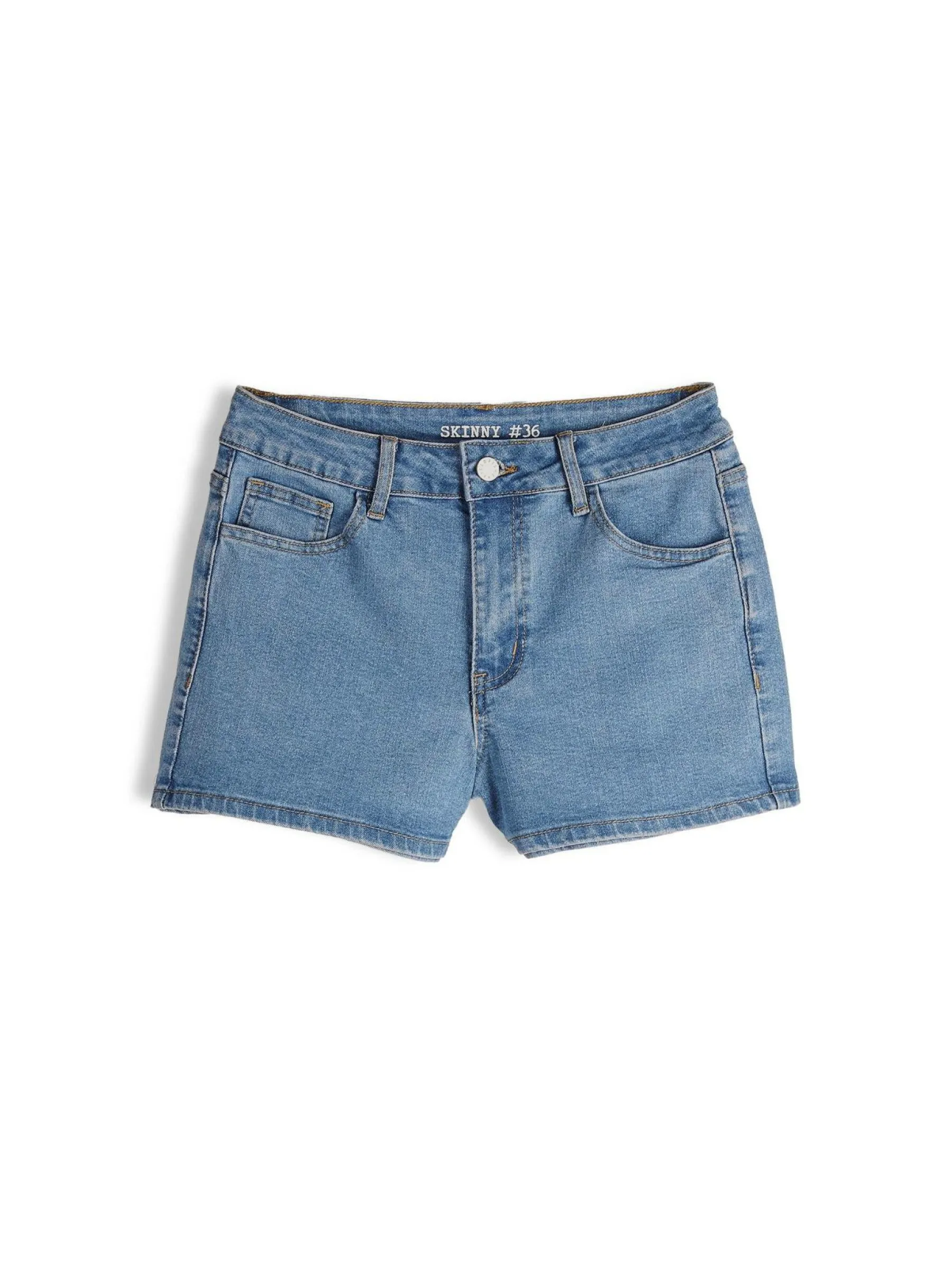 Kolor: niebieskiKrój: skinnyTyp: spodenkiDługość: krótkiPattern style: pojedynczy kolorDetal: na zamek, z kieszenia…