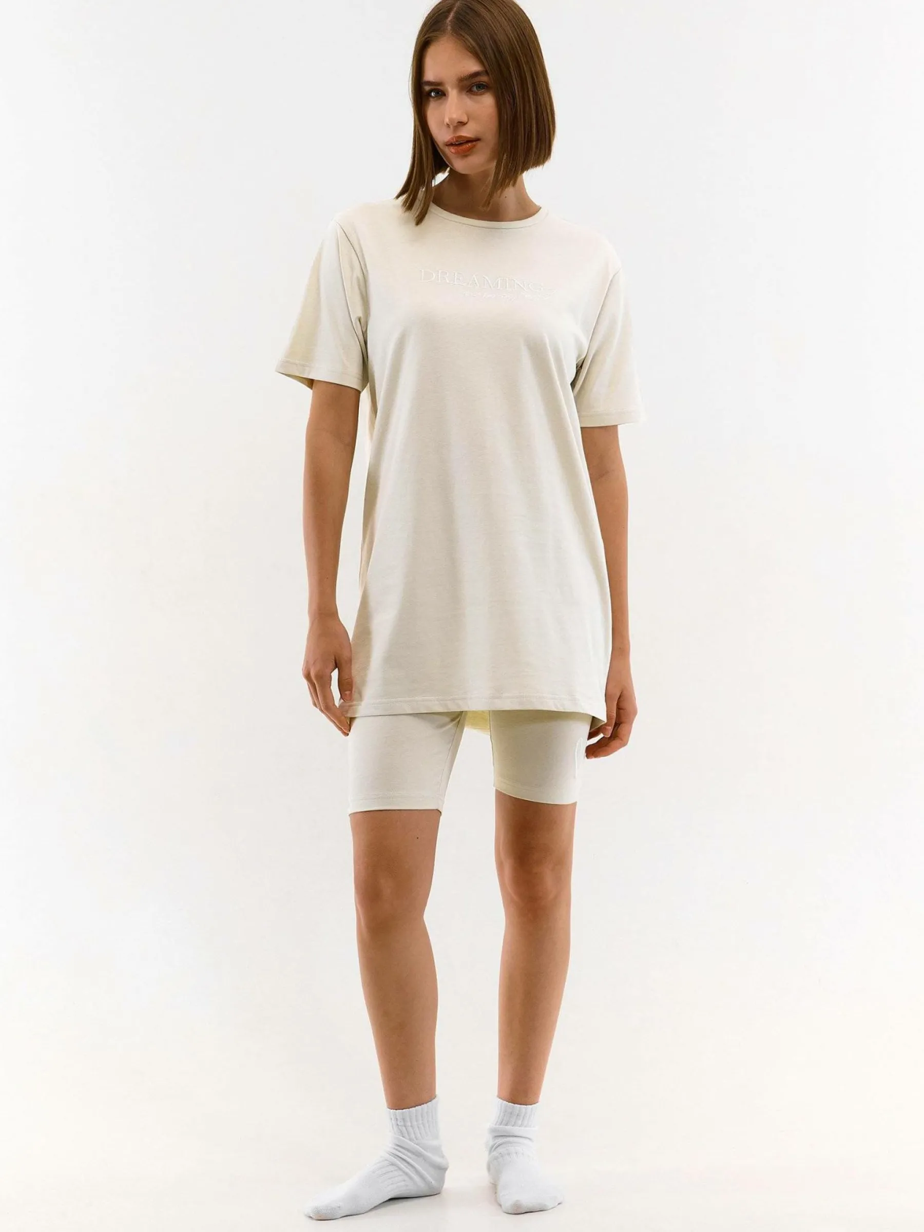 Kolor: beżowyKrój: regularTyp: piżamaDługość: krótkiPattern style: pojedynczy kolorDetal: z elastyczną opaską, …