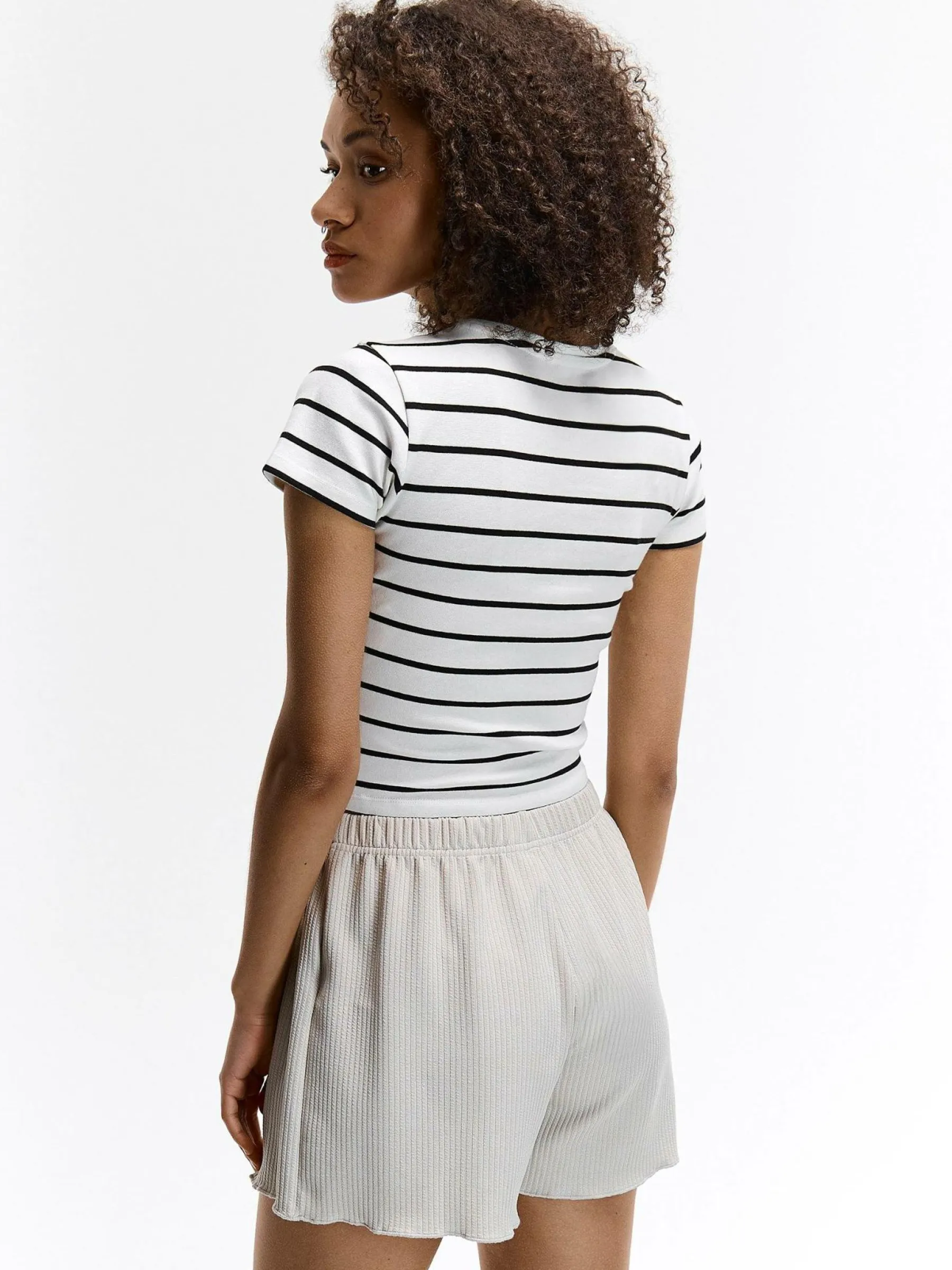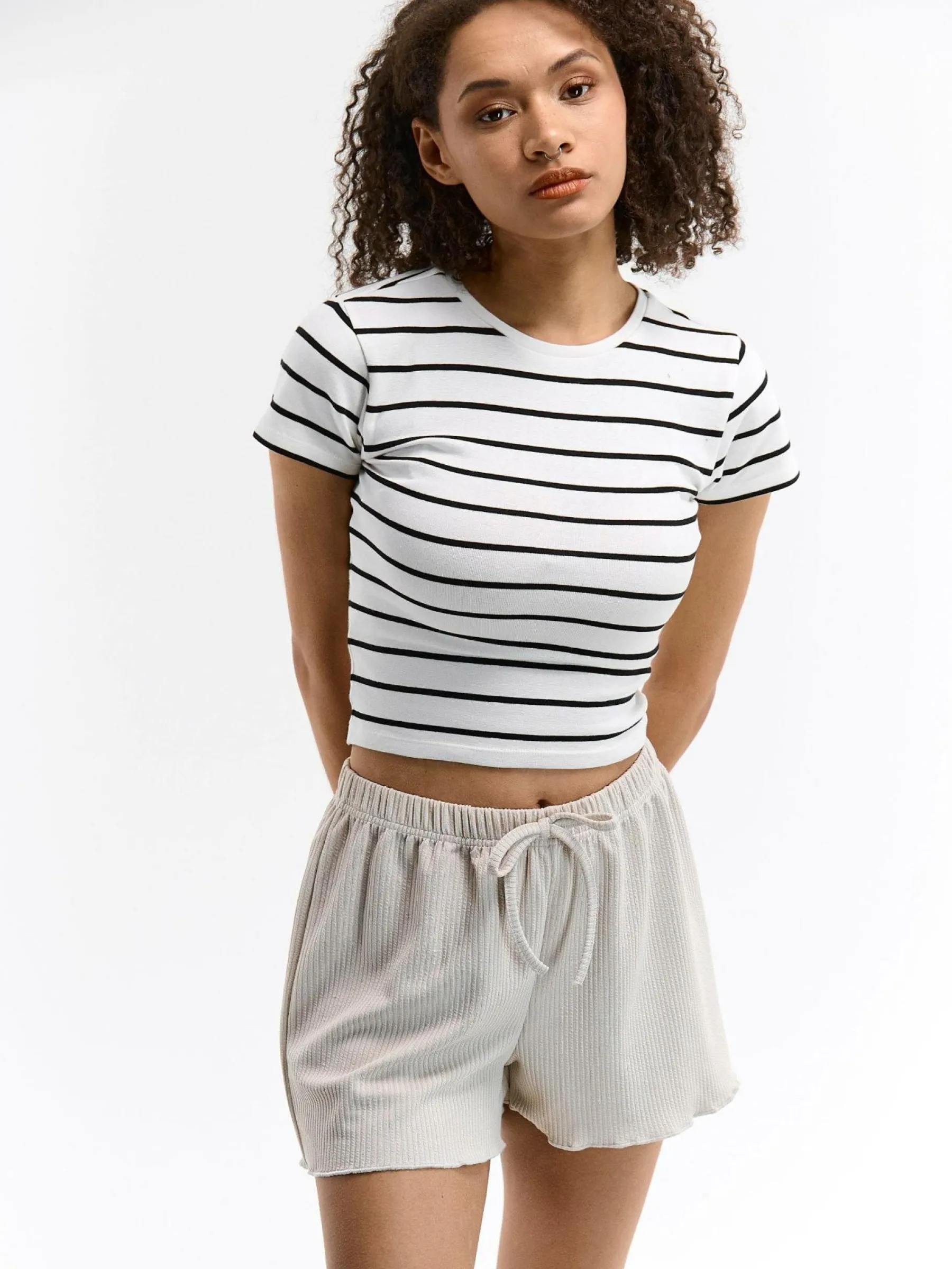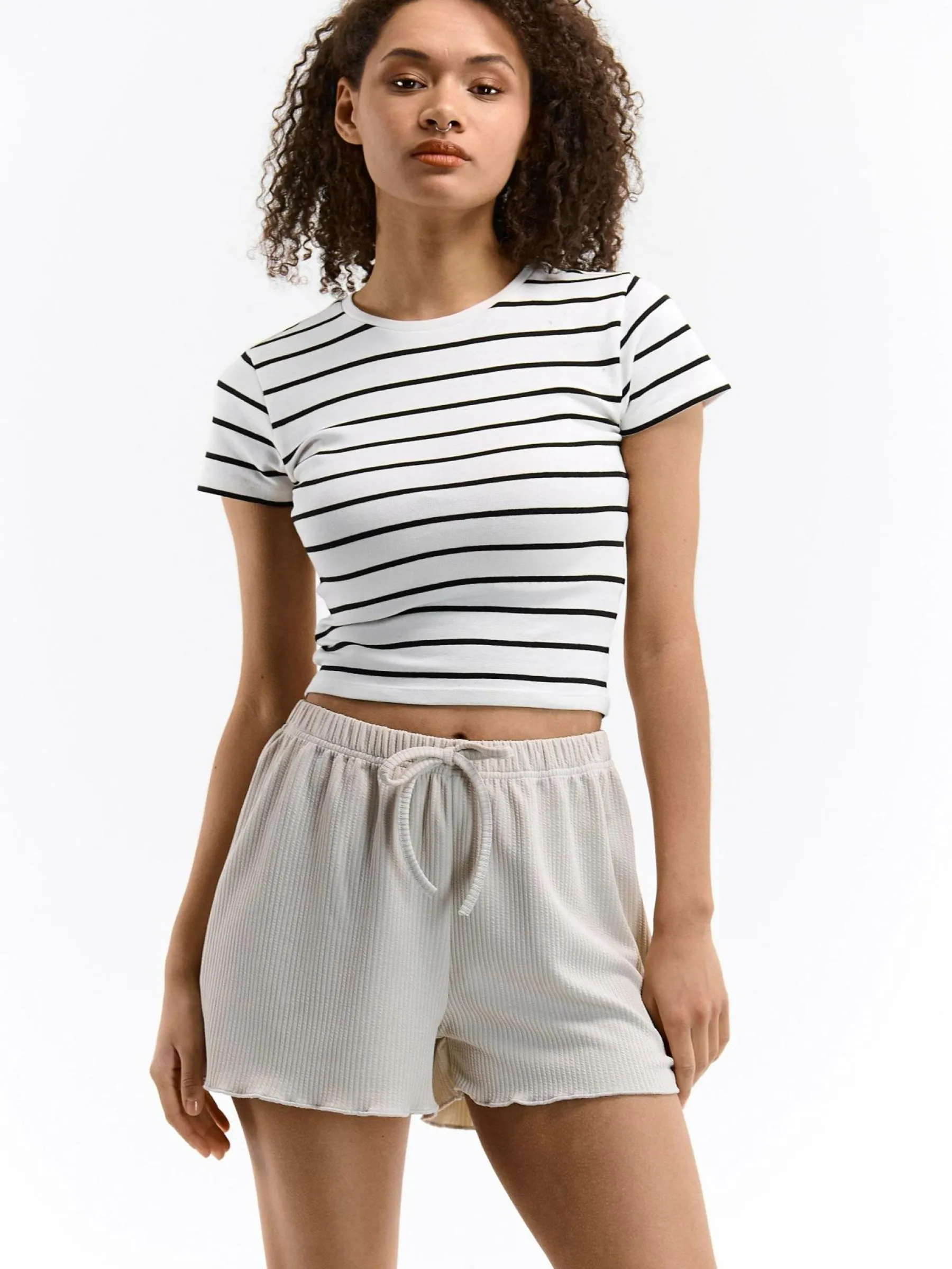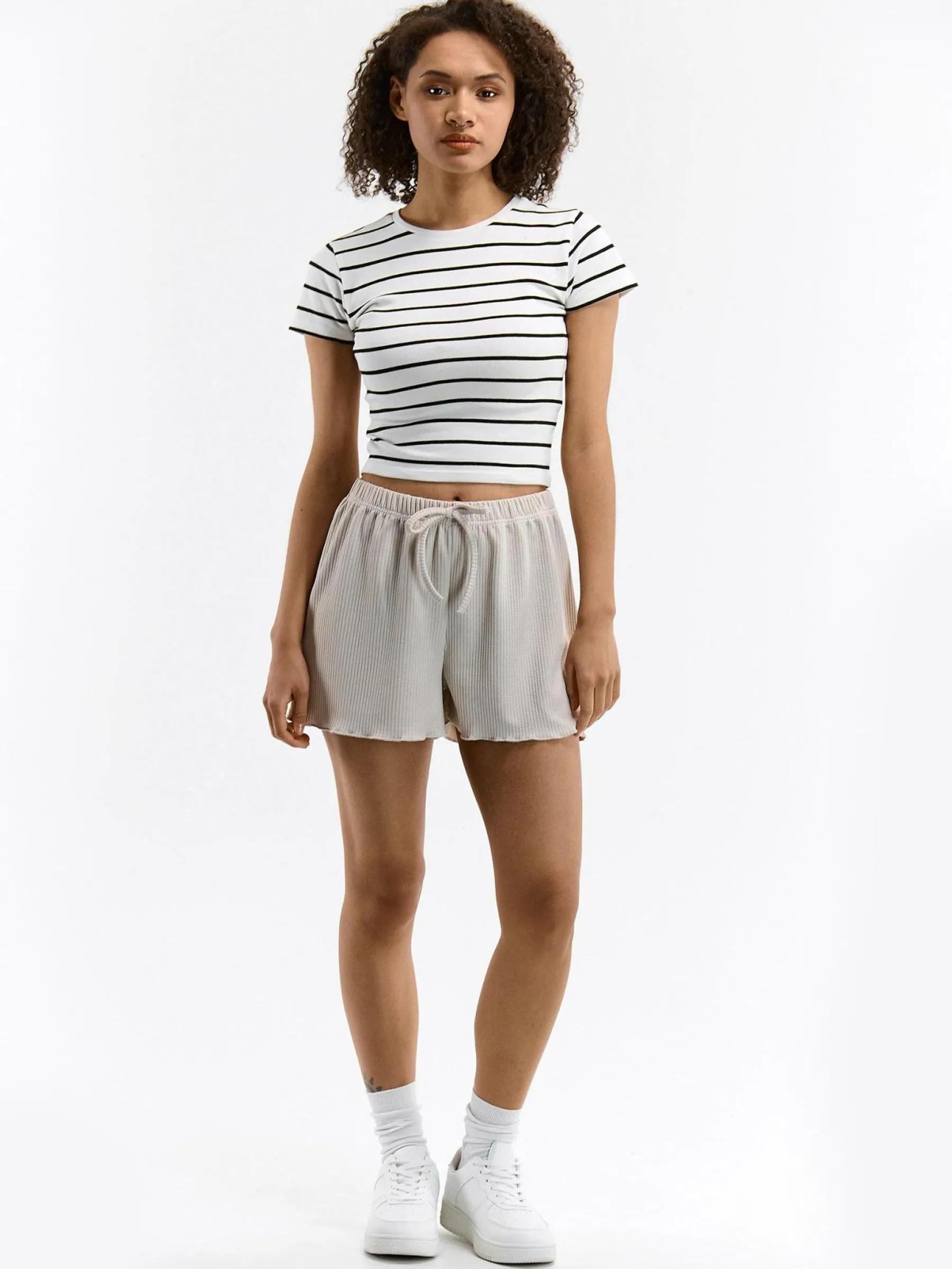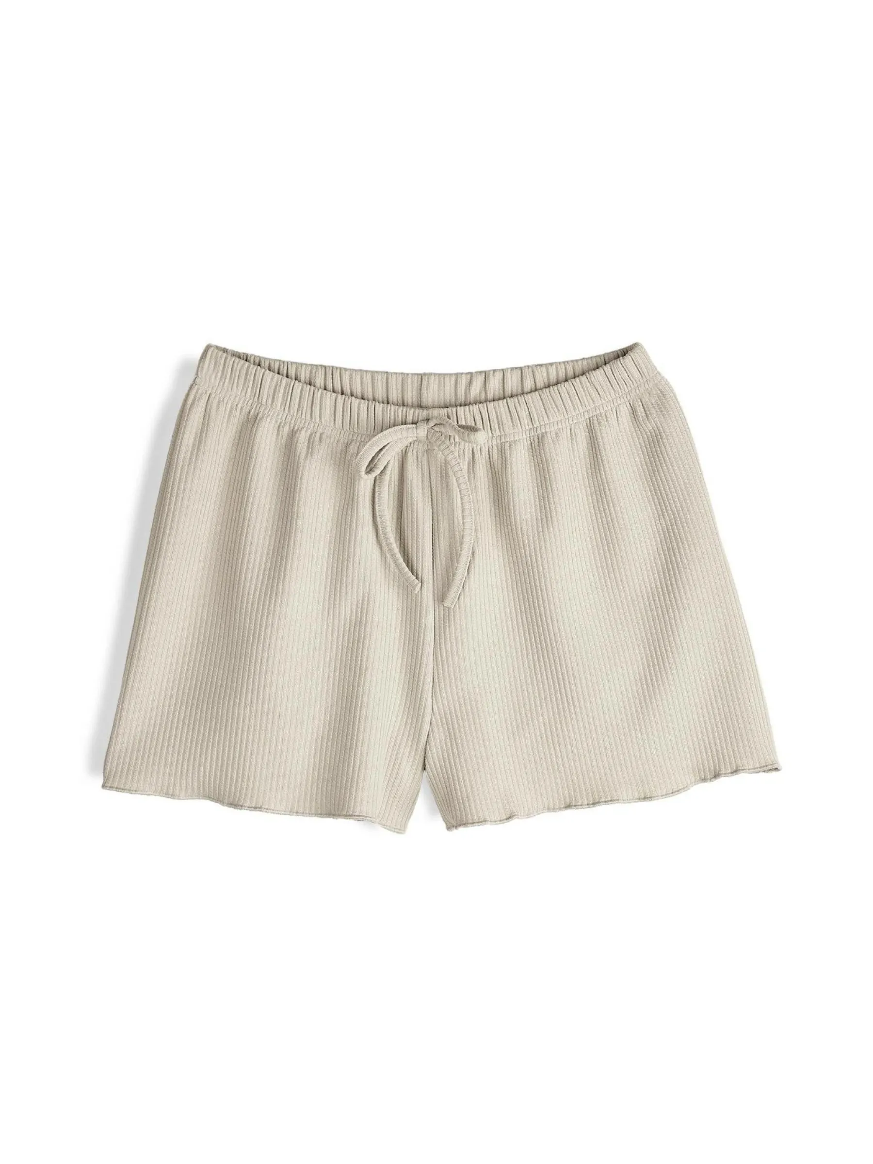 Kolor: beżowyKrój: straightTyp: spodenkiDługość: krótkiPattern style: pojedynczy kolor, żebrowanyDetal: z elastyc…