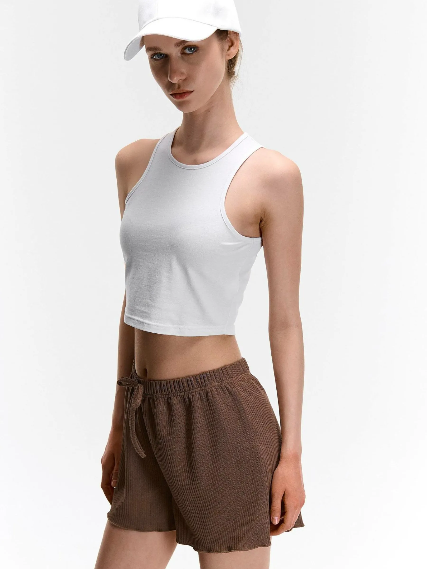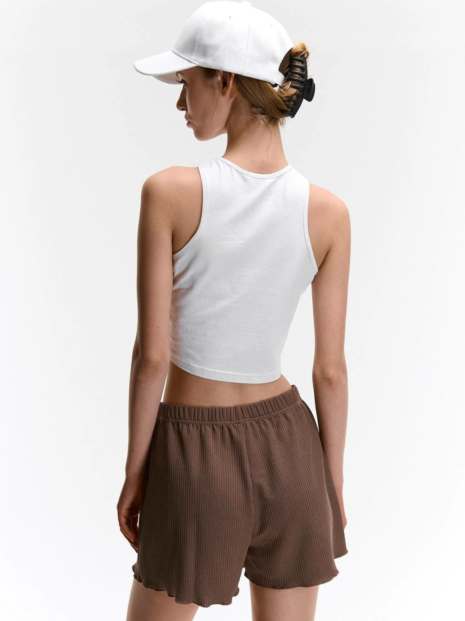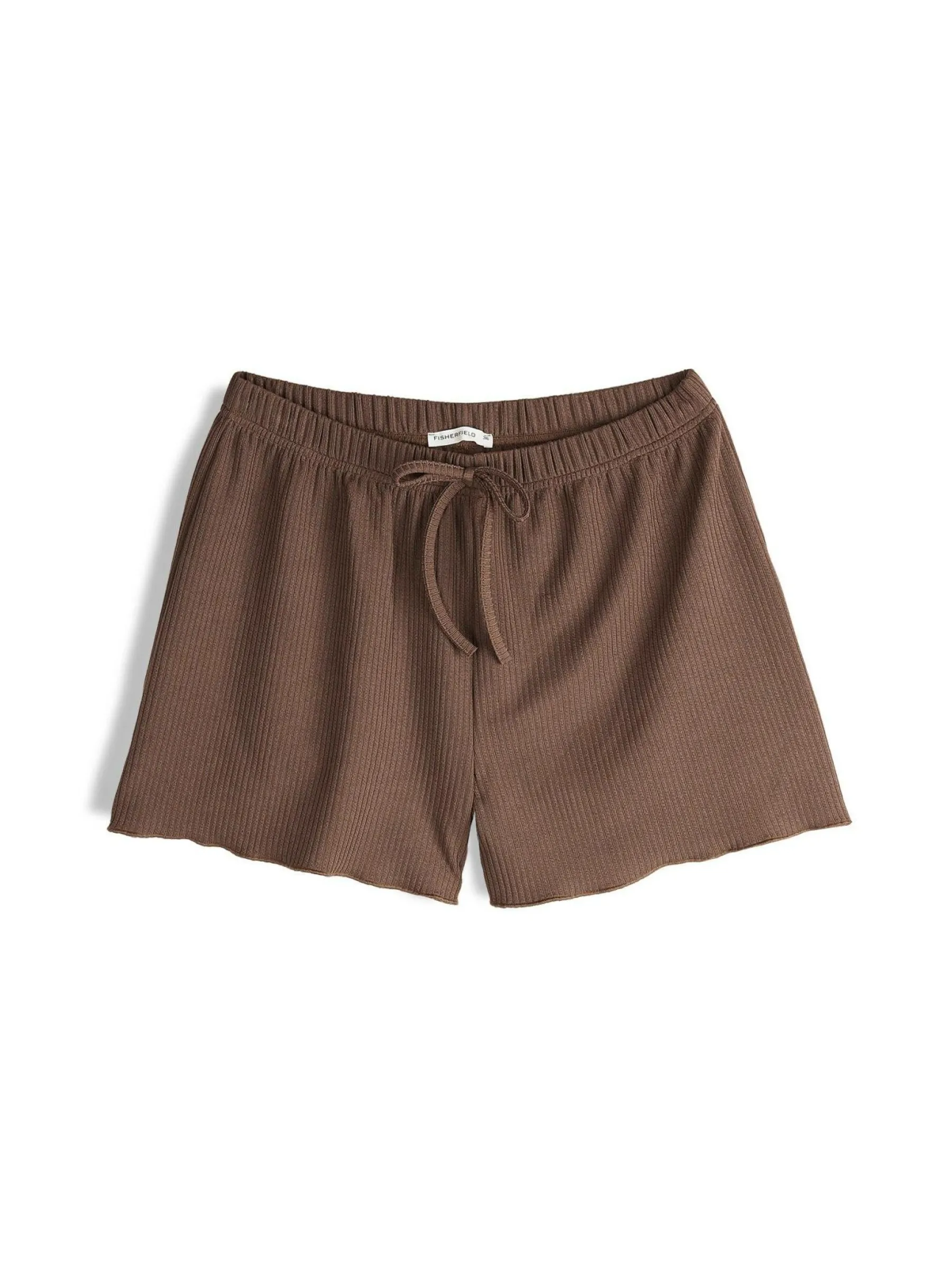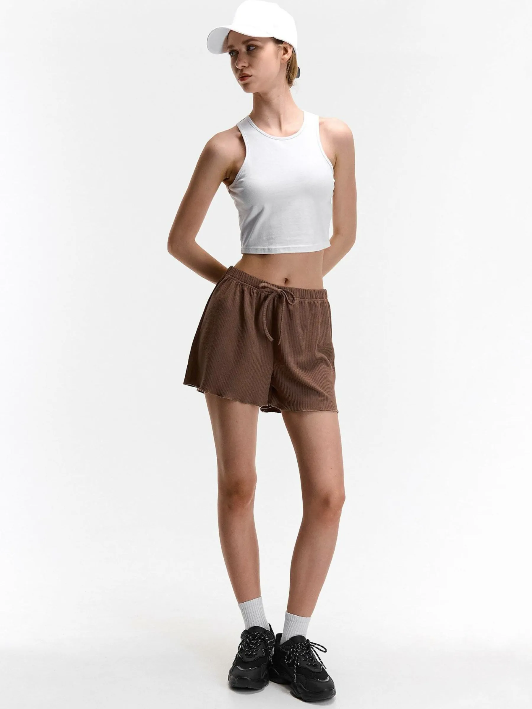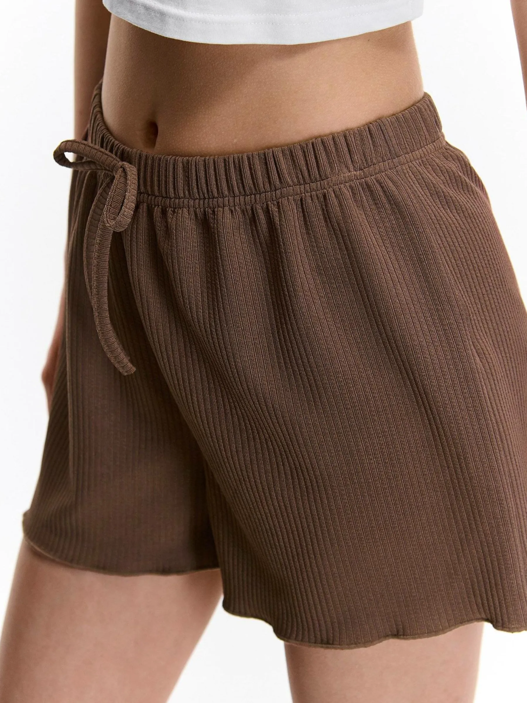 Kolor: brązowyKrój: straightTyp: spodenkiDługość: krótkiPattern style: pojedynczy kolor, żebrowanyDetal: ze sznur…