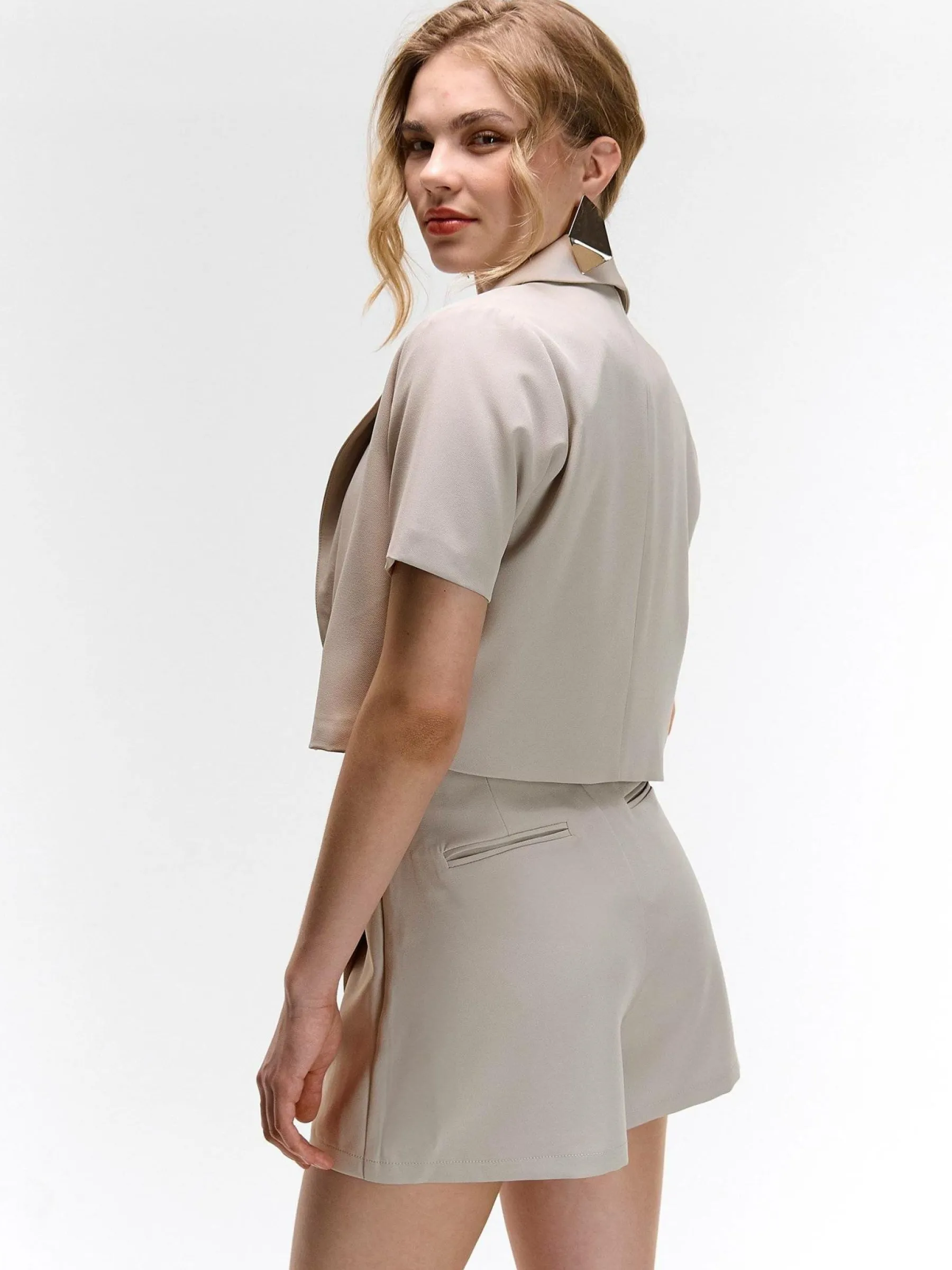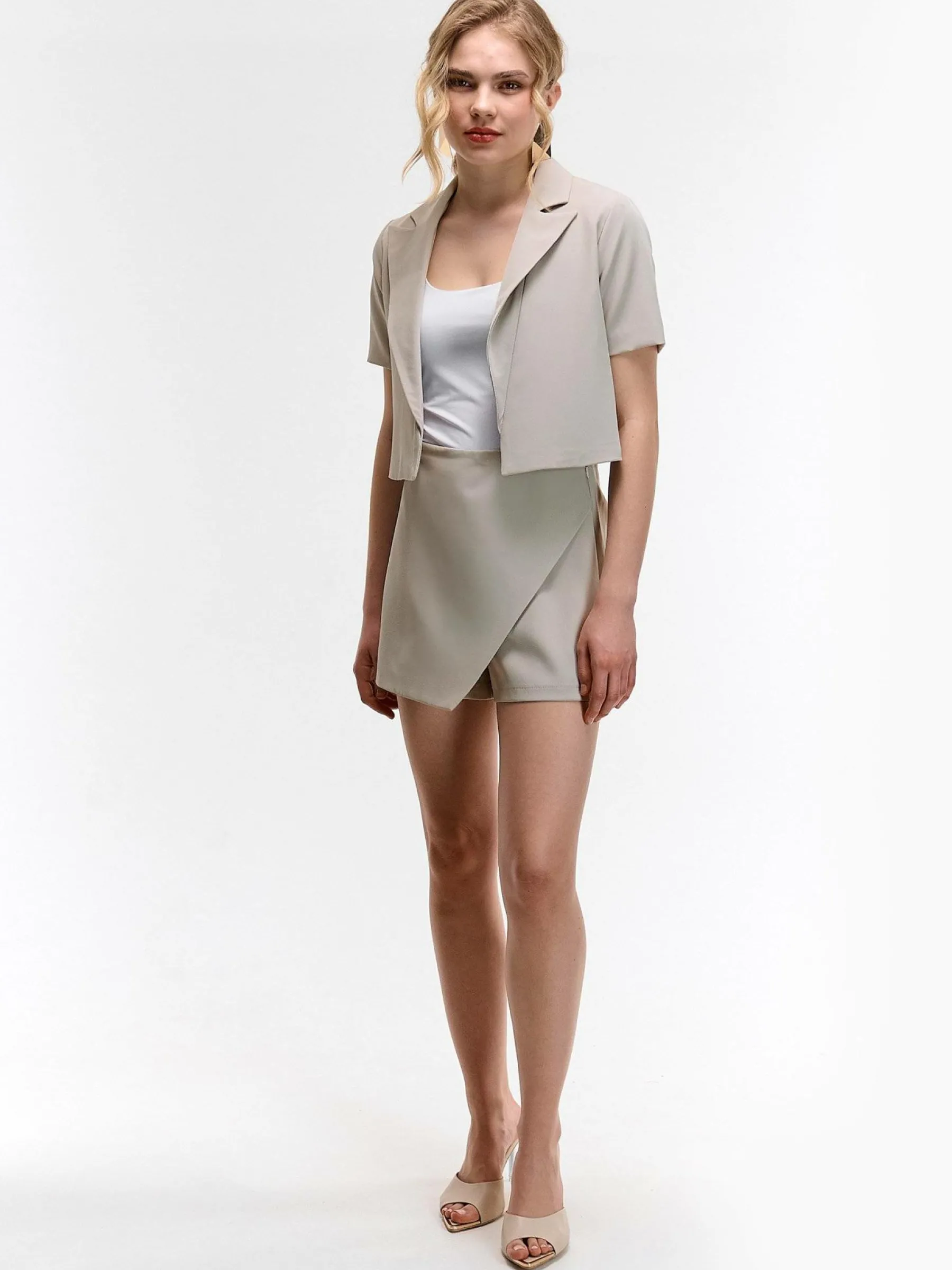 Kolor: beżowyKrój: kopertówkiTyp: spodenkiDługość: krótkiPattern style: pojedynczy kolorDetal: z elastyczną opas…