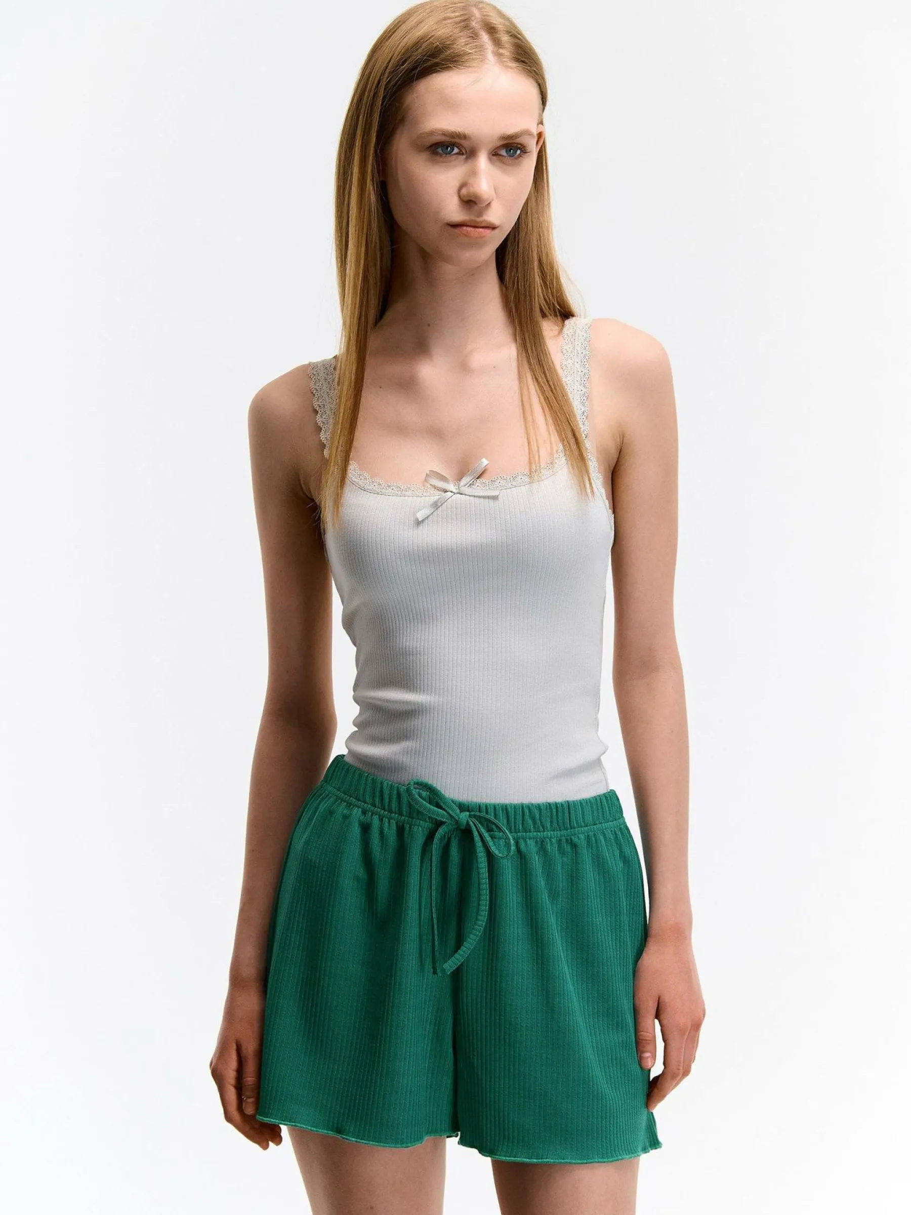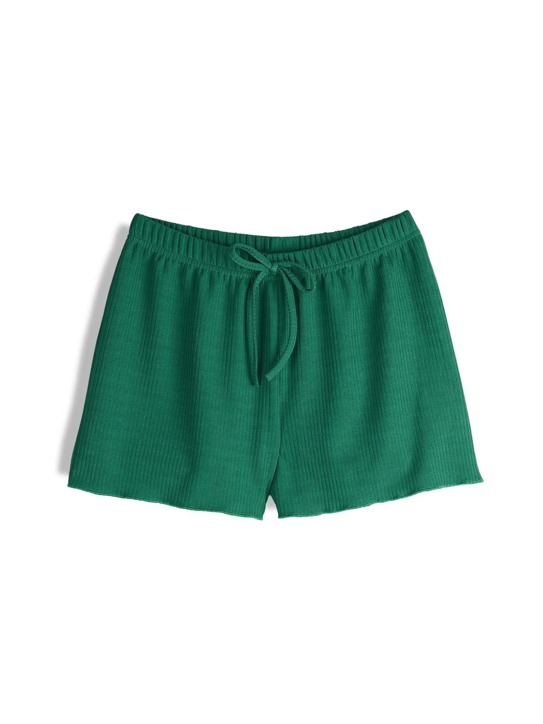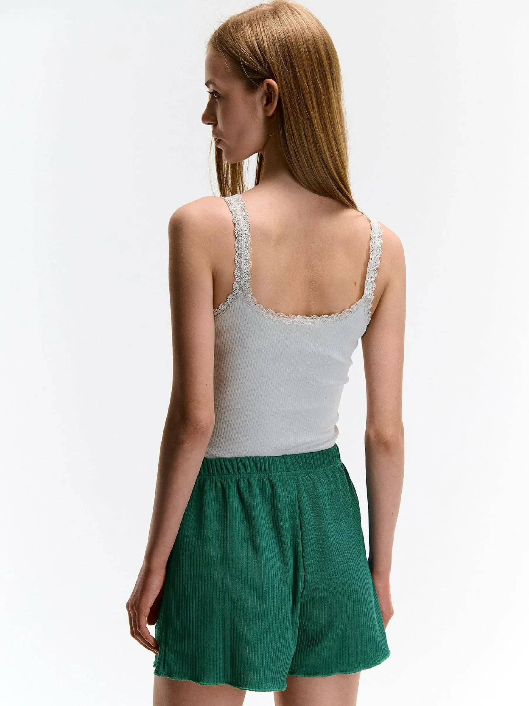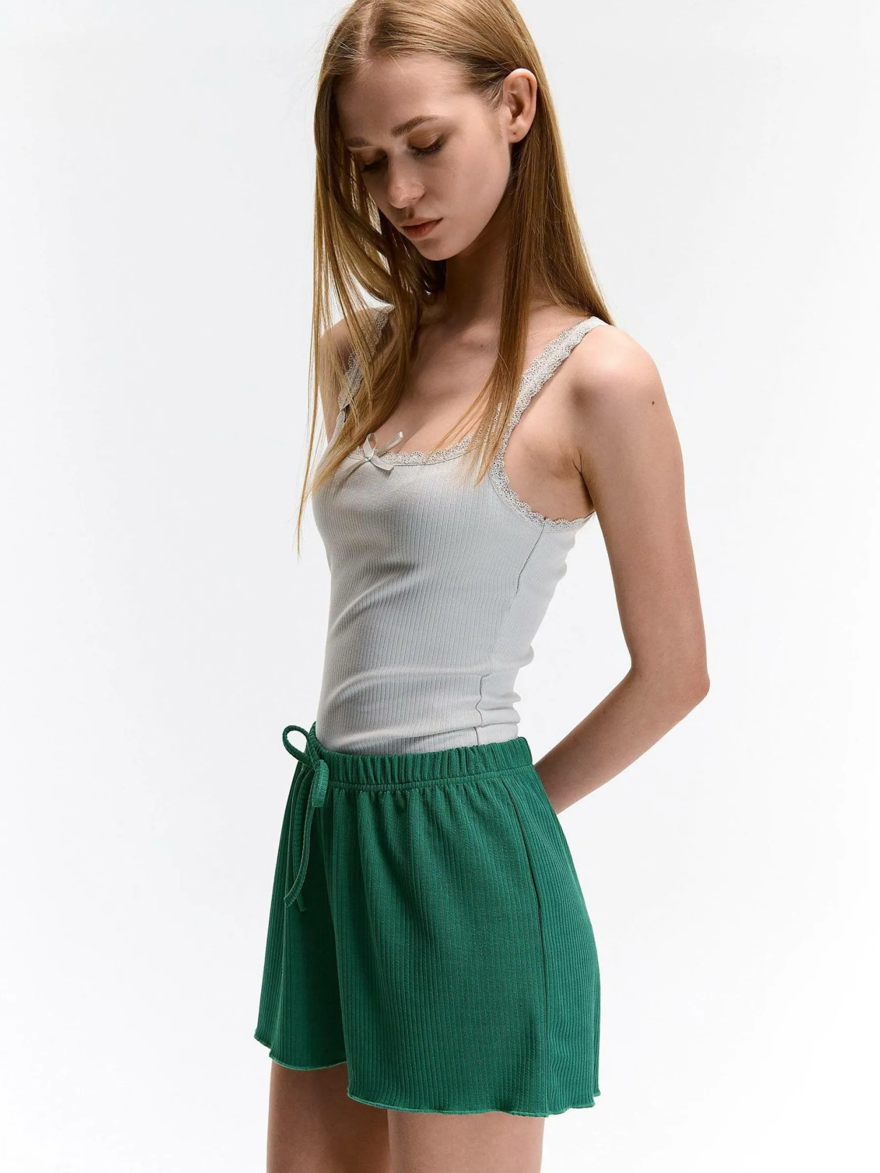 Kolor: zielonyKrój: straightTyp: spodenkiDługość: krótkiPattern style: pojedynczy kolor, żebrowanyDetal: ze sznuro…