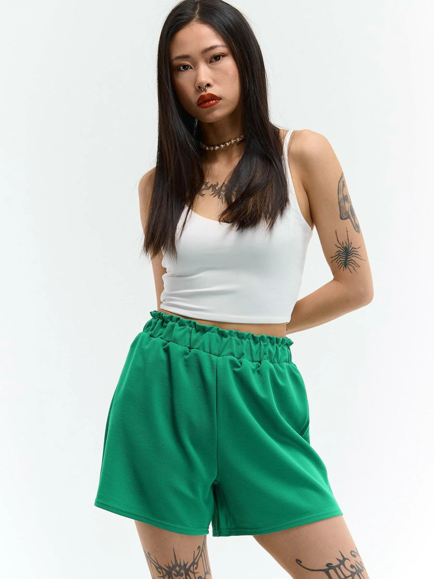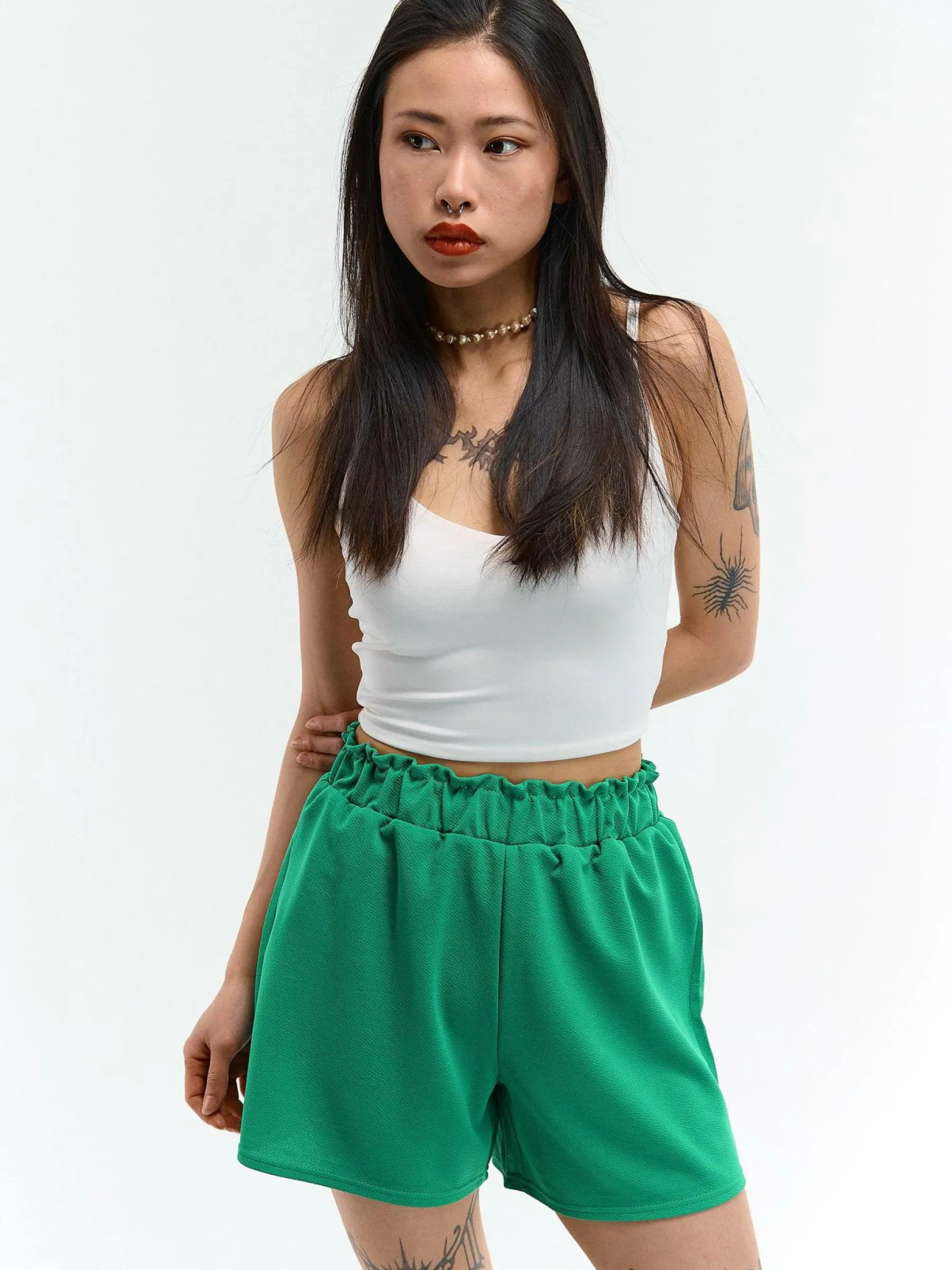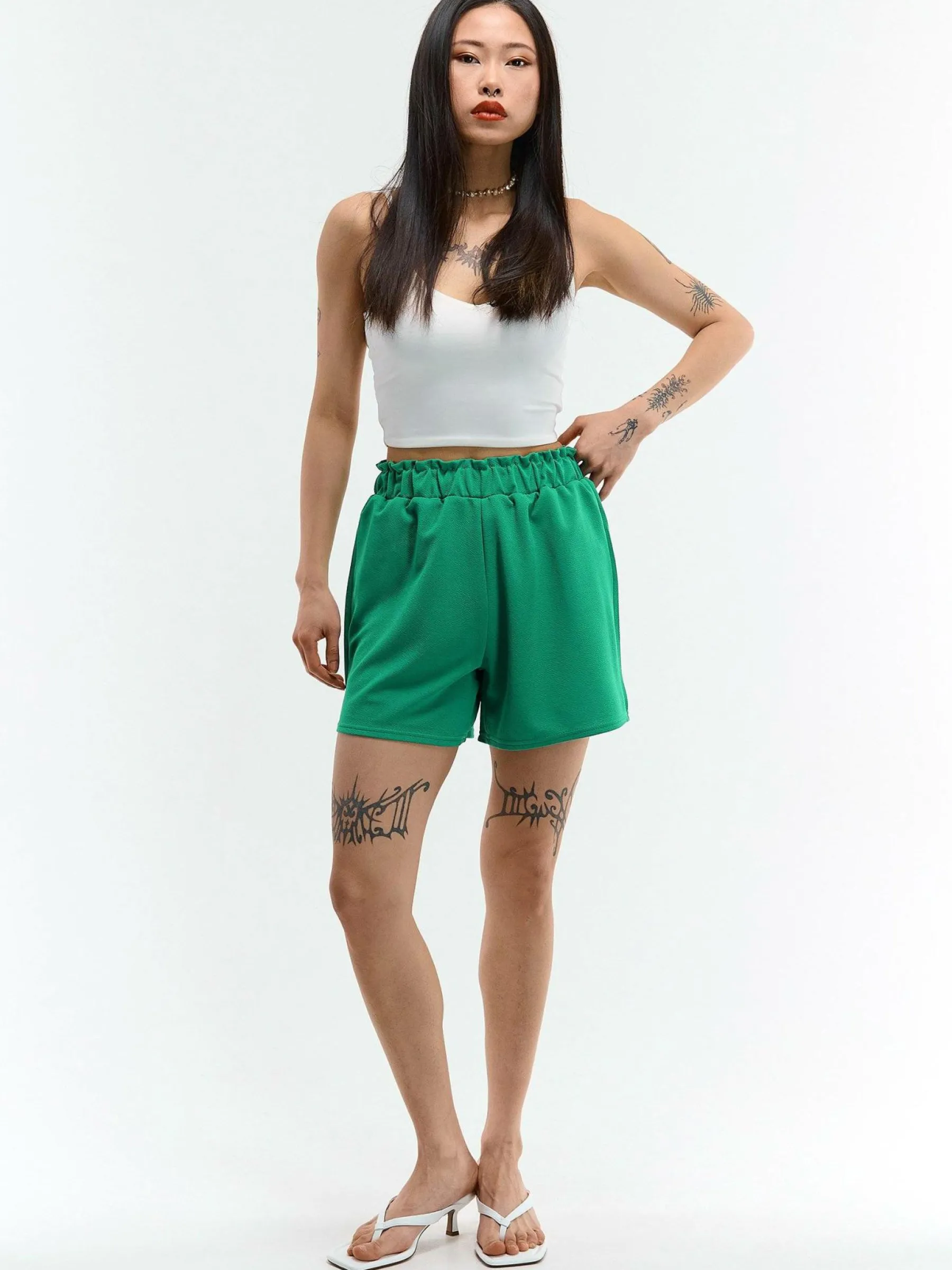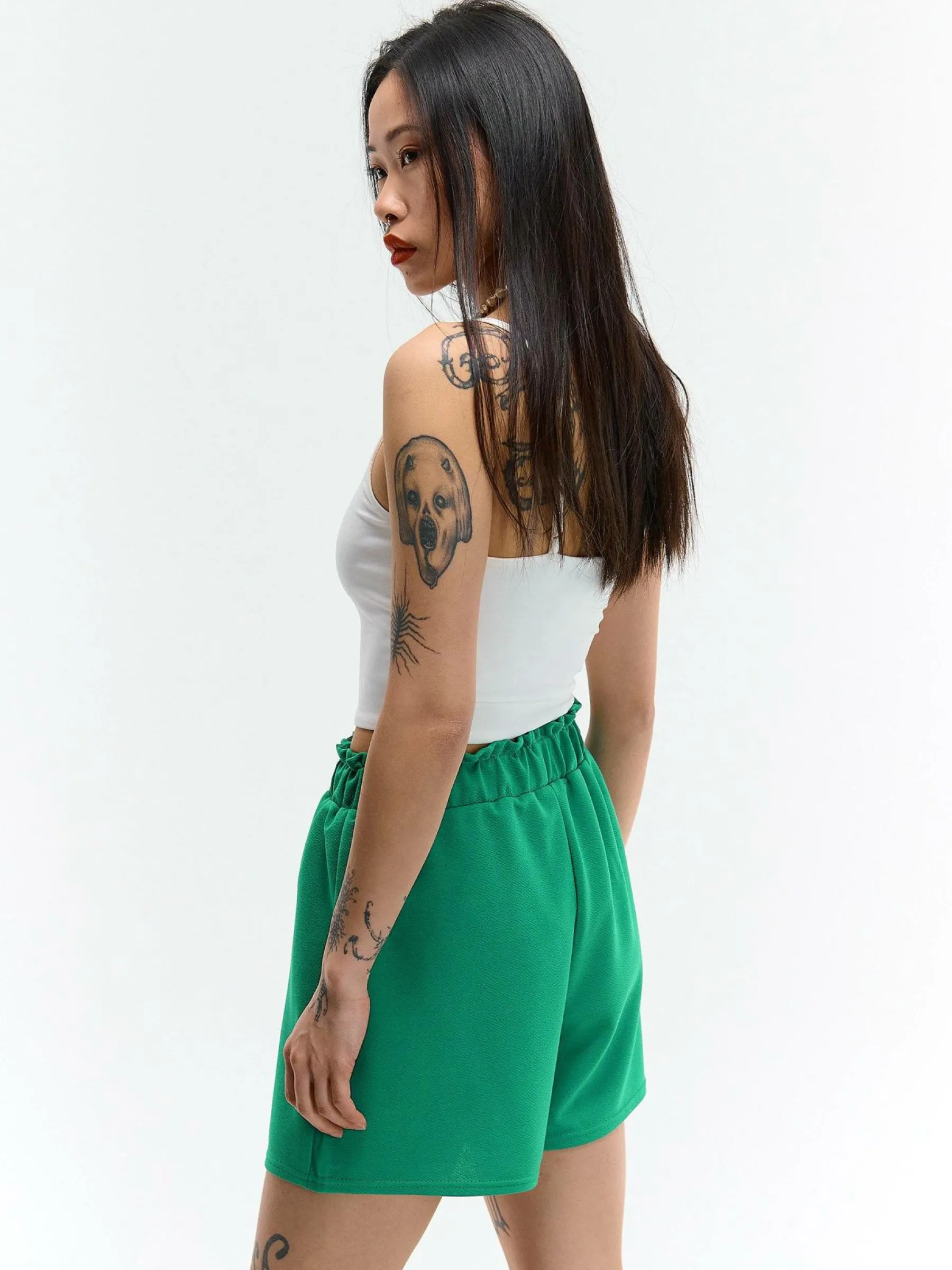 Kolor: zielonyKrój: paperbagTyp: spodenkiDługość: krótkiPattern style: pojedynczy kolorDetal: z elastyczną opaską…