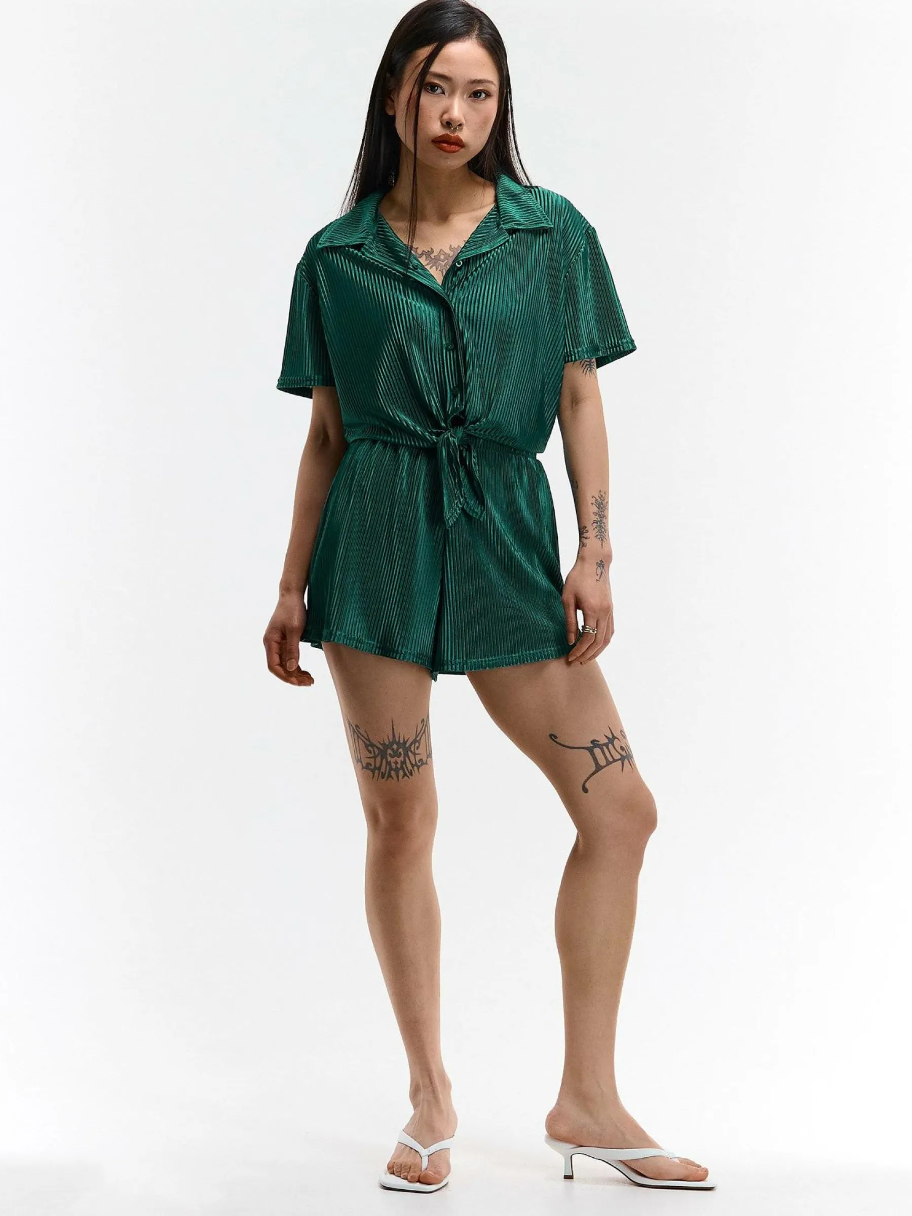 Kolor: zielonyKrój: straightTyp: spodenkiDługość: krótkiPattern style: pojedynczy kolor, żebrowanyDetal: z elastyc…