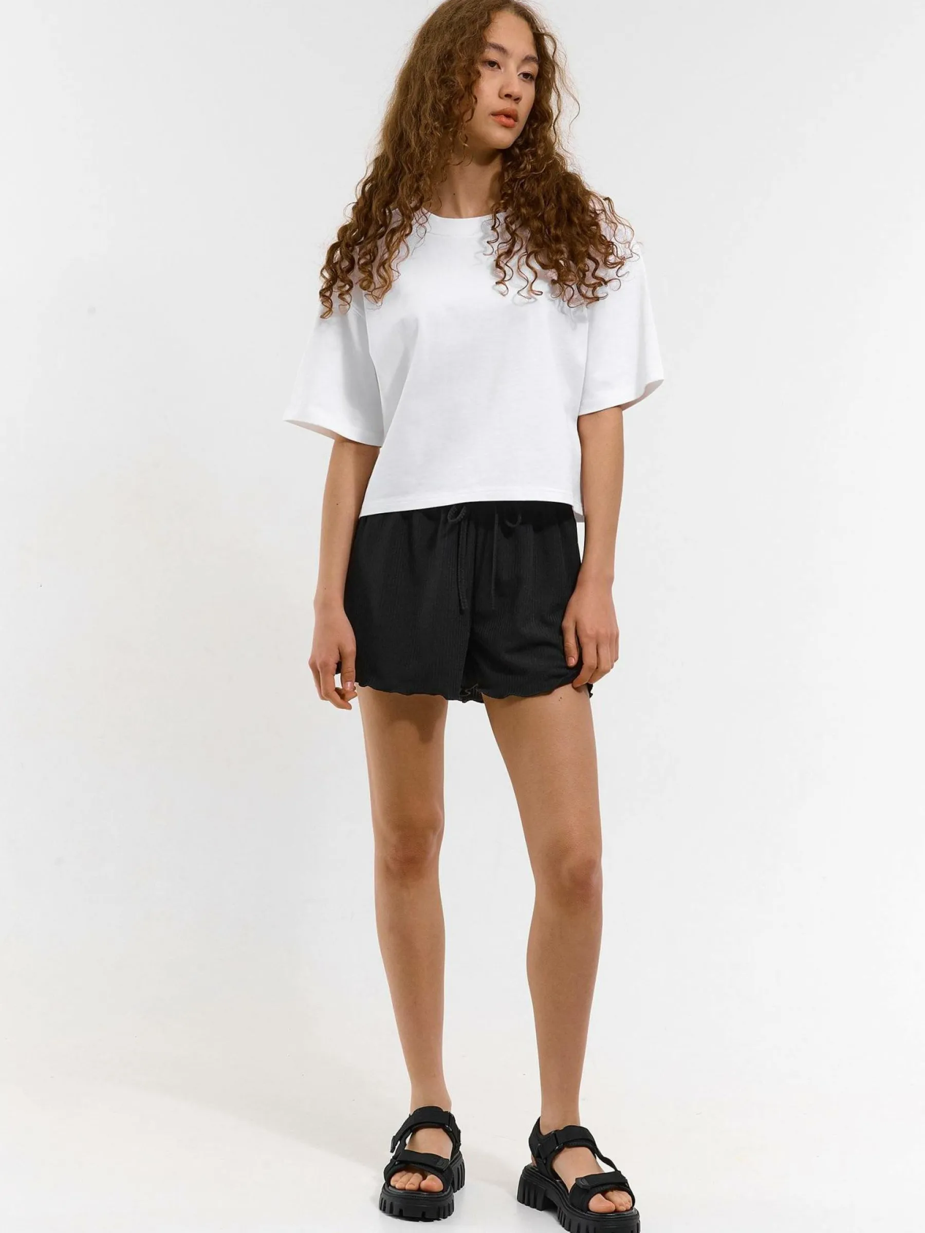 Kolor: czarnyKrój: straightTyp: spodenkiDługość: krótkiPattern style: pojedynczy kolorMateriał: syntetycznePłeć:…