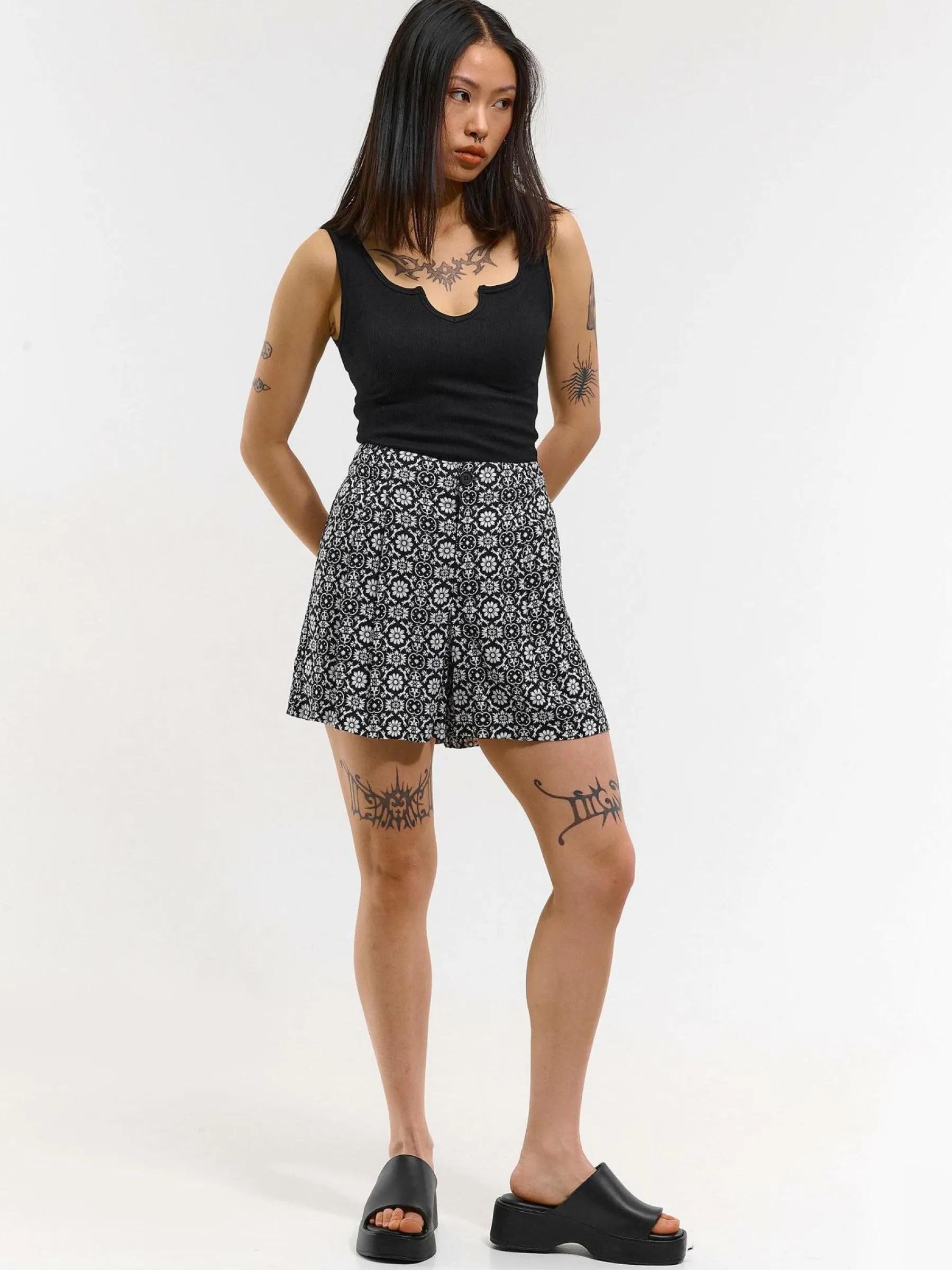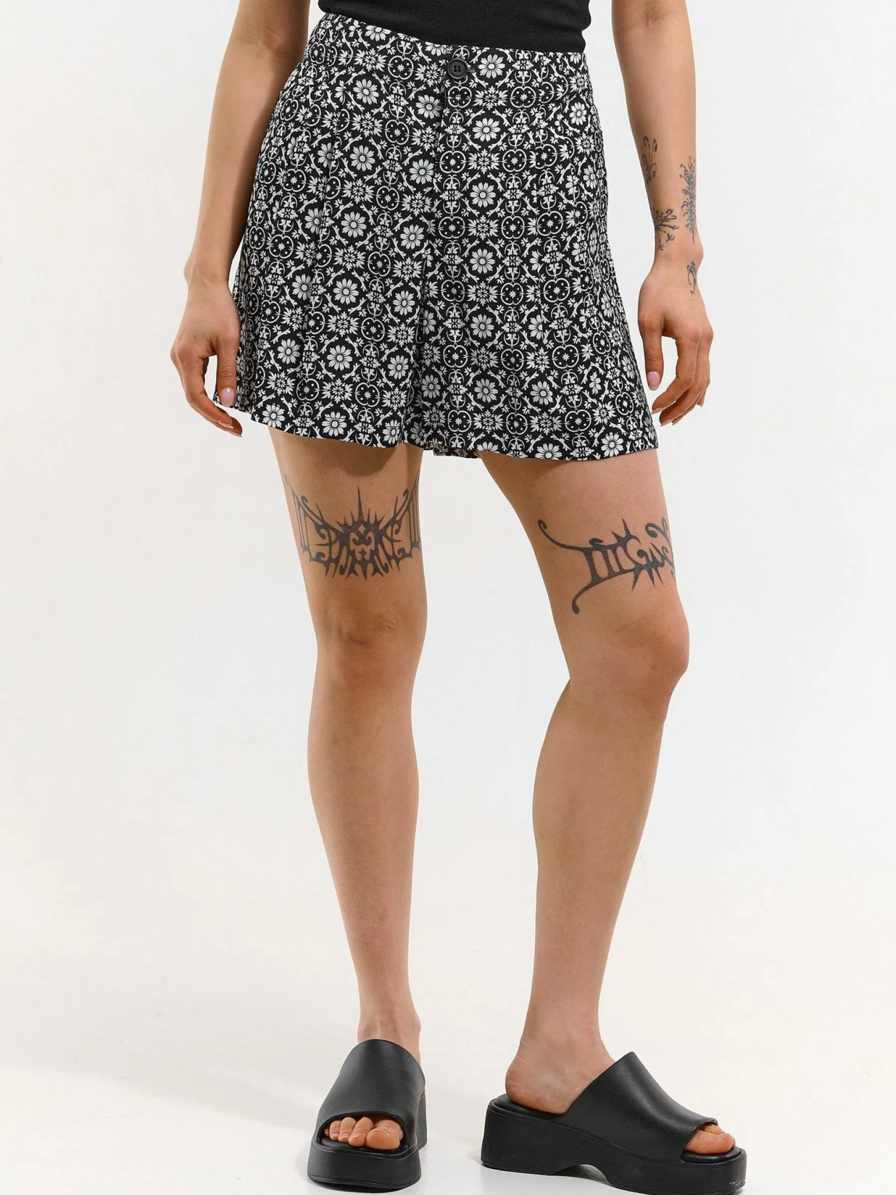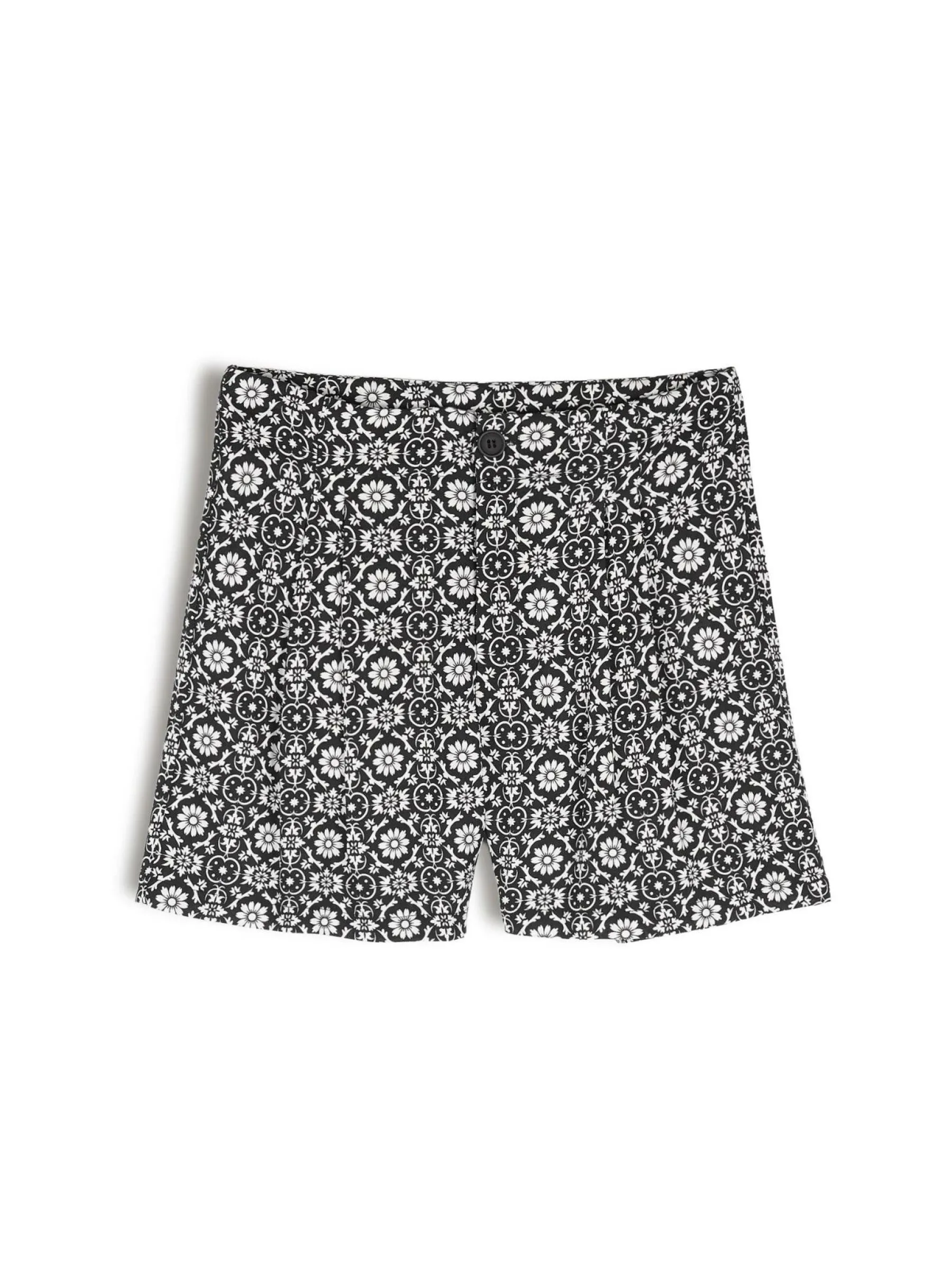 Kolor: czarnyKrój: straightTyp: spodenkiDługość: krótkiPattern style: wzorzysteMateriał: wiskozaPłeć: kobietyOka…