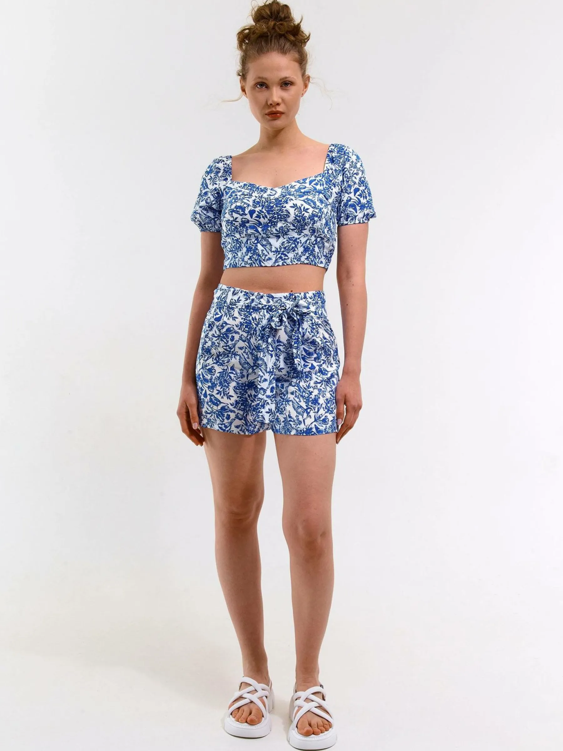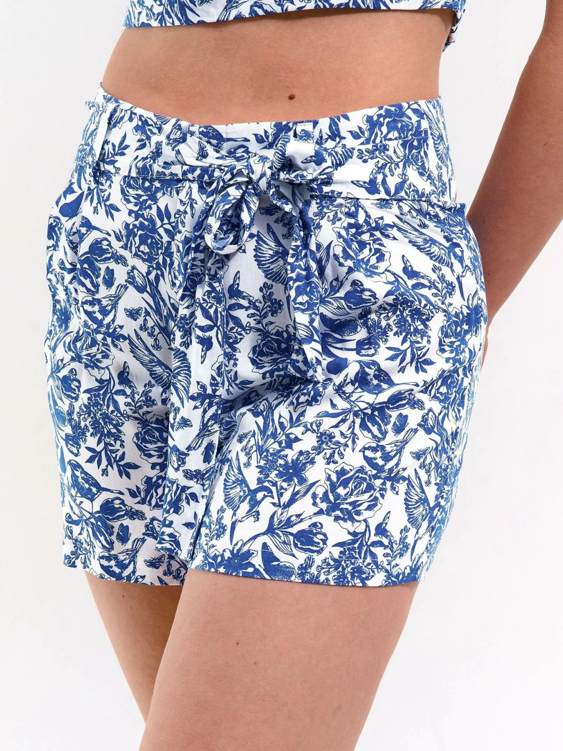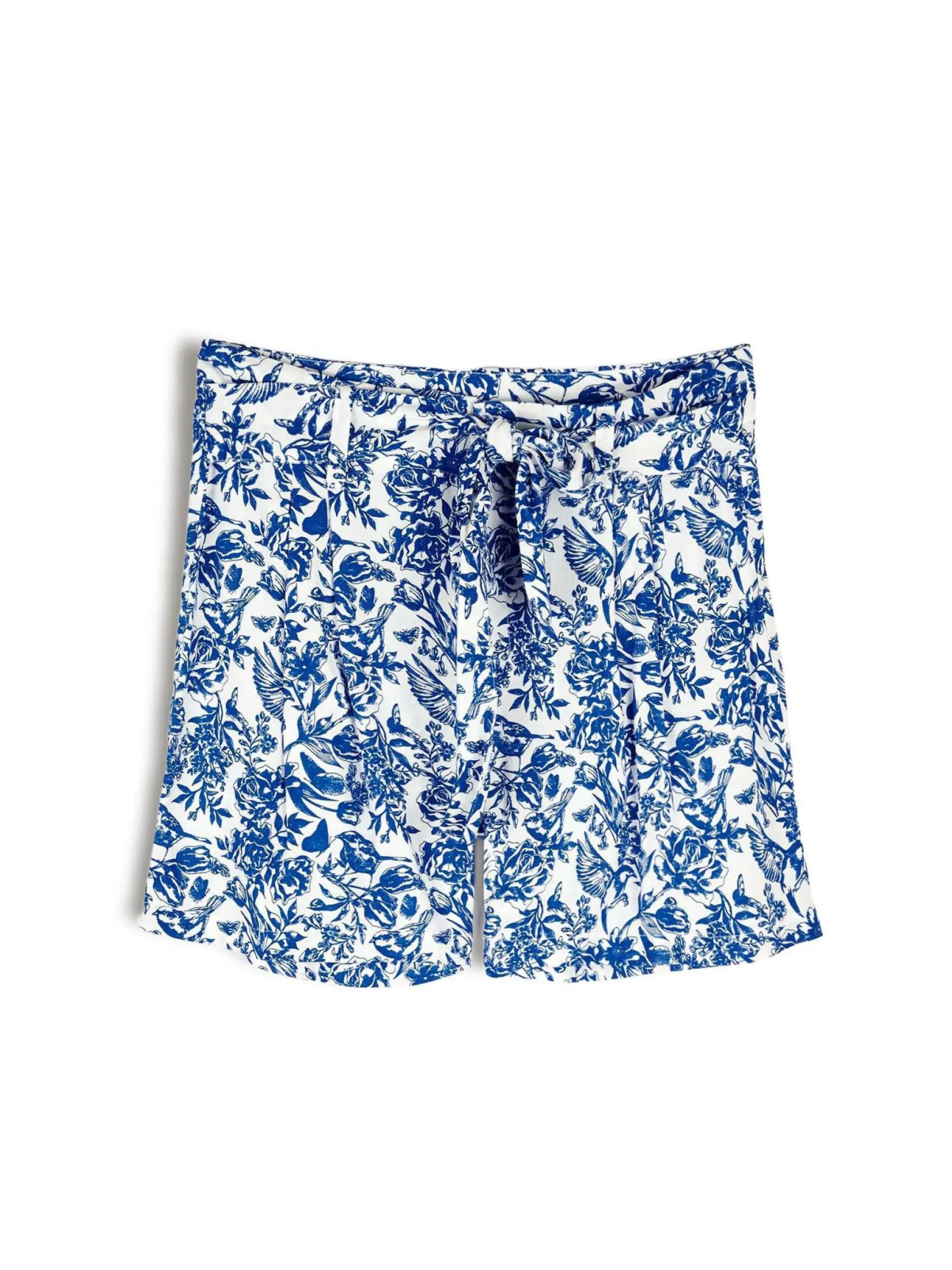 Kolor: niebieskiKrój: z wysokim stanemTyp: spodenkiDługość: krótkiPattern style: wzorzysteDetal: z paskiem, na zame…