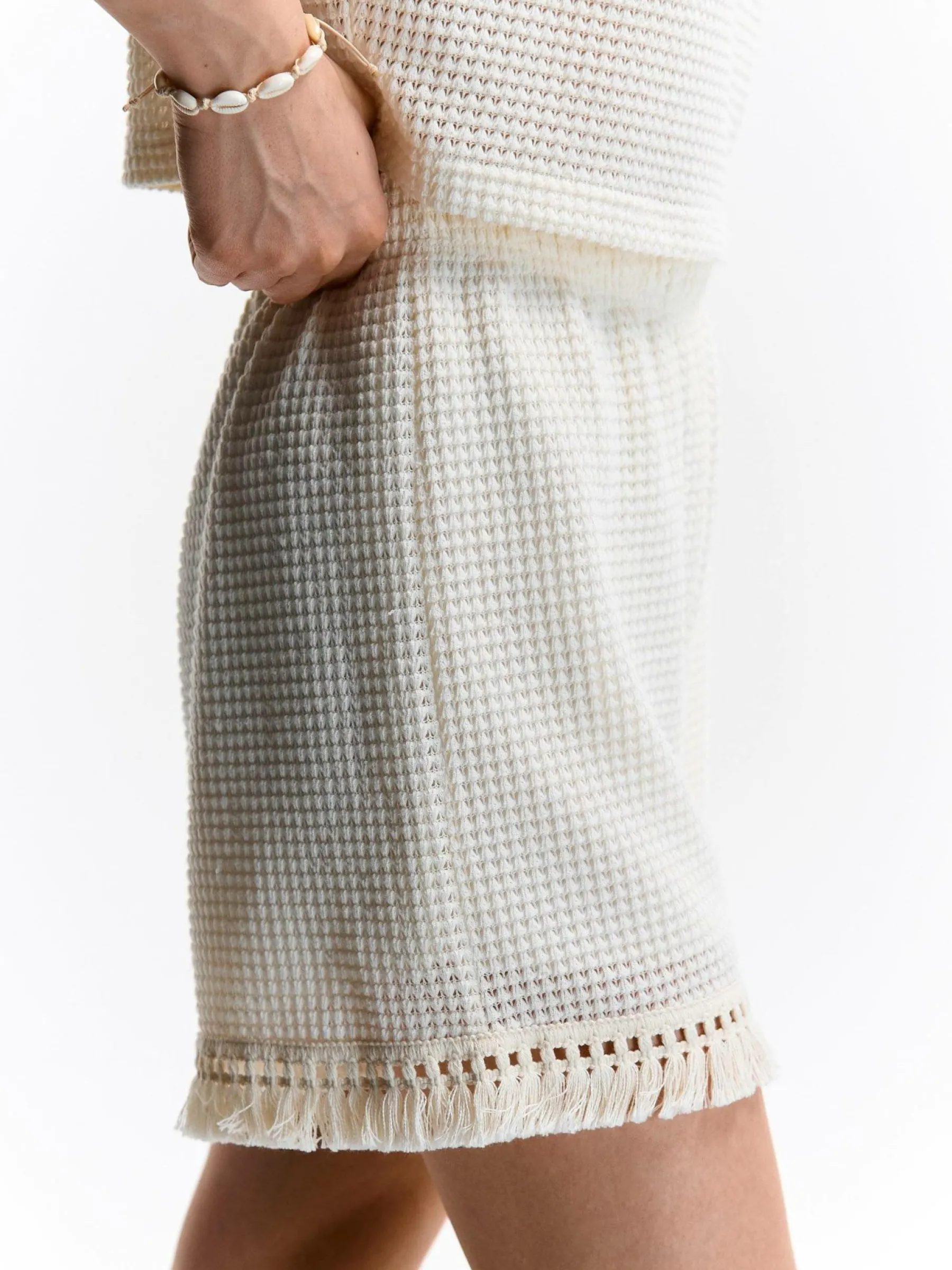 Kolor: beżowyKrój: straightTyp: spodenkiDługość: krótkiPattern style: pojedynczy kolor, strukturowaneDetal: z frę…