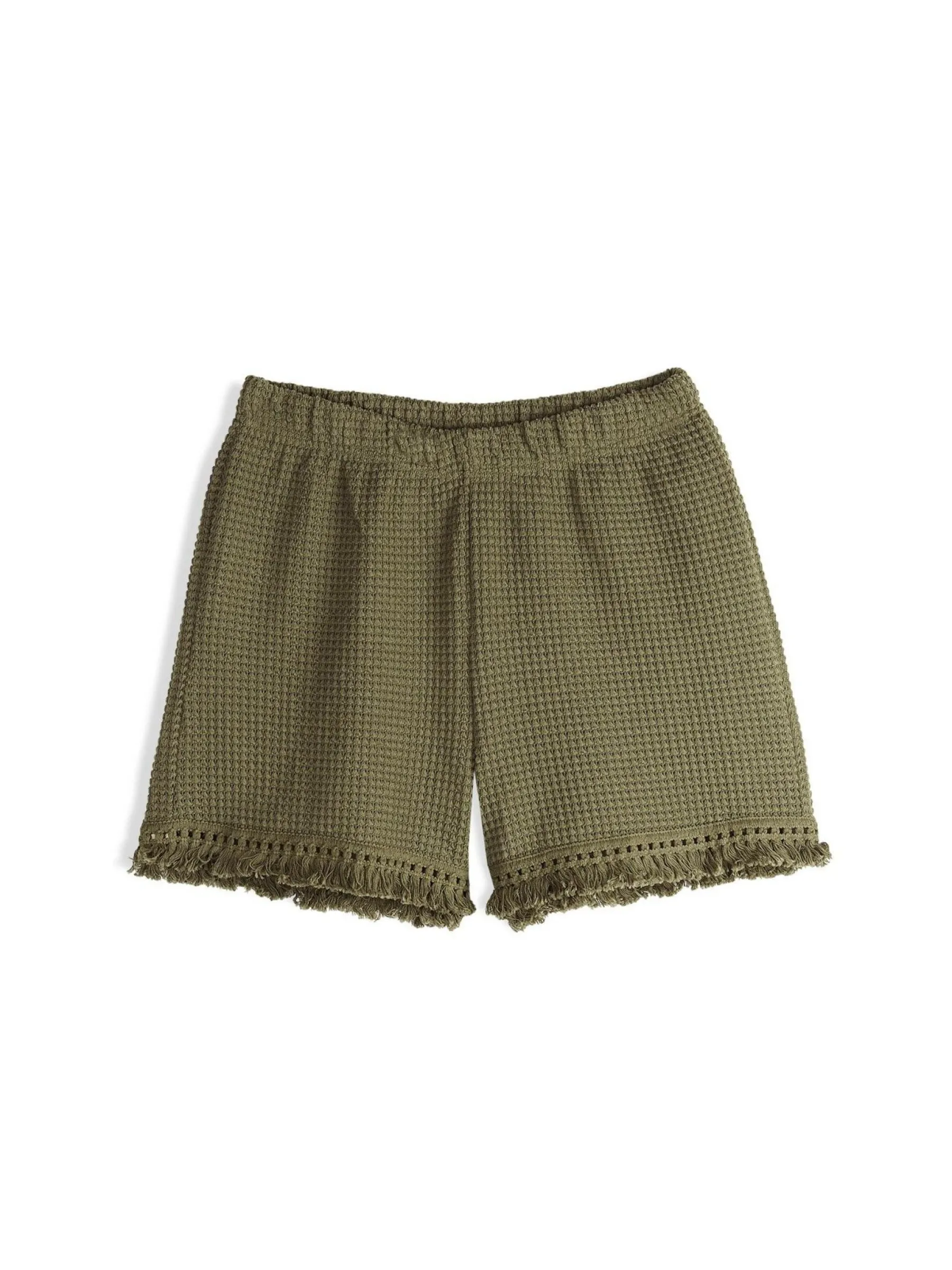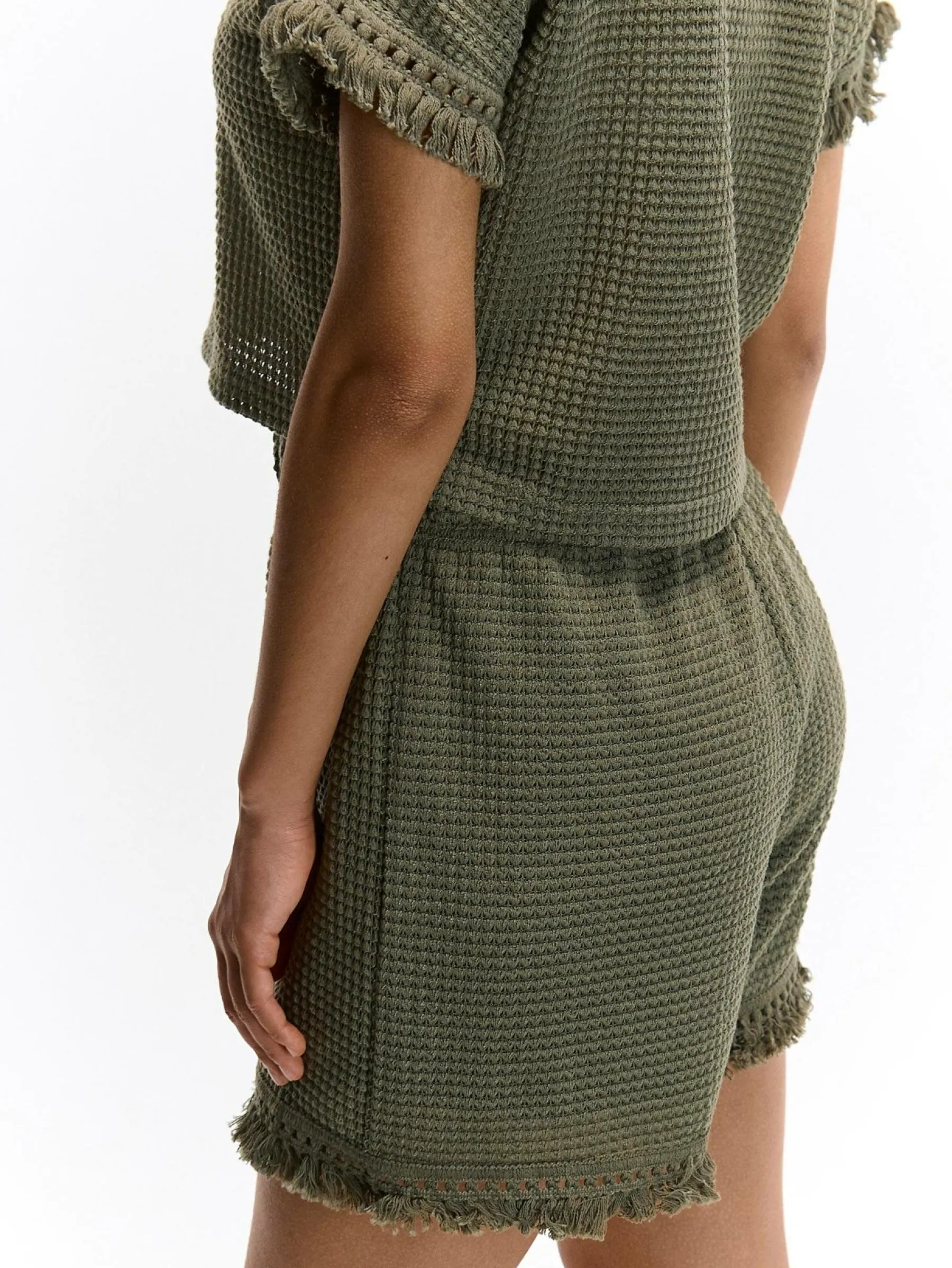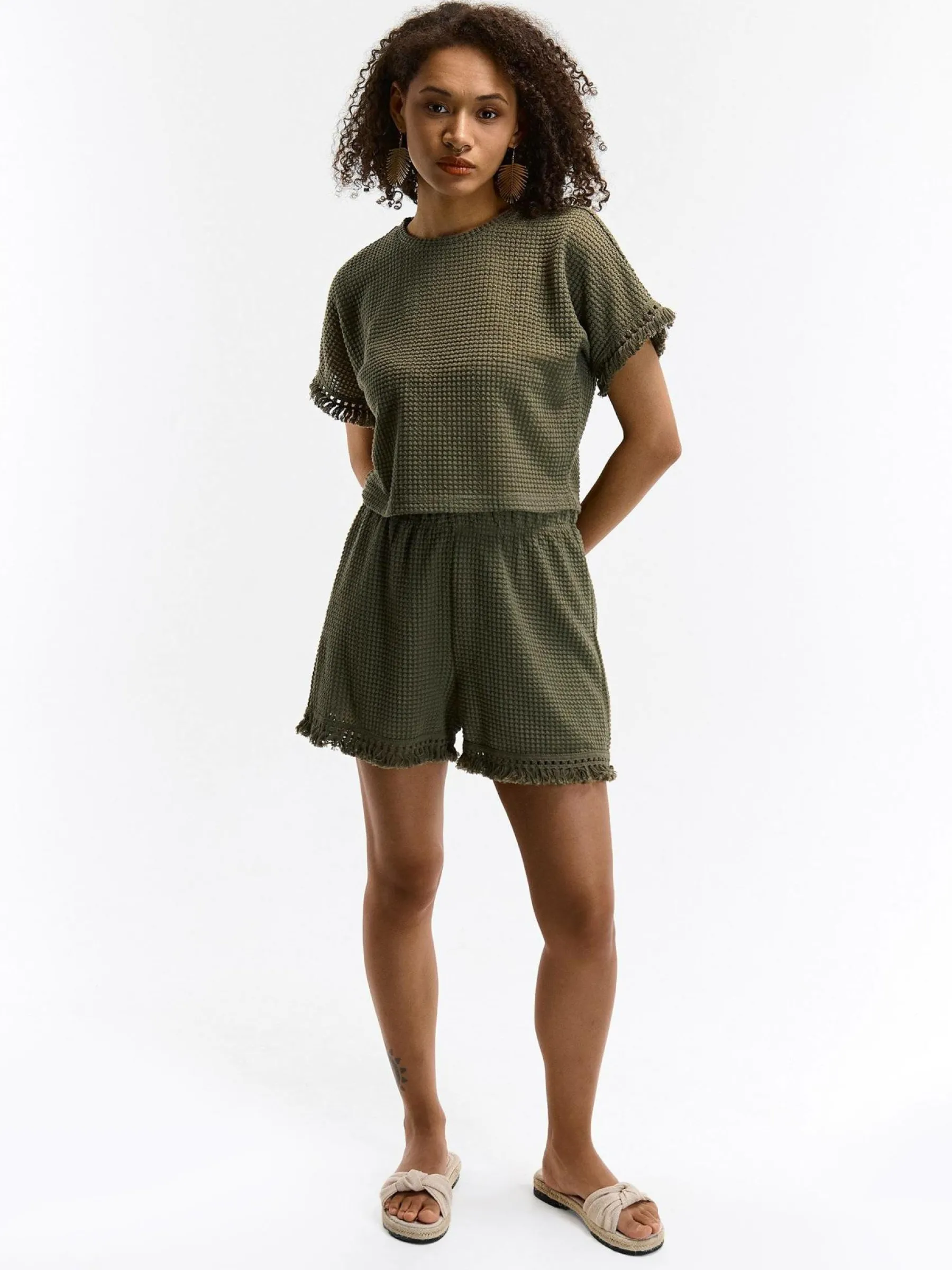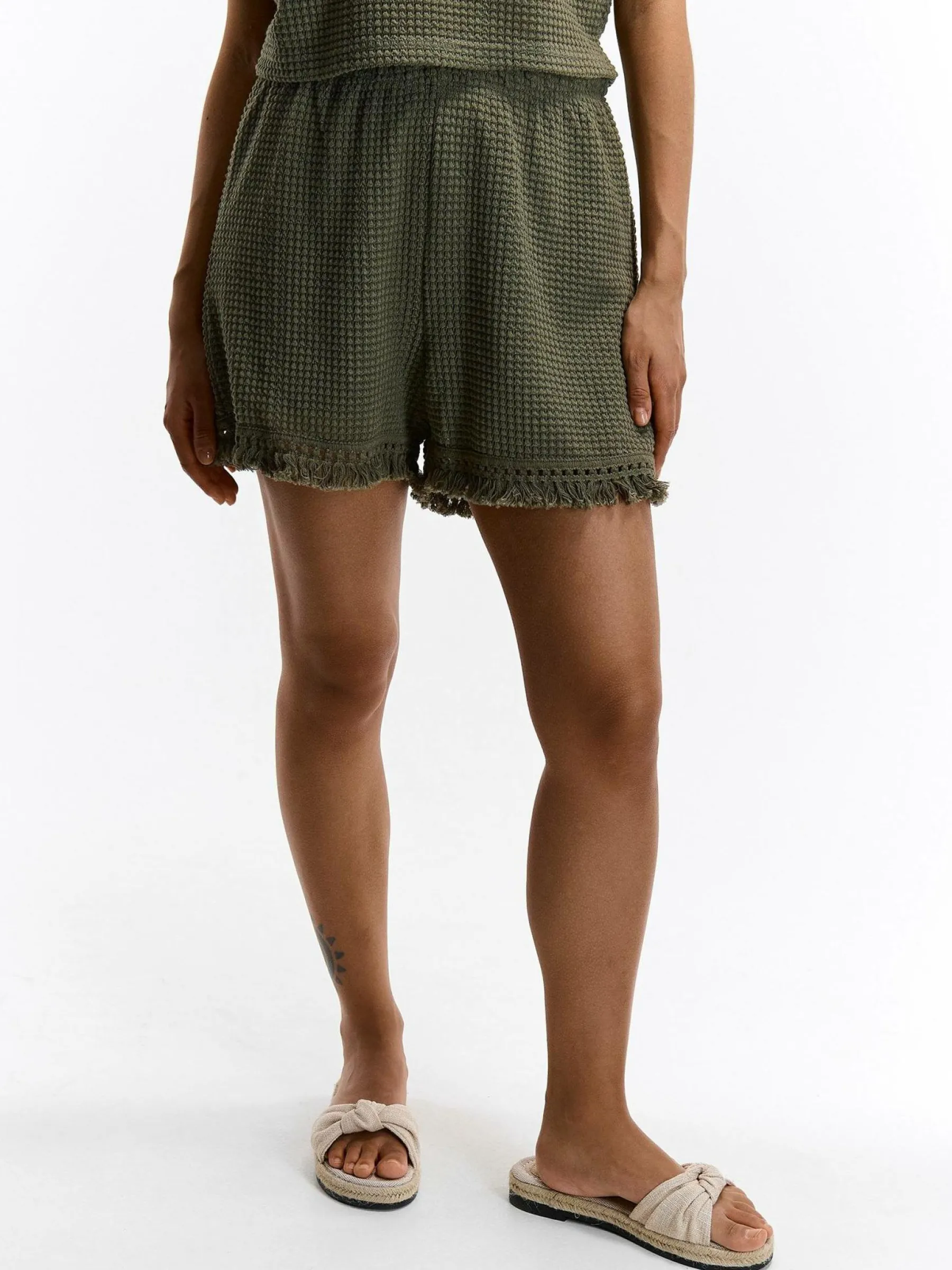Kolor: khakiKrój: straightTyp: spodenkiDługość: krótkiPattern style: pojedynczy kolor, strukturowaneDetal: z frędz…
