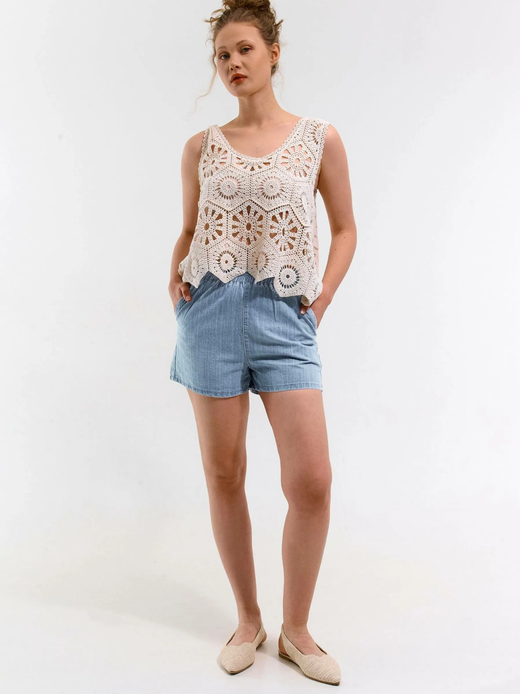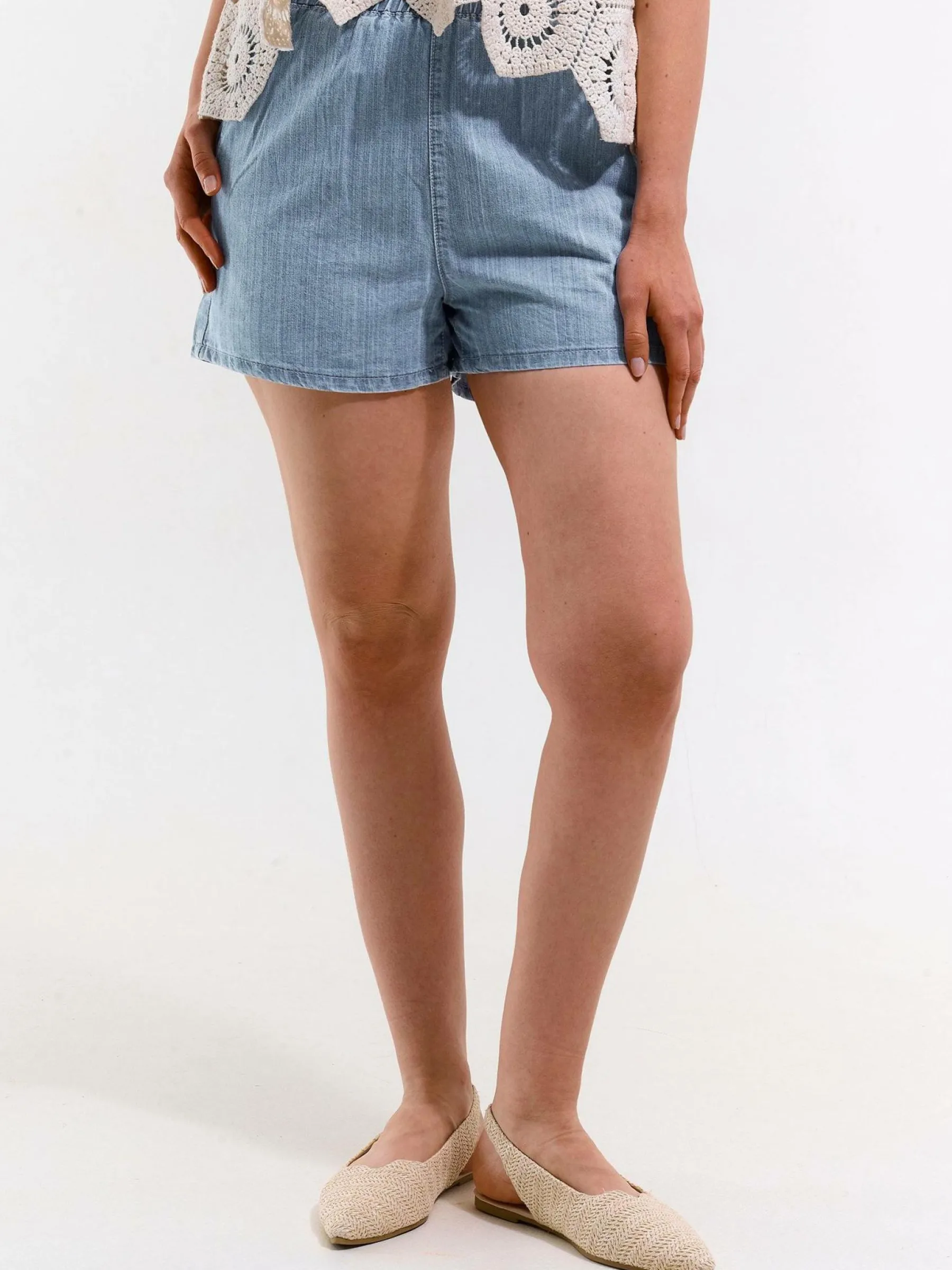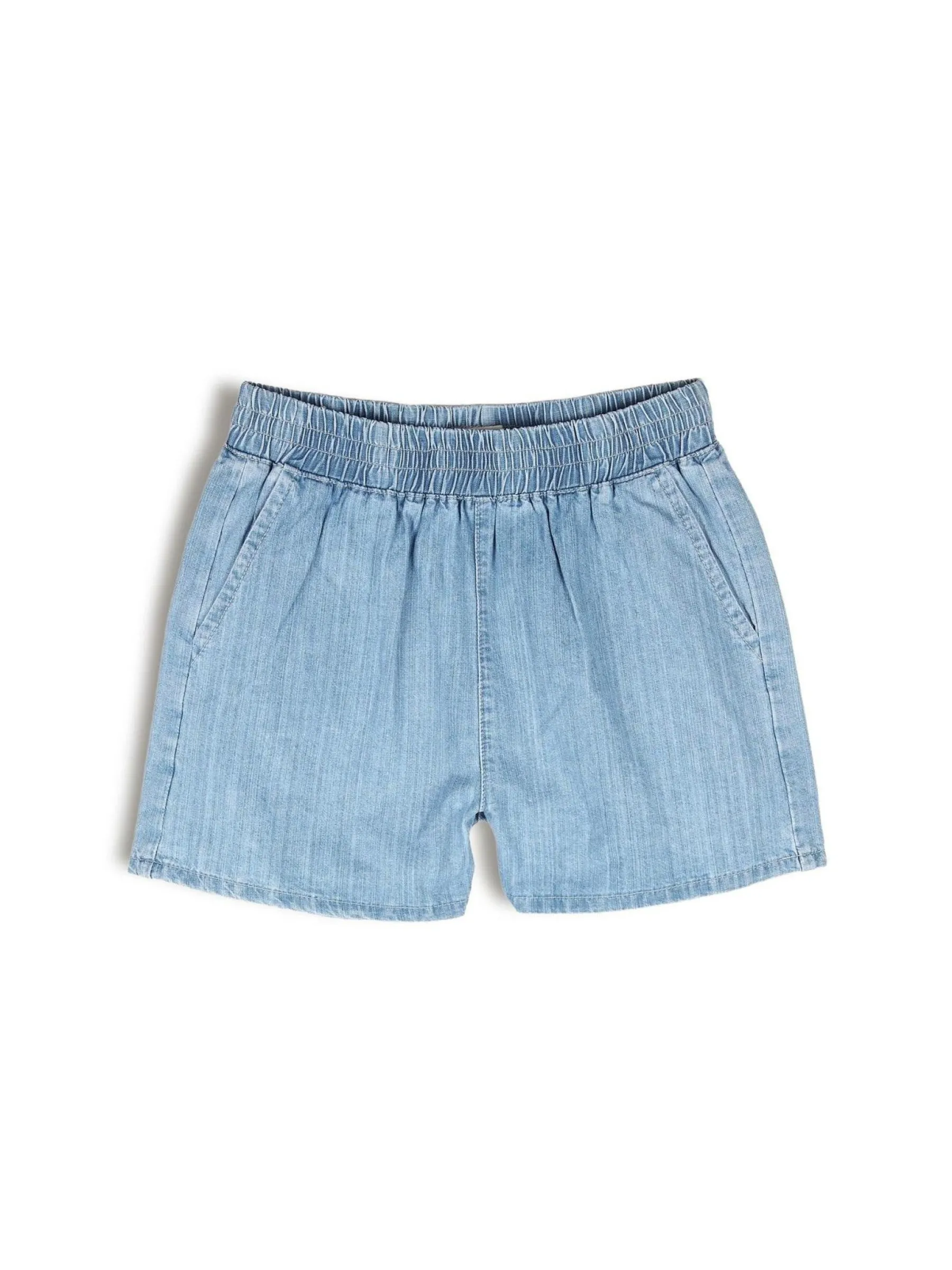 Kolor: niebieskiKrój: straightTyp: spodenkiDługość: krótkiPattern style: pojedynczy kolorDetal: z elastyczną opask…