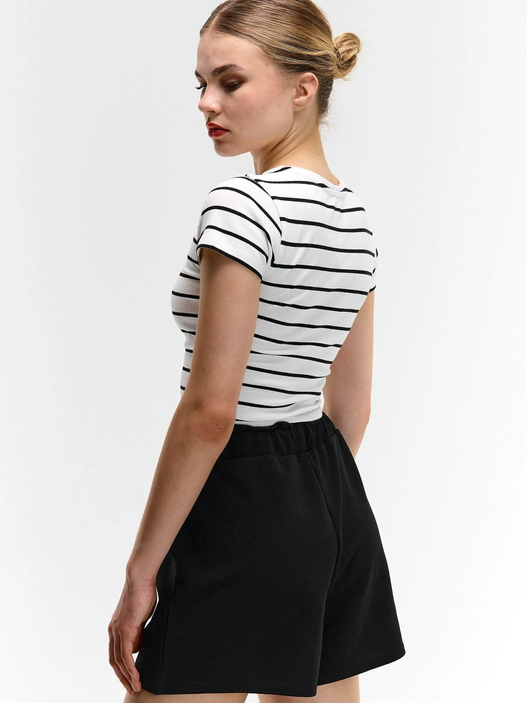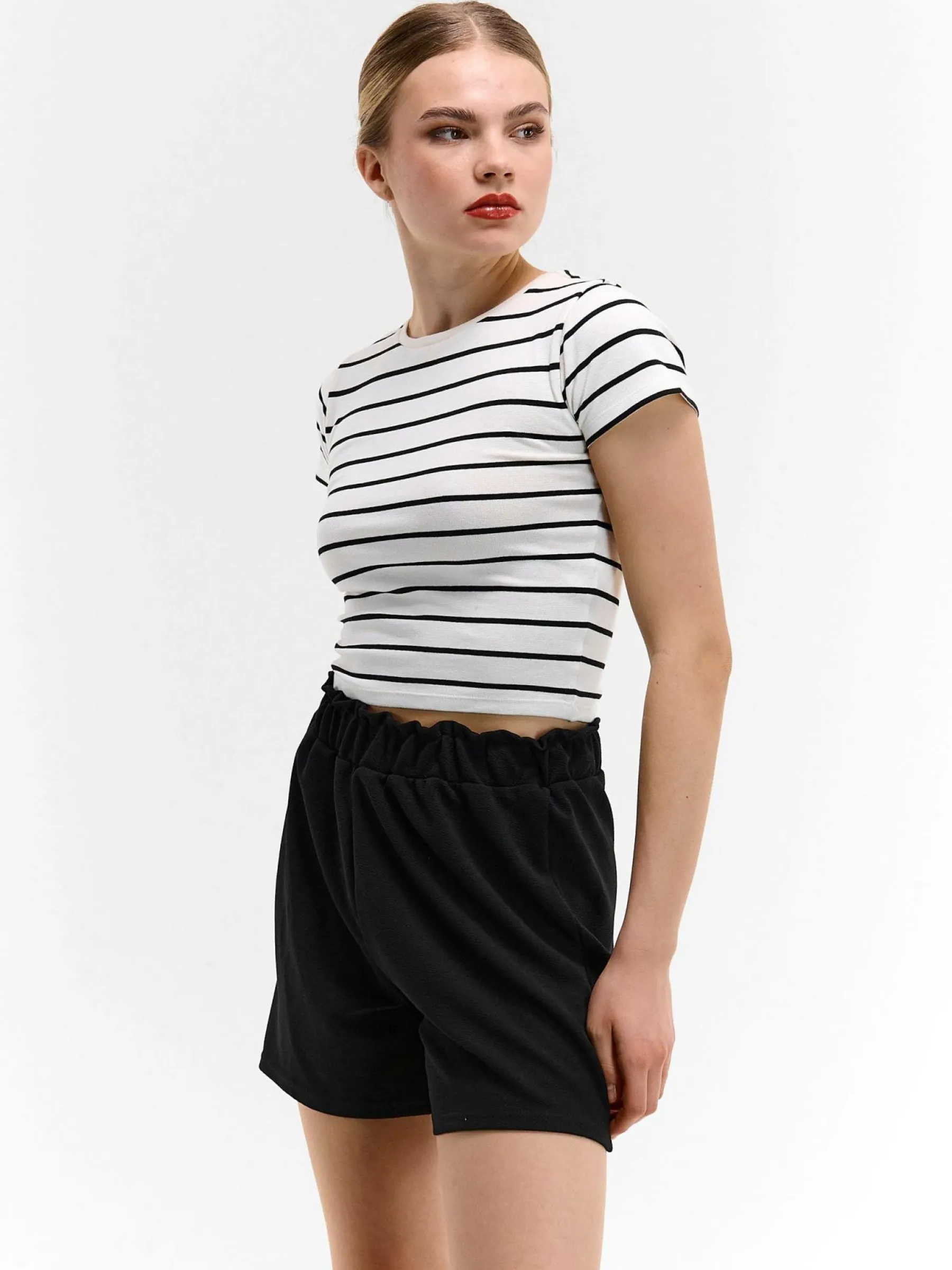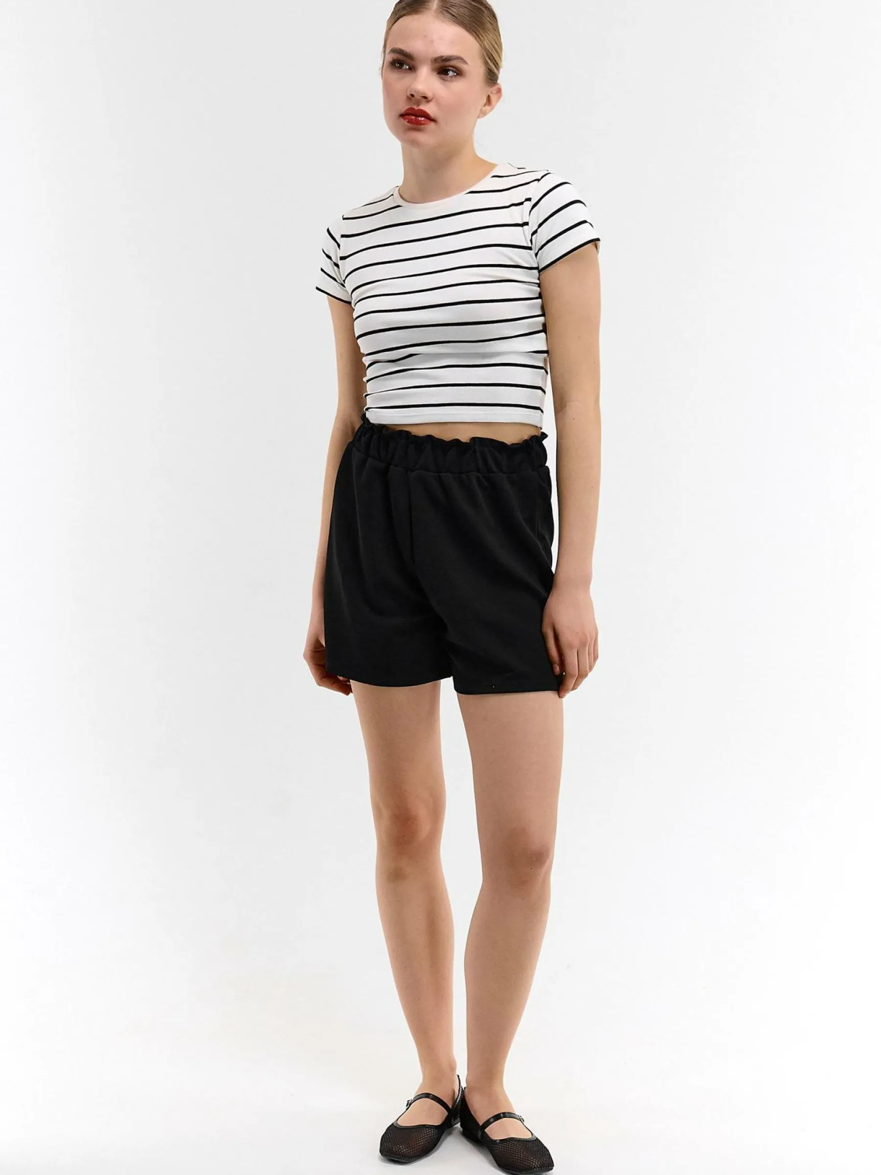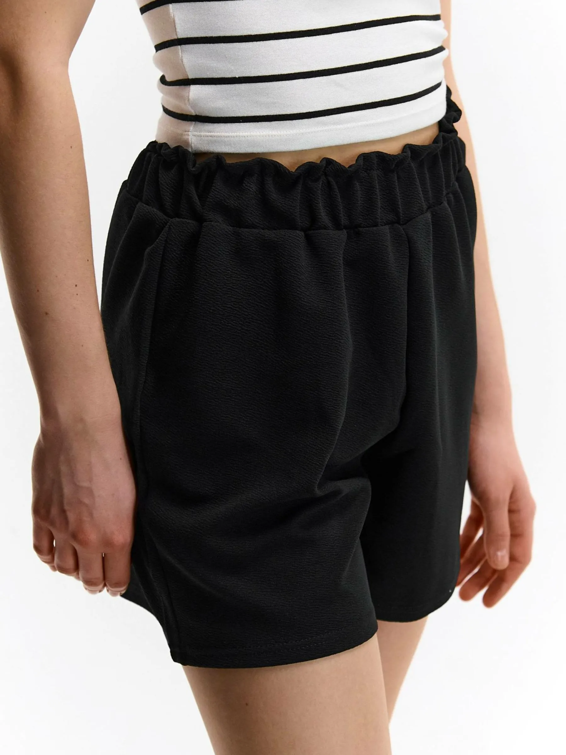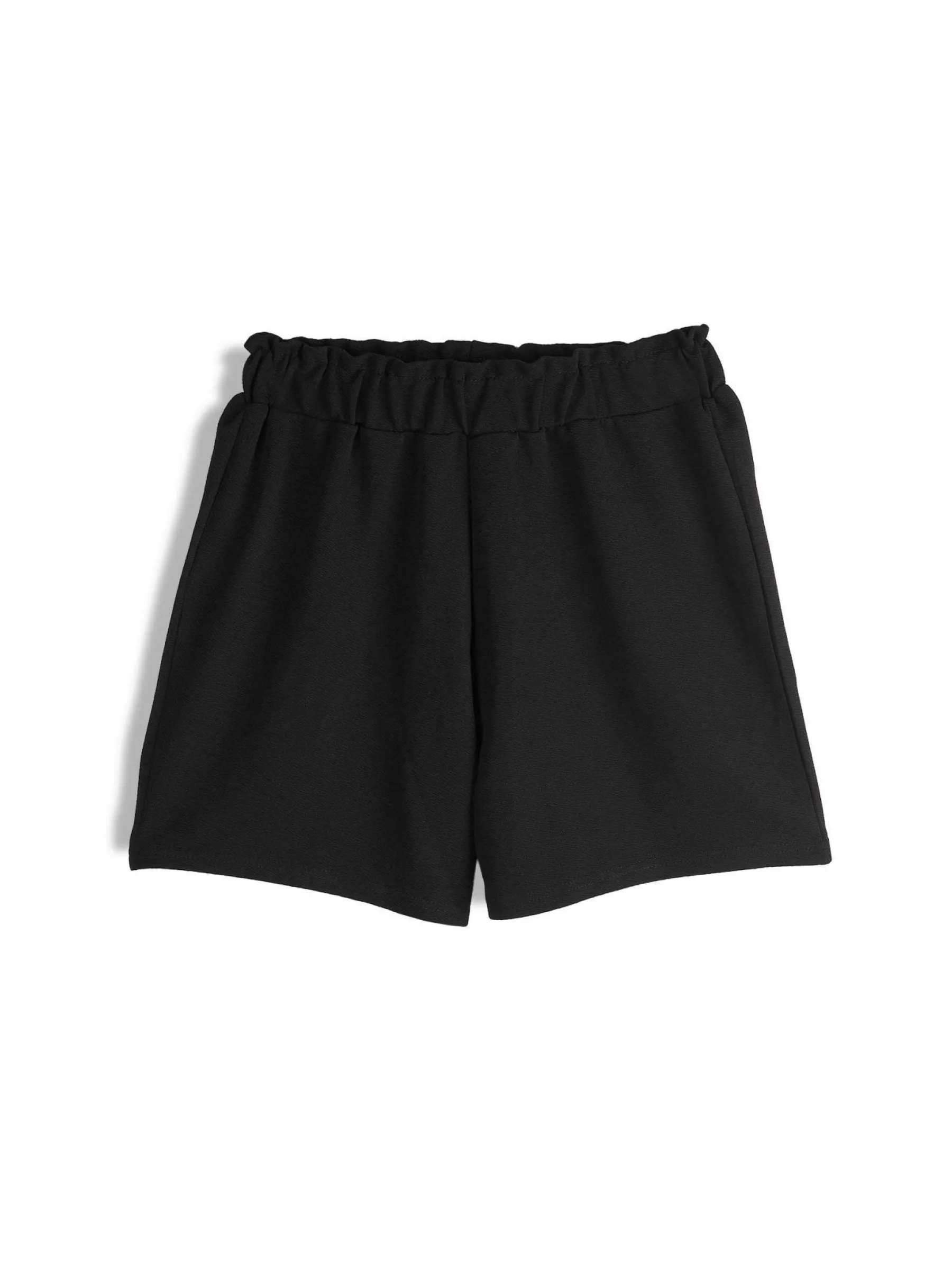 Kolor: czarnyKrój: paperbagTyp: spodenkiDługość: krótkiPattern style: pojedynczy kolorDetal: z elastyczną opaskąM…