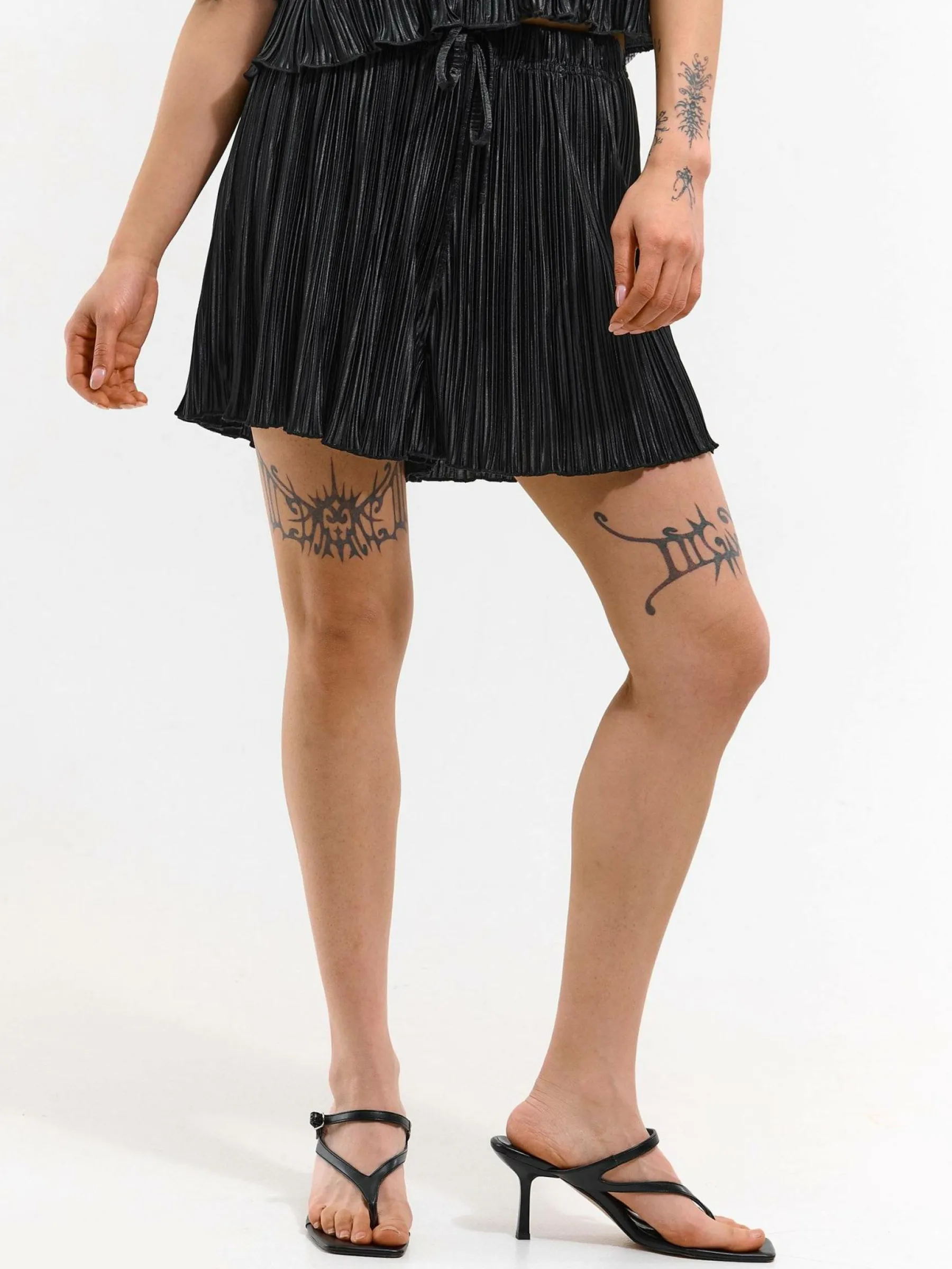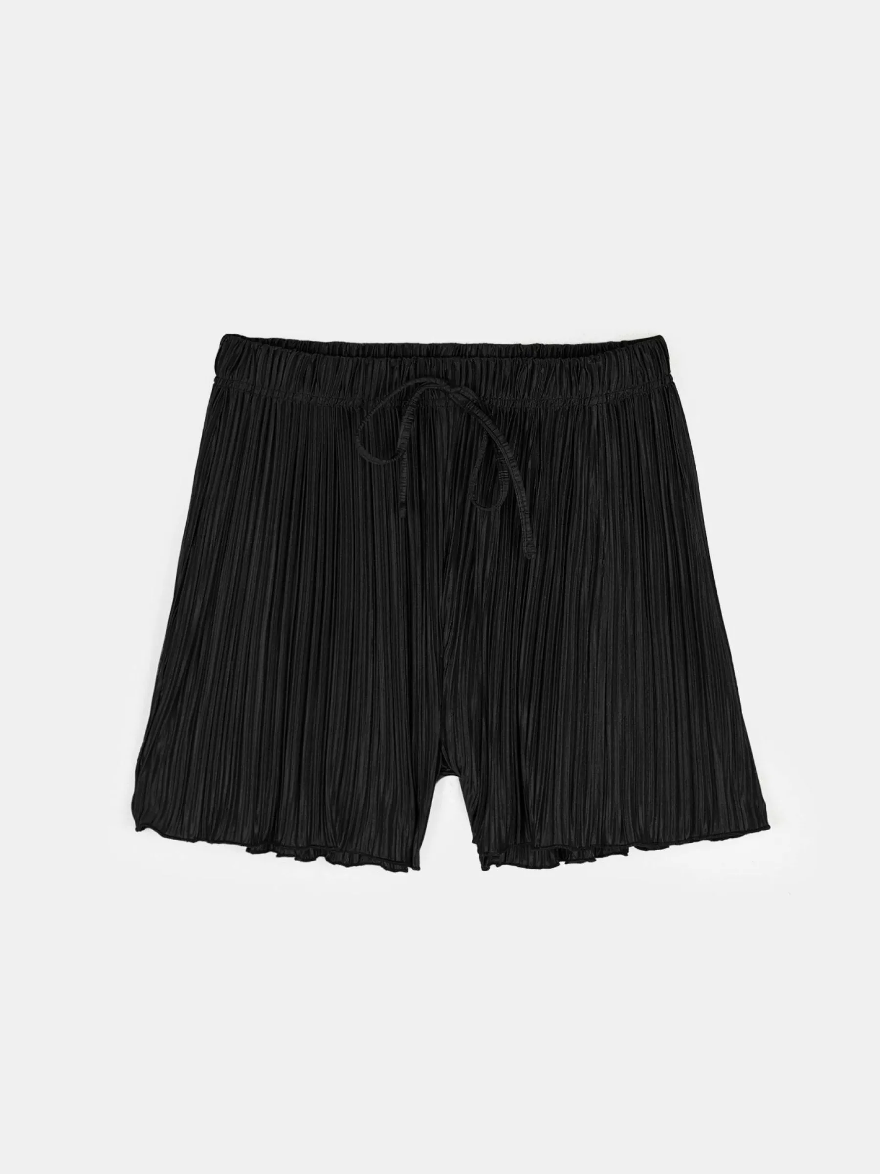 Kolor: czarnyKrój: plisowaneTyp: spodenkiDługość: krótkiPattern style: pojedynczy kolorDetal: ze sznurowaniemMateri…