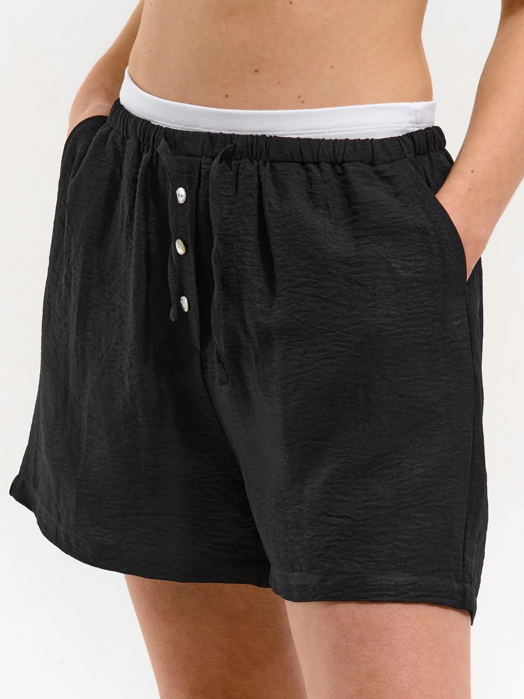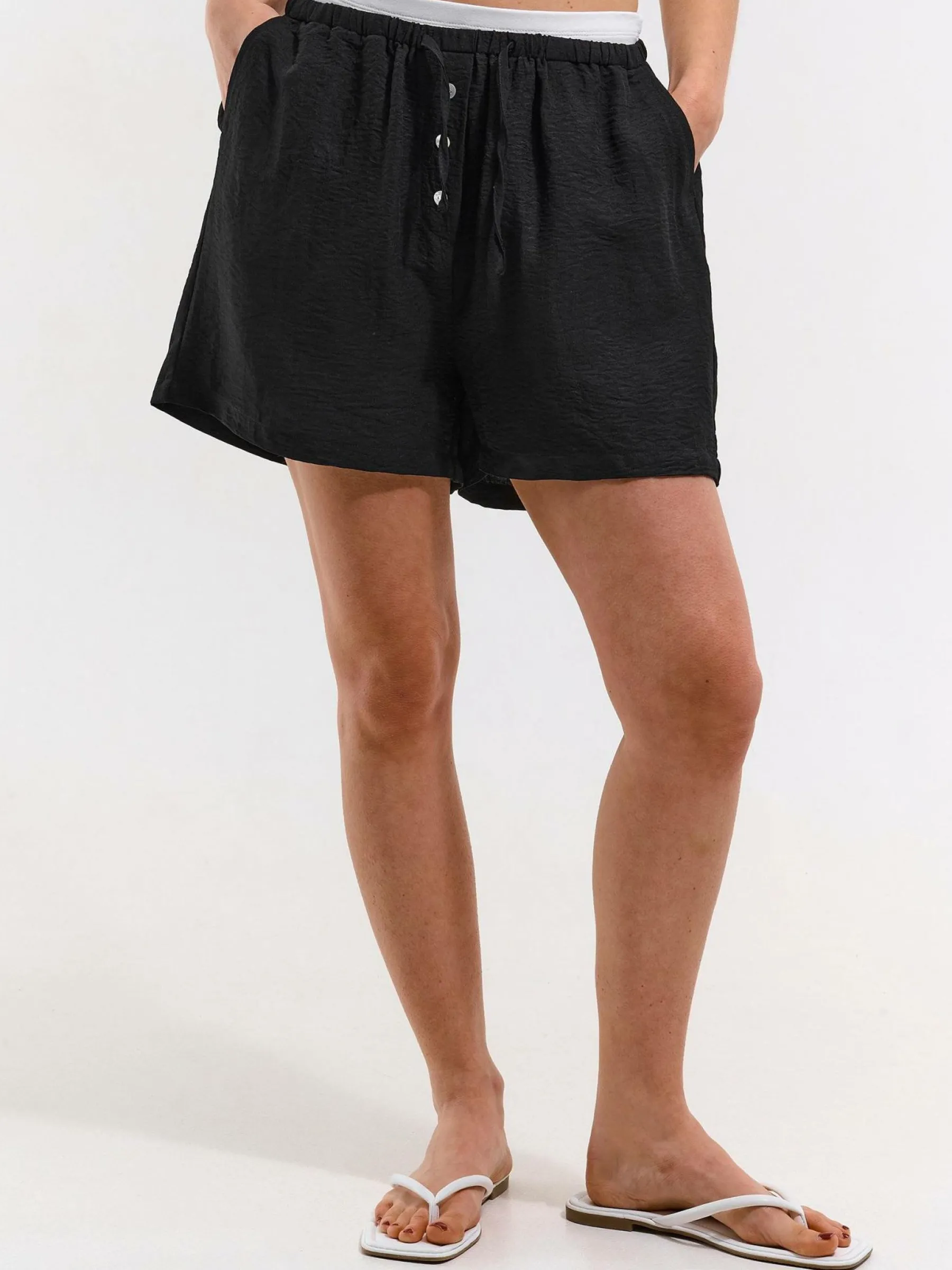 Kolor: czarnyKrój: straightTyp: spodenkiDługość: krótkiPattern style: pojedynczy kolorDetal: ze sznurowaniem, na gu…