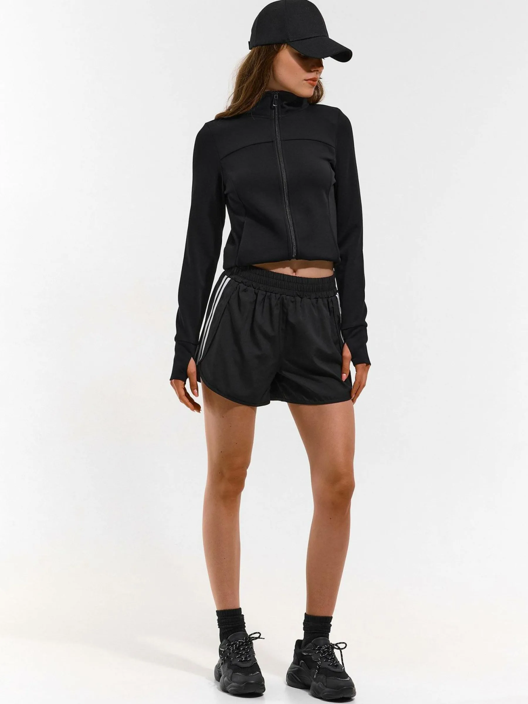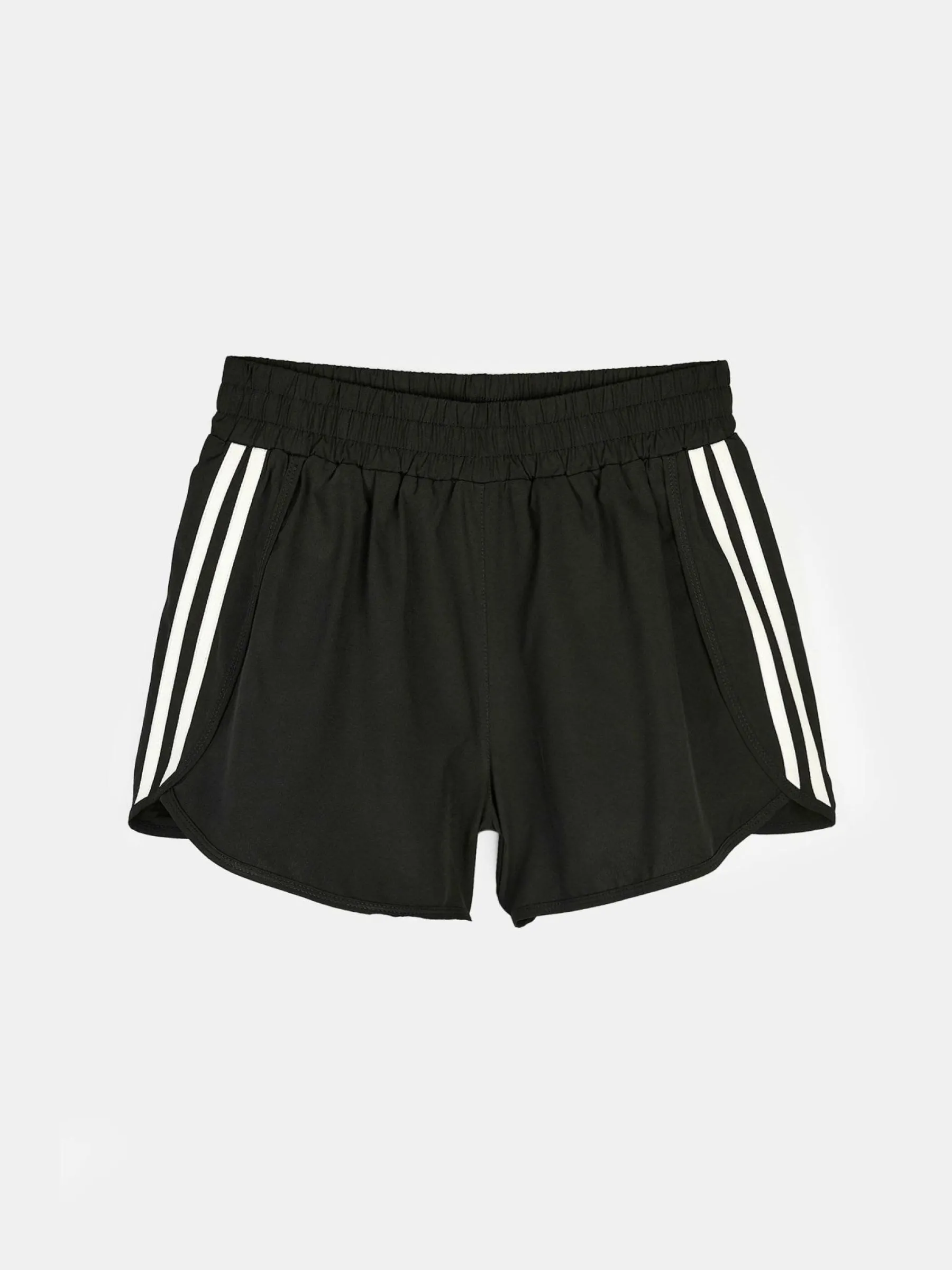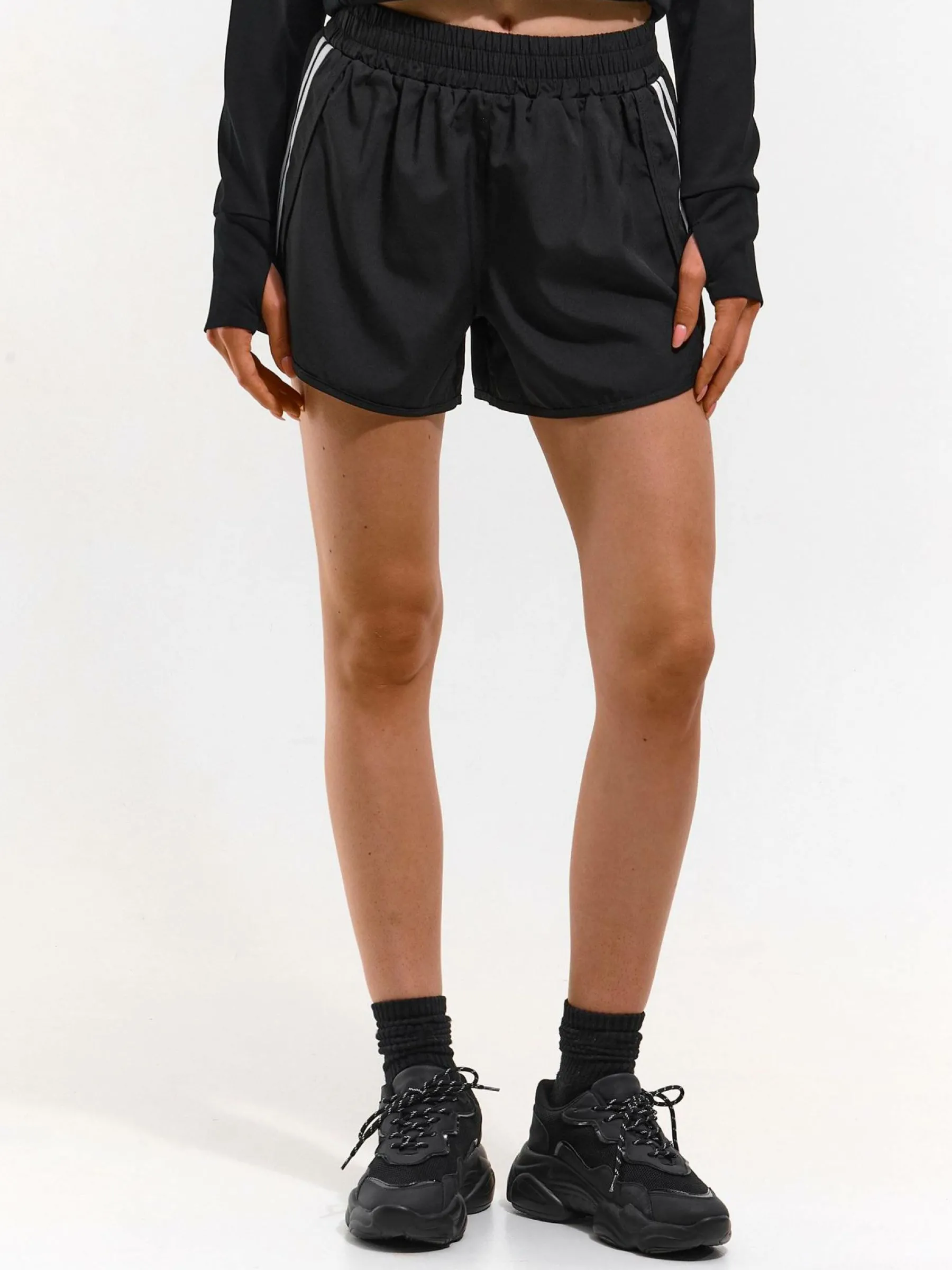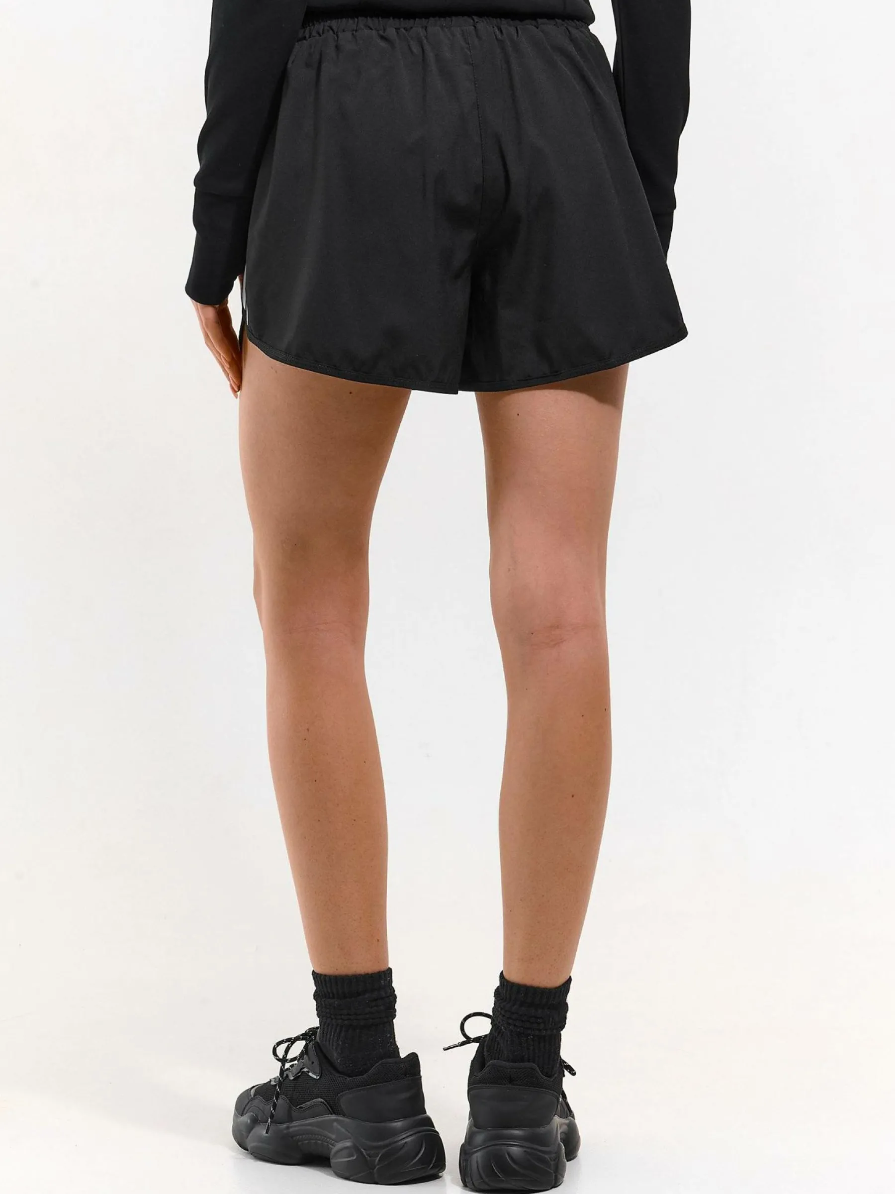 Kolor: czarnyKrój: straightTyp: spodenkiDługość: krótkiPattern style: pojedynczy kolorDetal: z paskiemMateriał: sy…