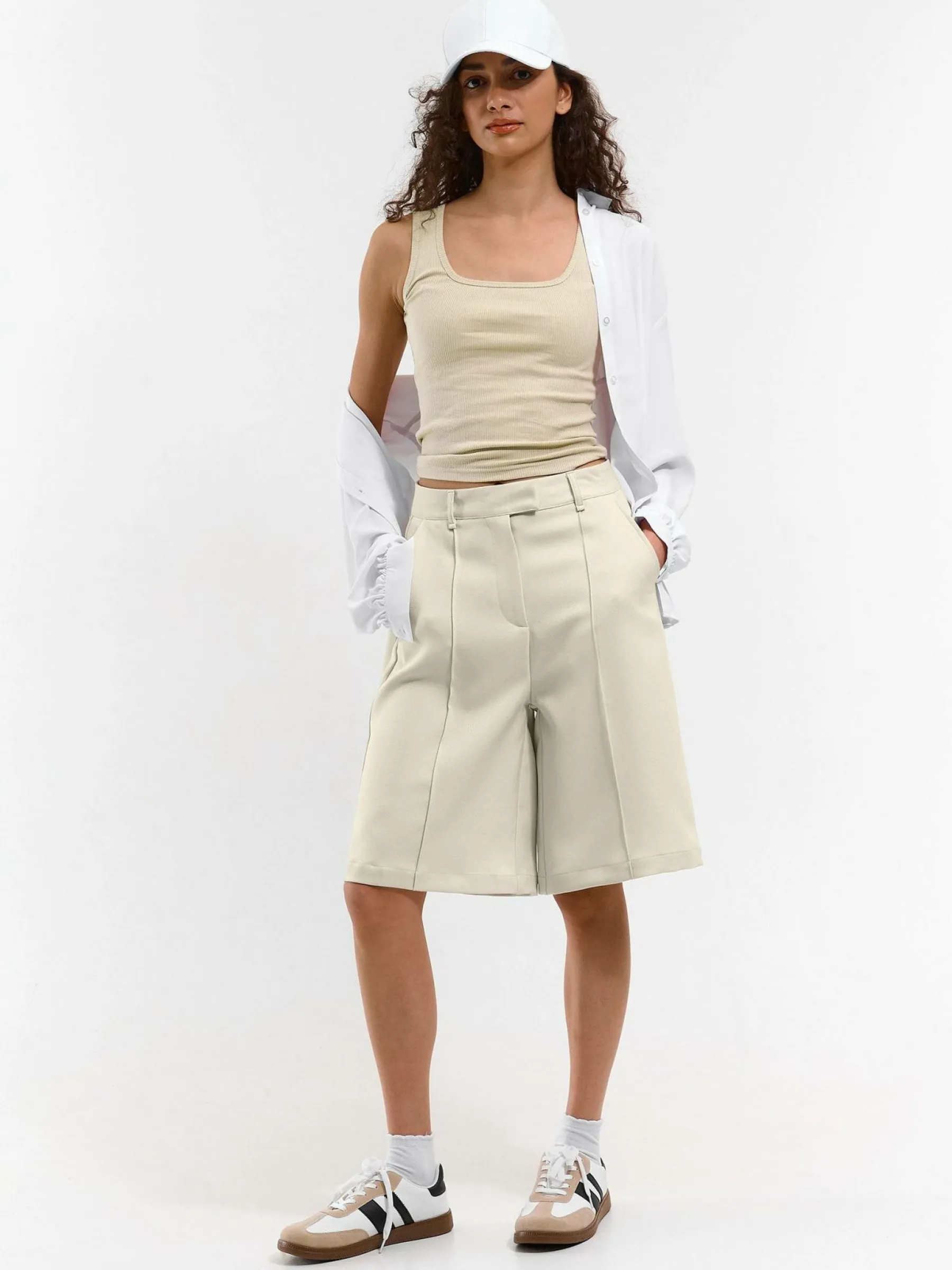 Kolor: beżowyKrój: straightTyp: spodenkiDługość: krótkiPattern style: pojedynczy kolorDetal: na zamekMateriał: sy…