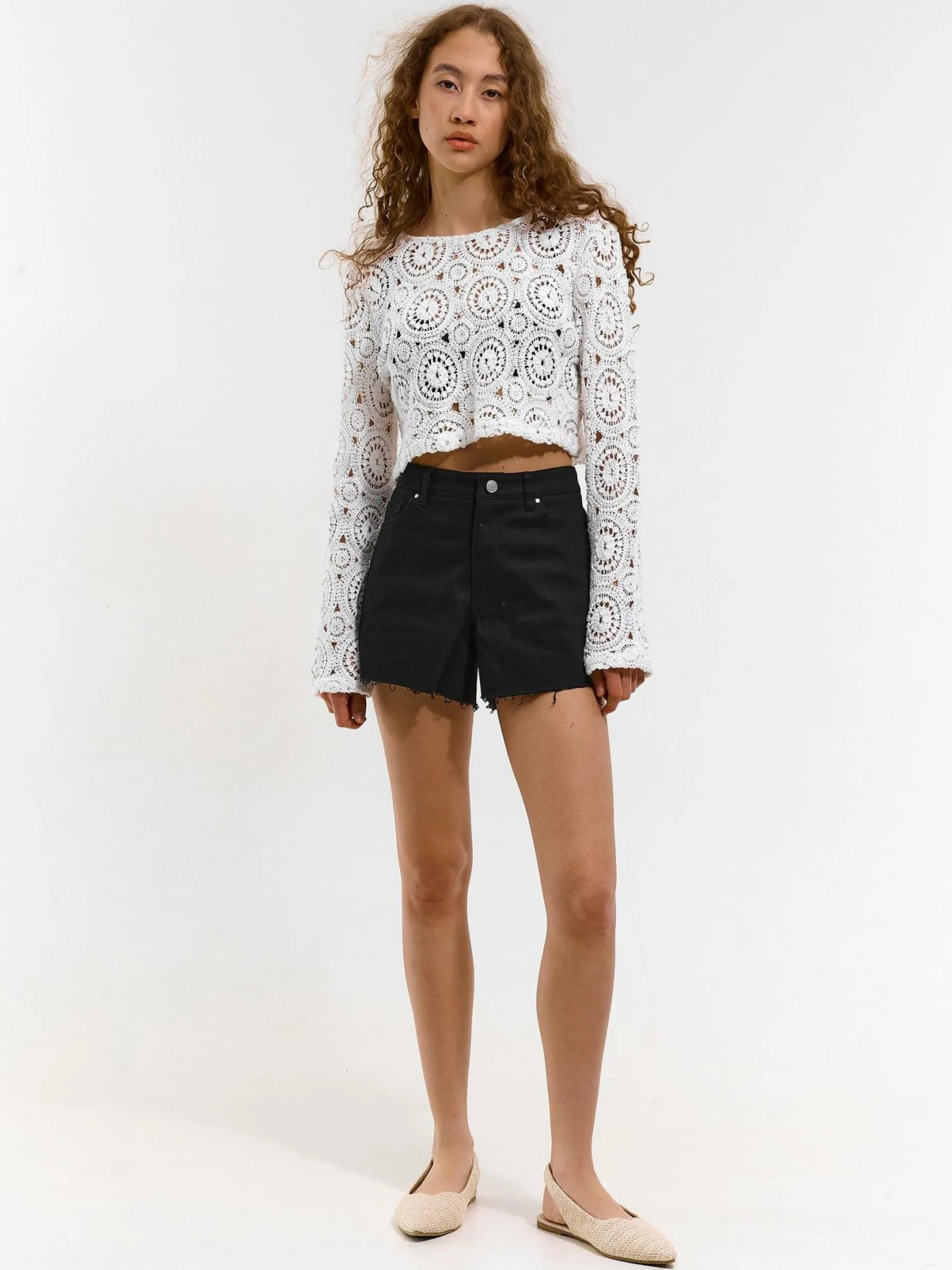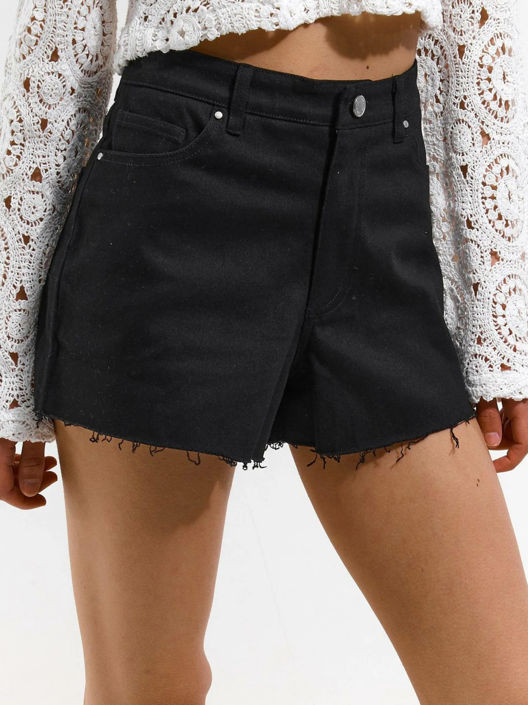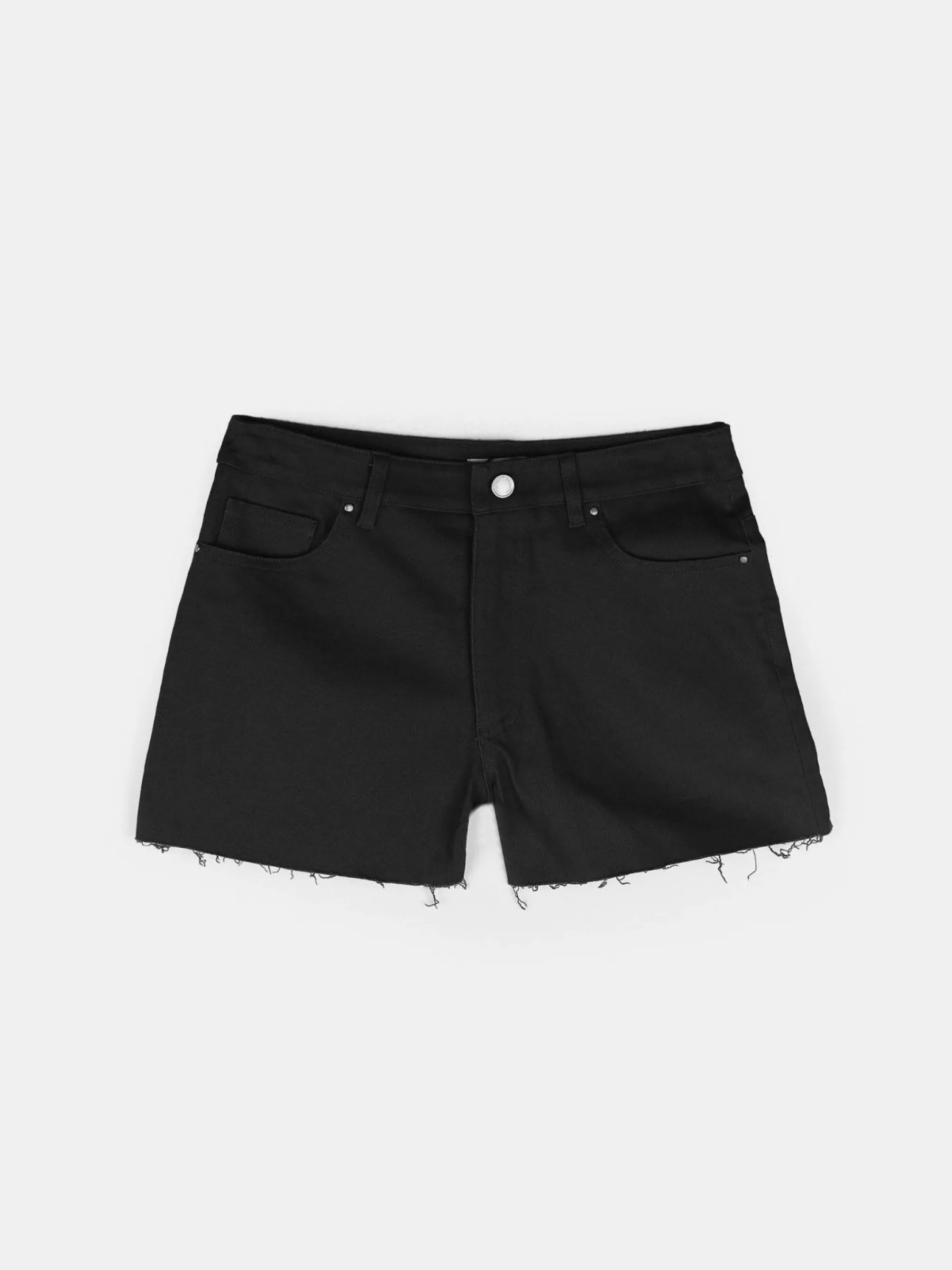 Kolor: czarnyKrój: straightTyp: spodenkiDługość: krótkiPattern style: pojedynczy kolorDetal: na zamekMateriał: baw…