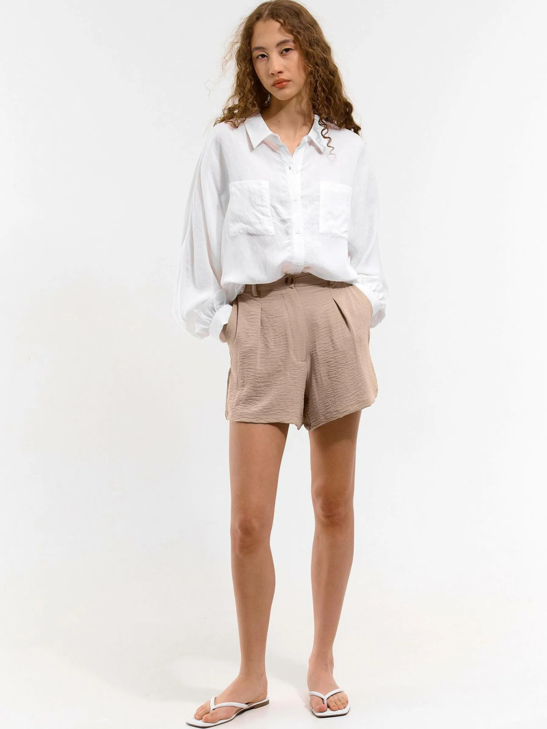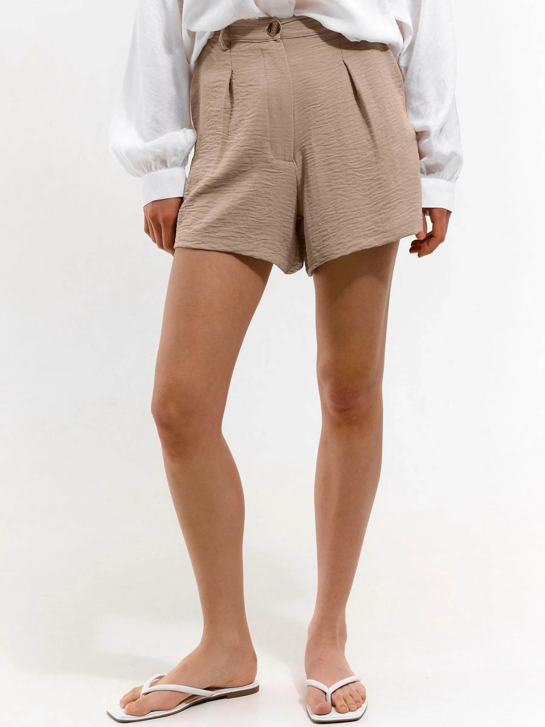 Kolor: beżowy, brązowyKrój: straightTyp: spodenkiDługość: krótkiPattern style: pojedynczy kolorDetal: na zamekMat…
