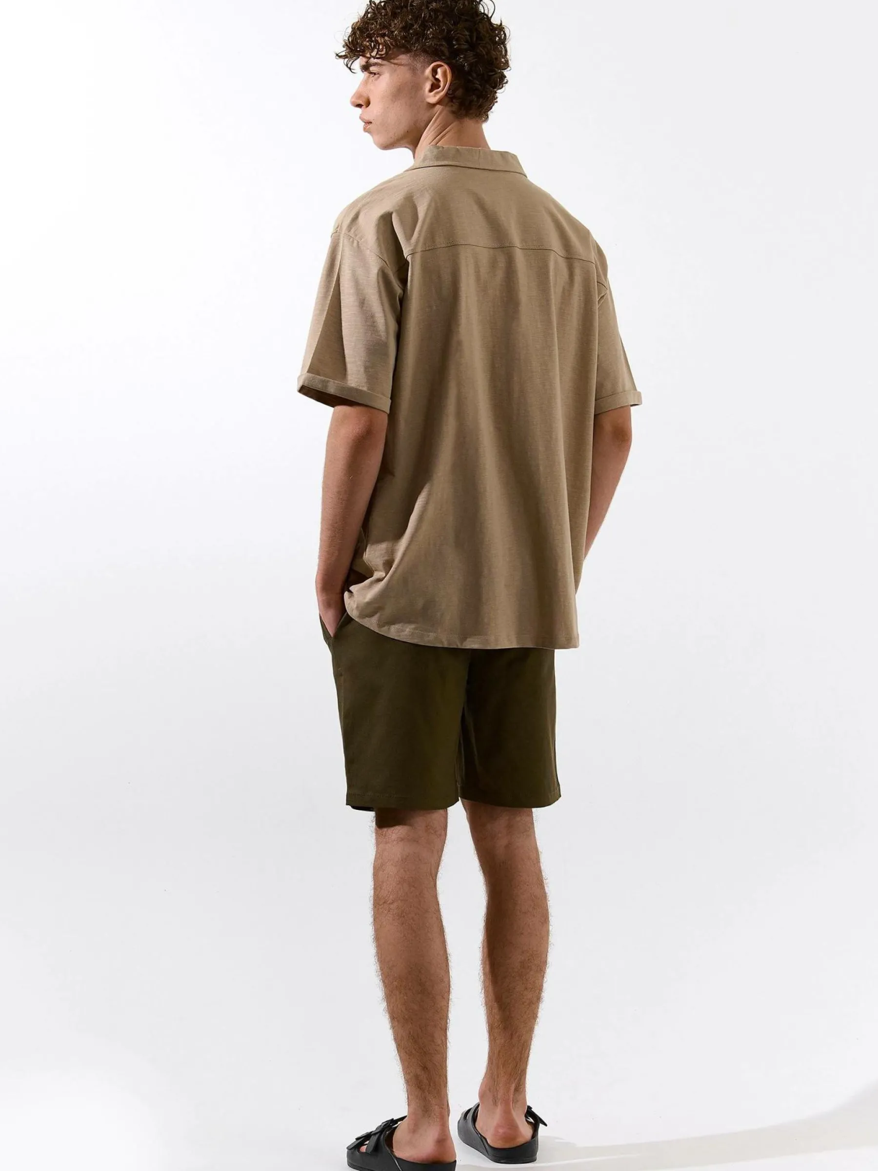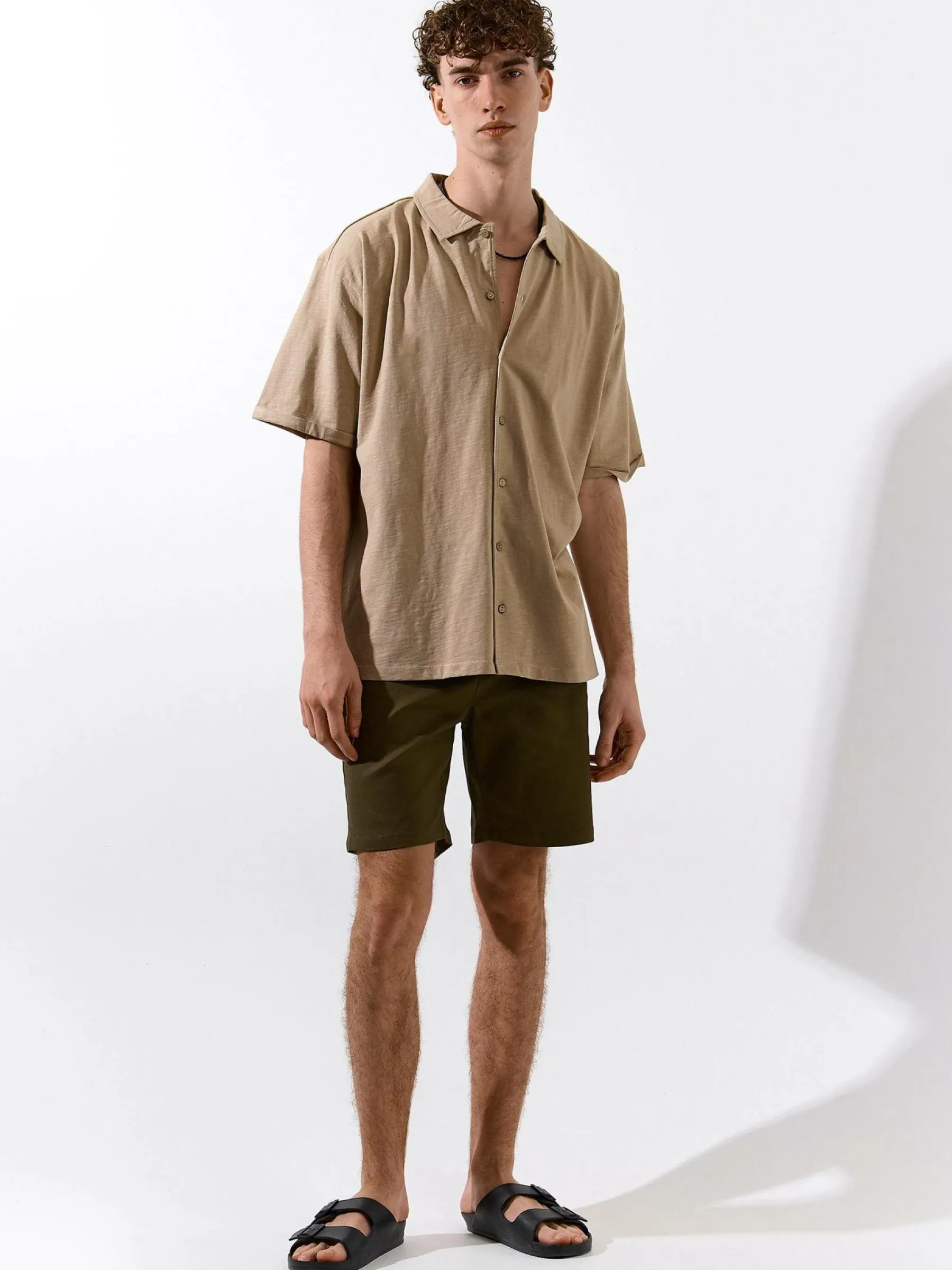 Kolor: khaki, zielonyKrój: straightTyp: spodenkiDługość: krótkiPattern style: pojedynczy kolorDetal: ze sznurowanie…