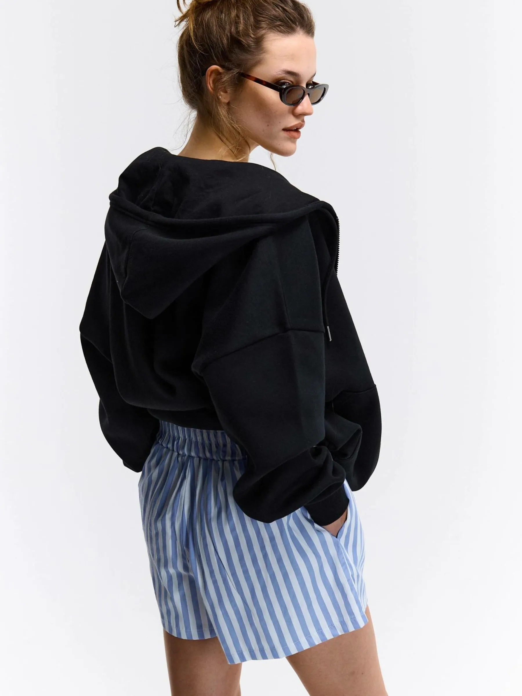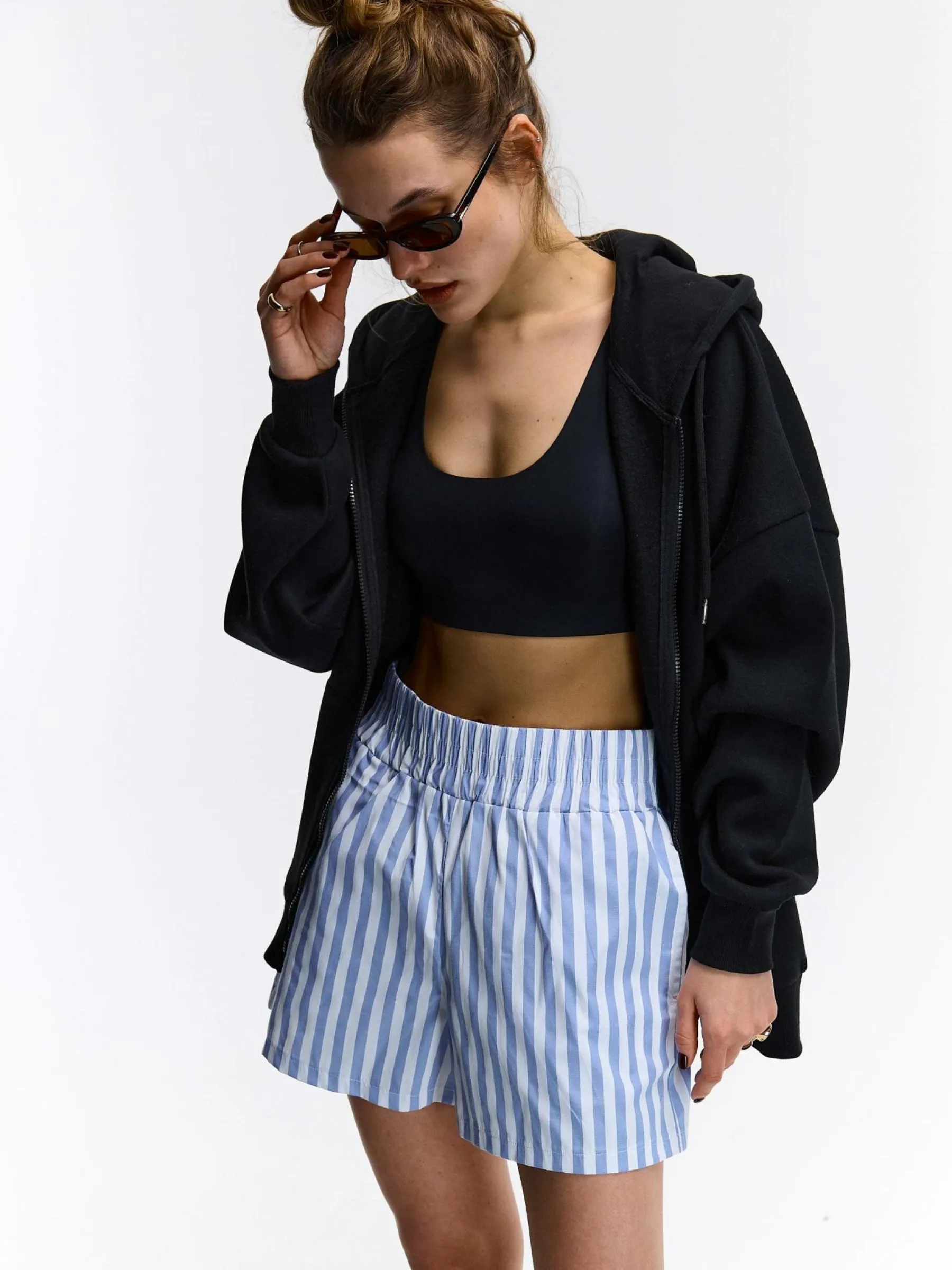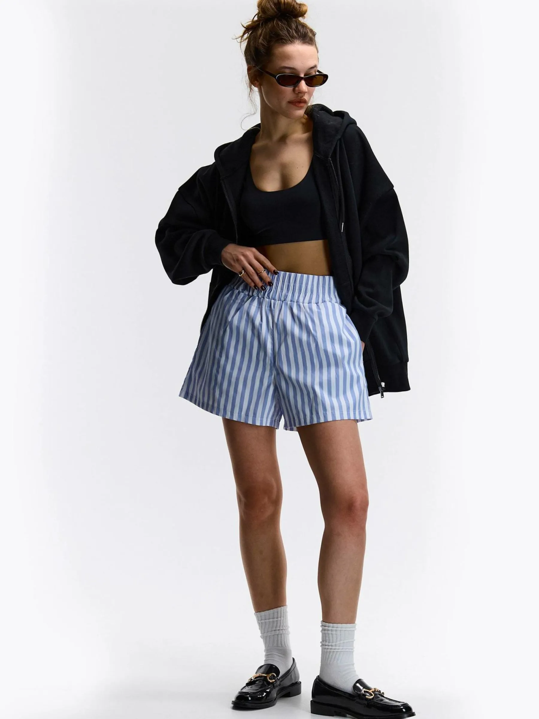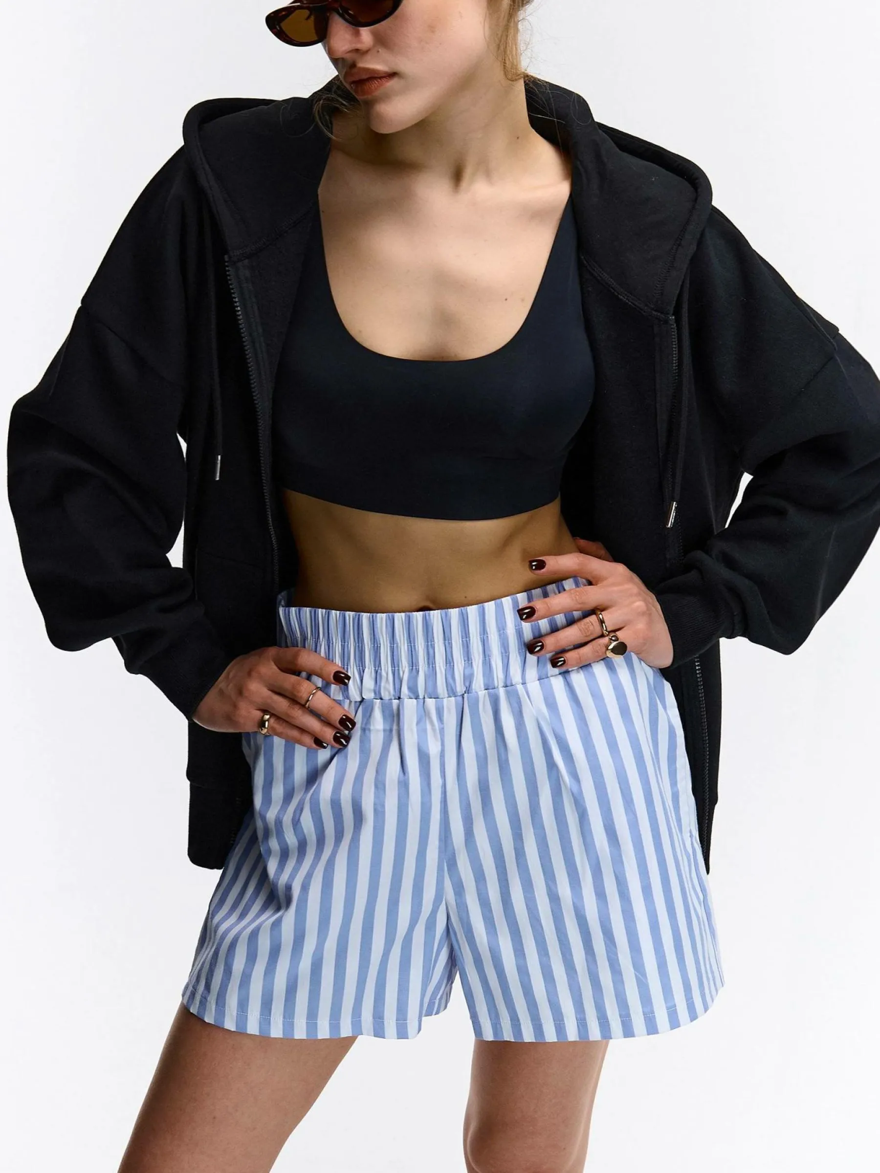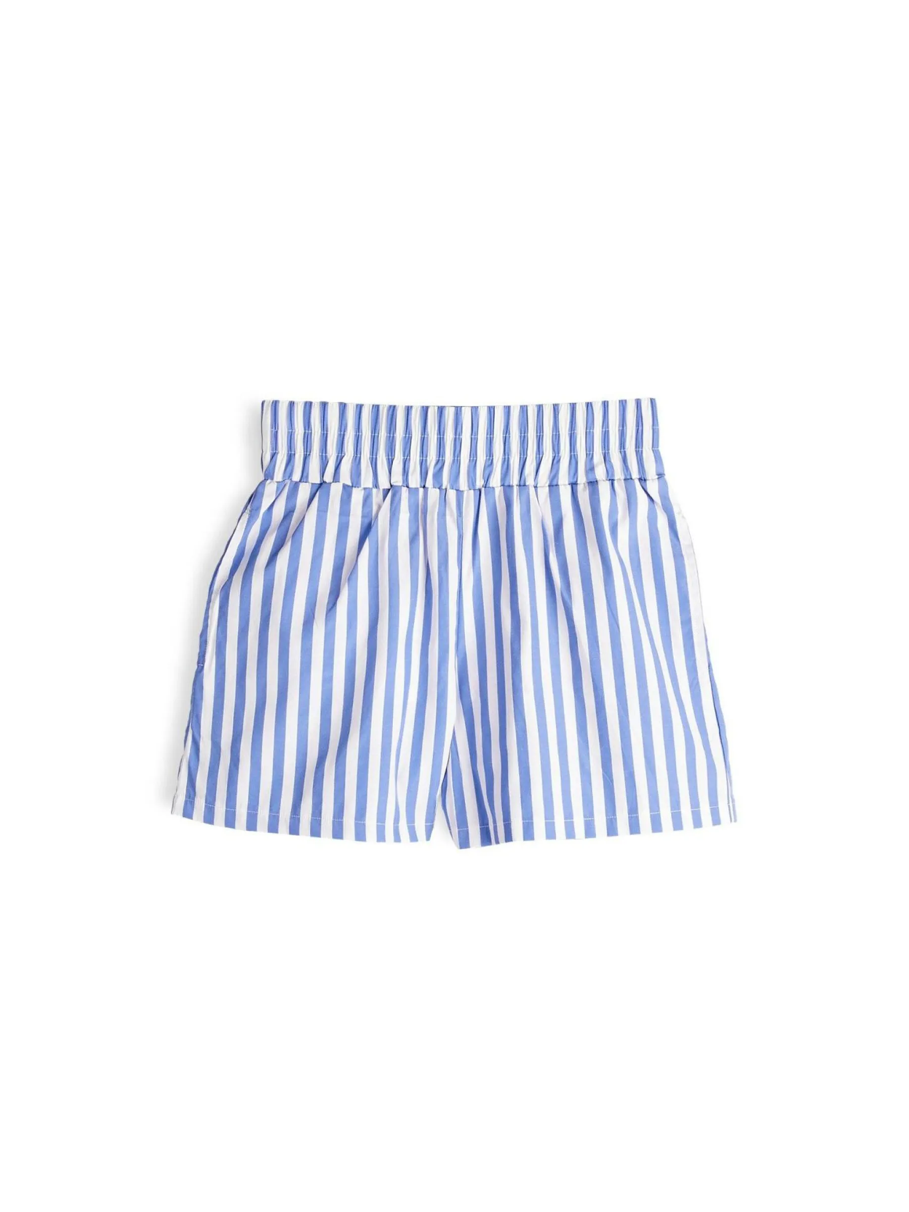 Kolor: niebieskiKrój: straightTyp: spodenkiDługość: krótkiPattern style: w prążkiDetal: z elastyczną opaskąMate…