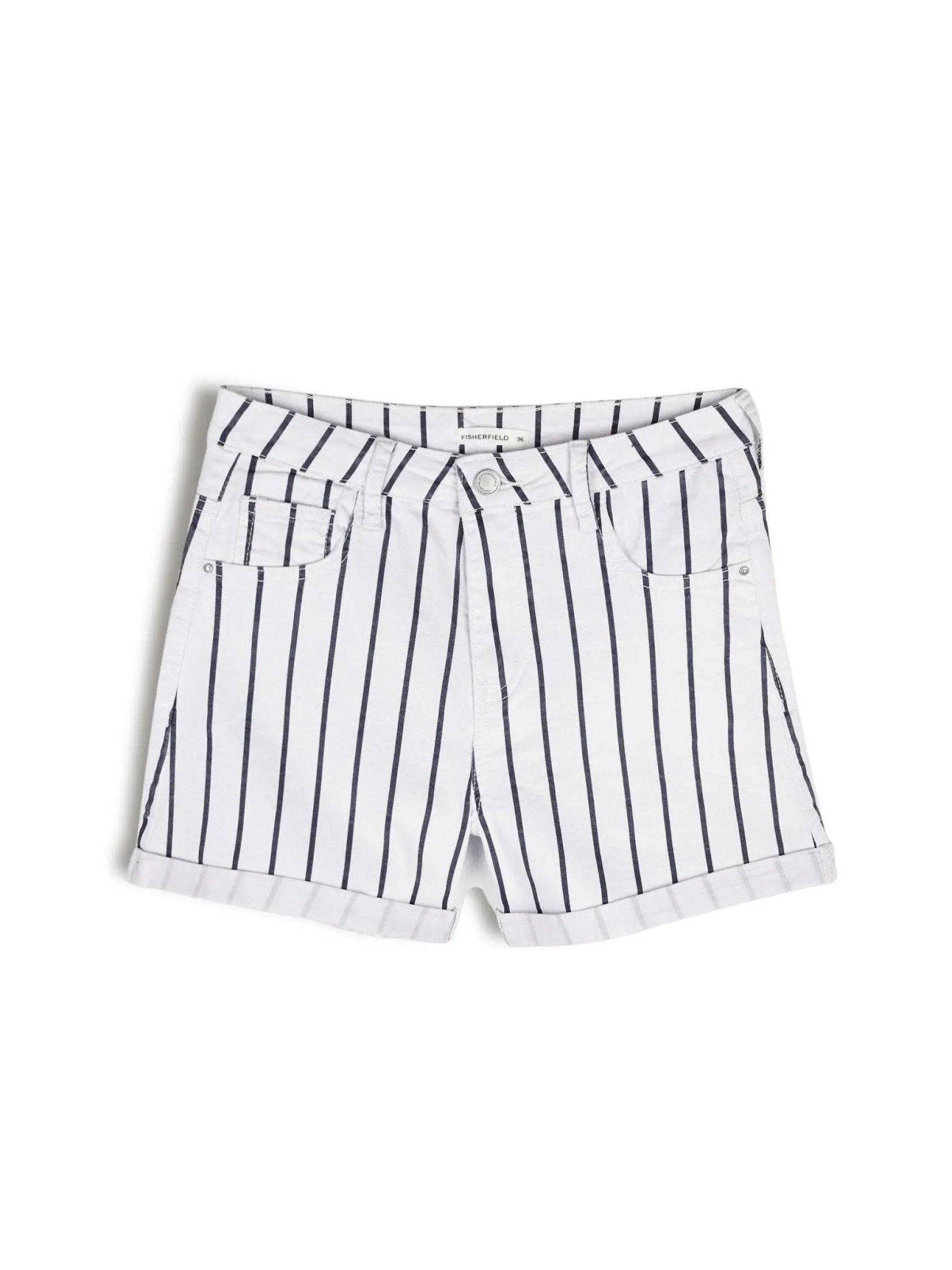Kolor: białyKrój: straightTyp: spodenkiDługość: krótkiPattern style: w prążkiDetal: na zamekMateriał: mieszanyP…