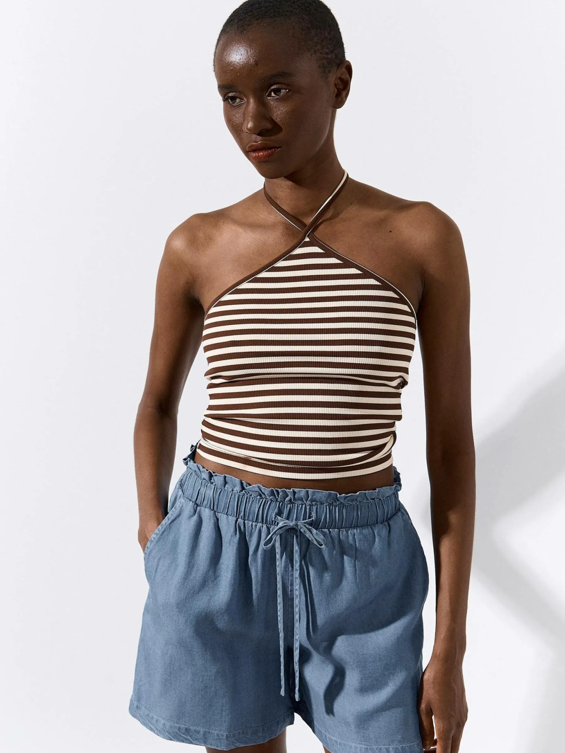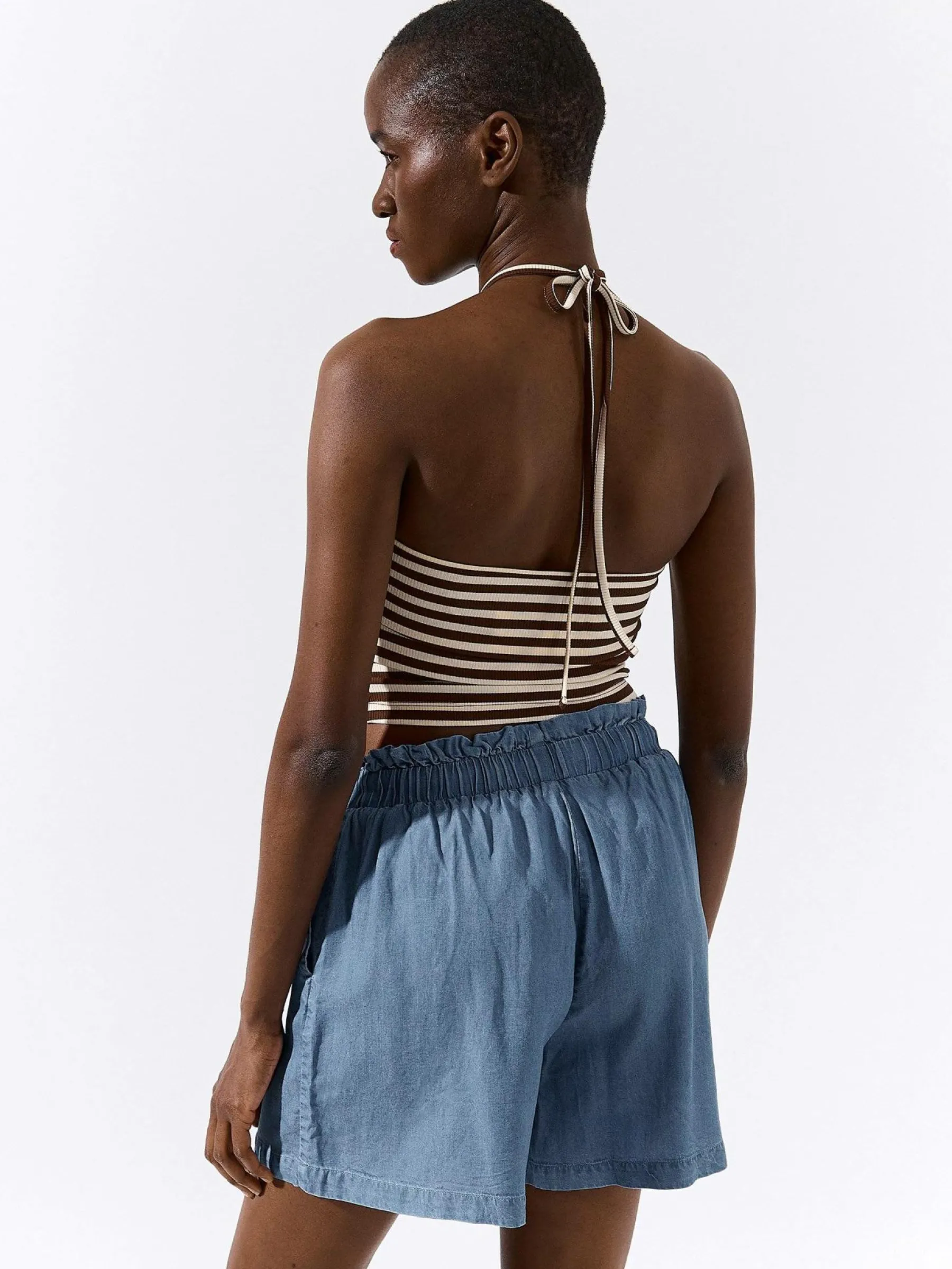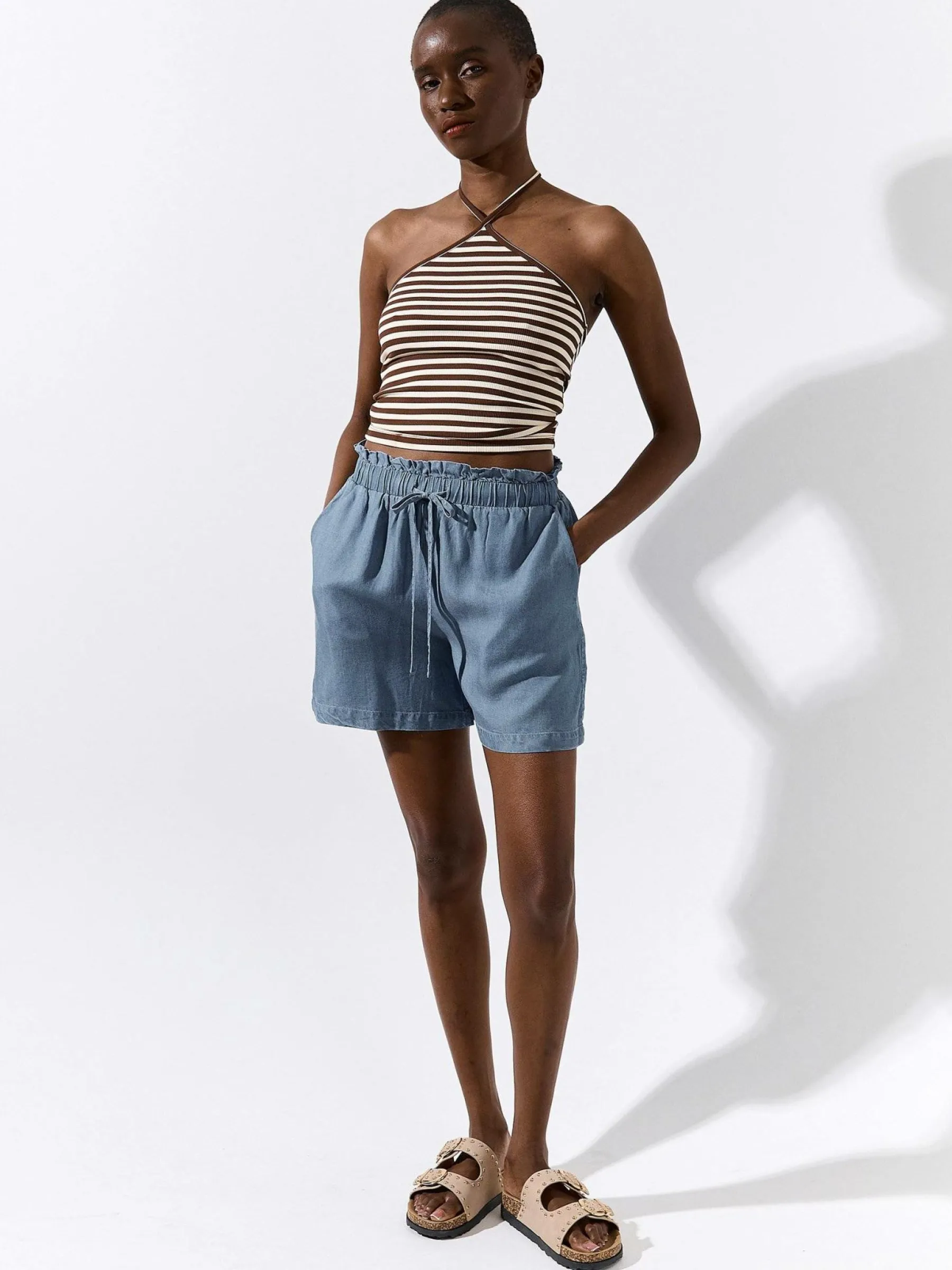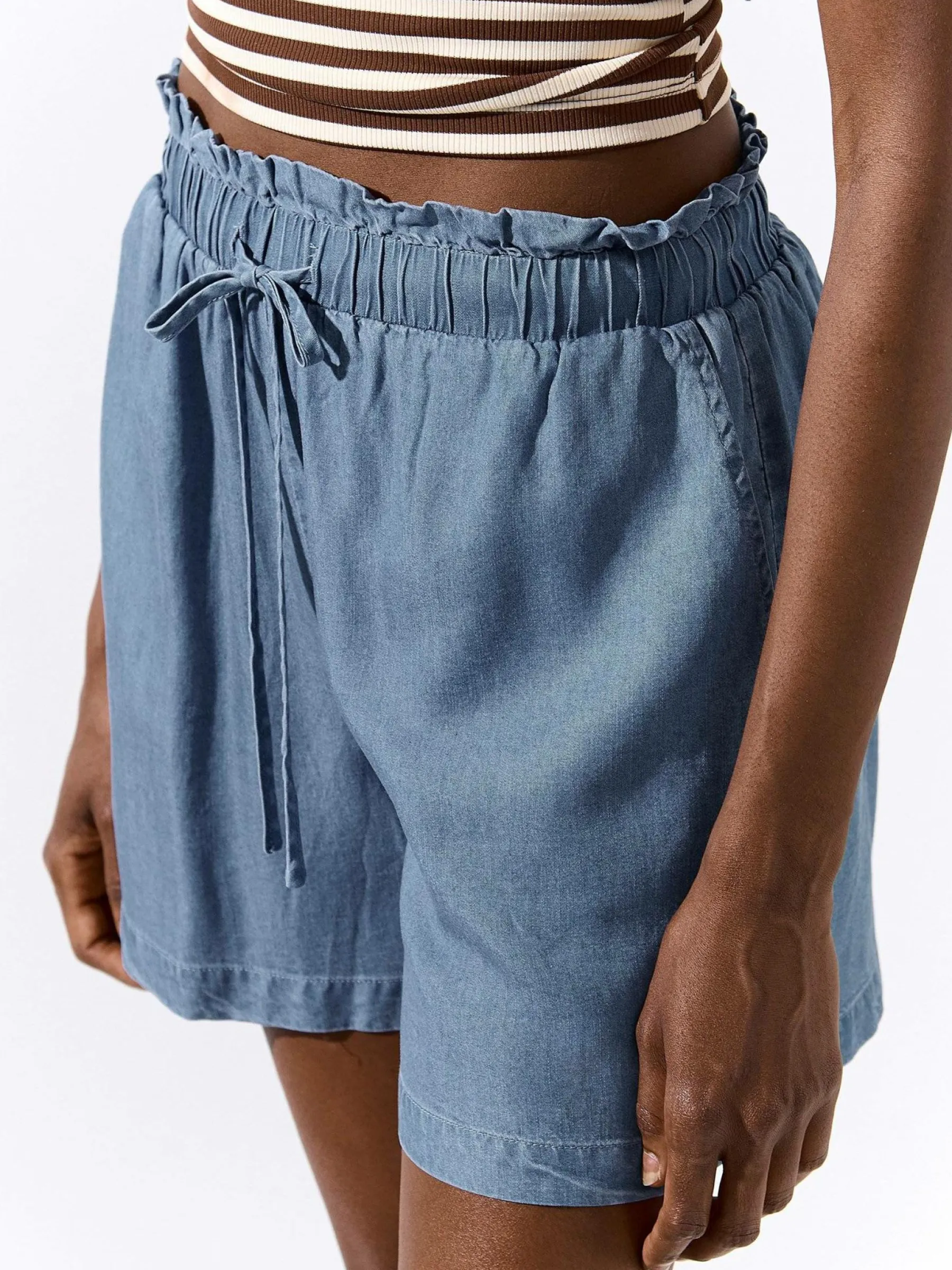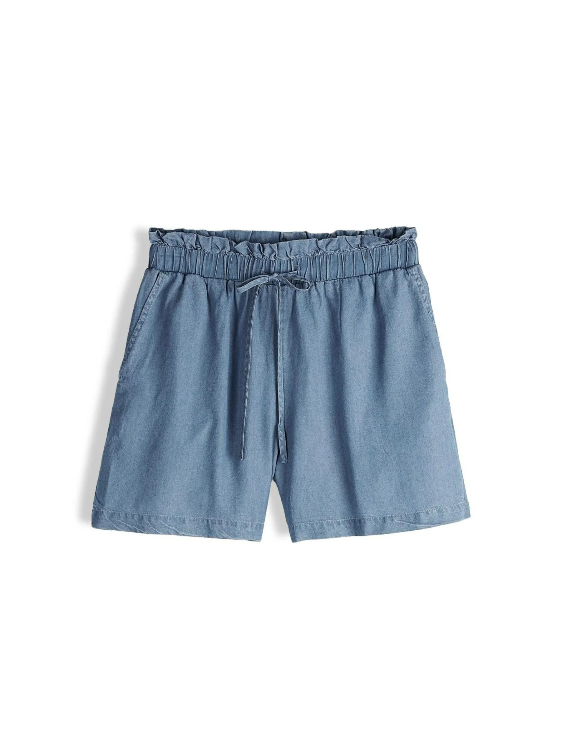 Kolor: niebieskiKrój: paperbagTyp: spodenkiDługość: krótkiPattern style: pojedynczy kolorDetal: z kieszeniami, ze s…