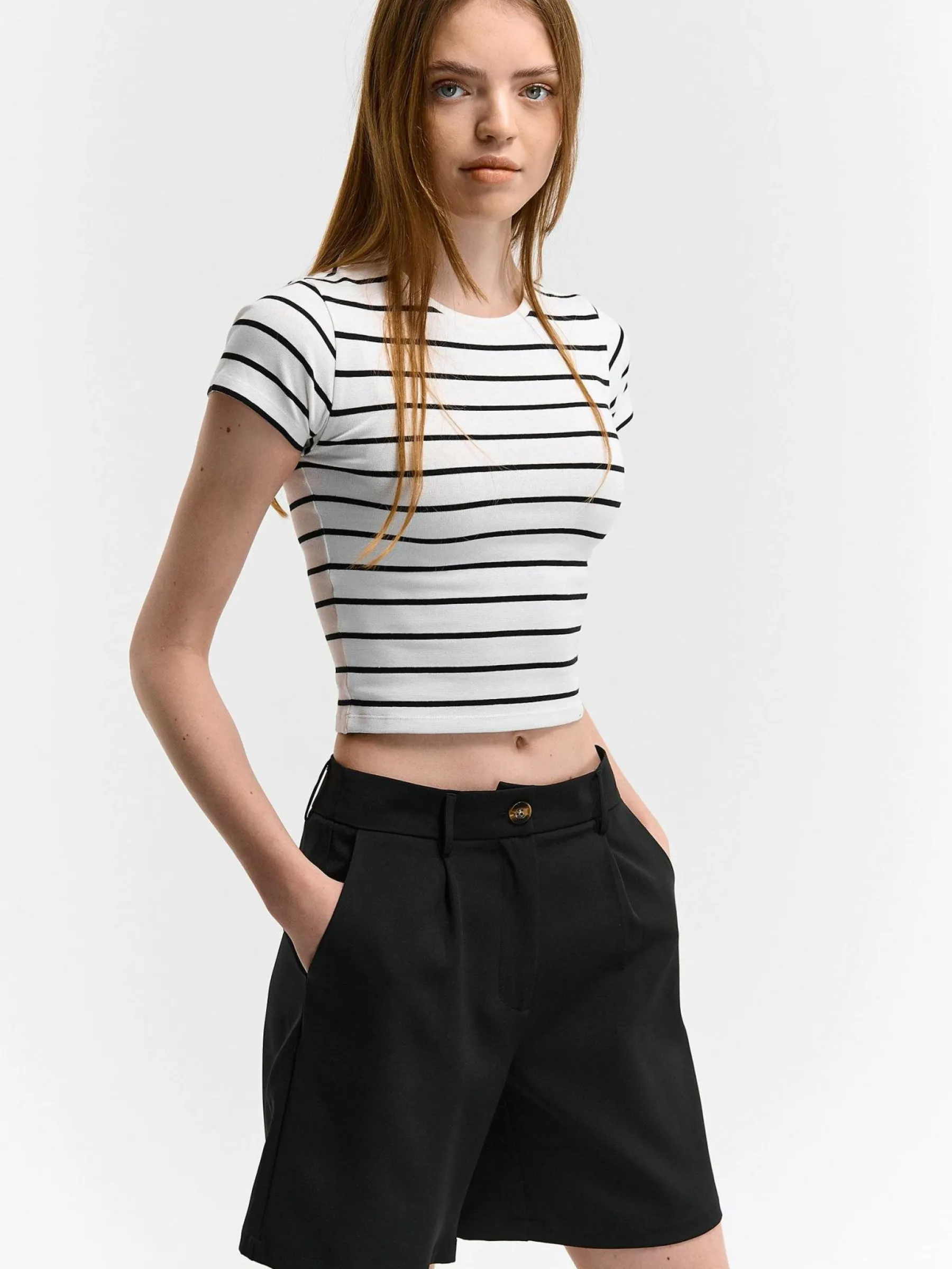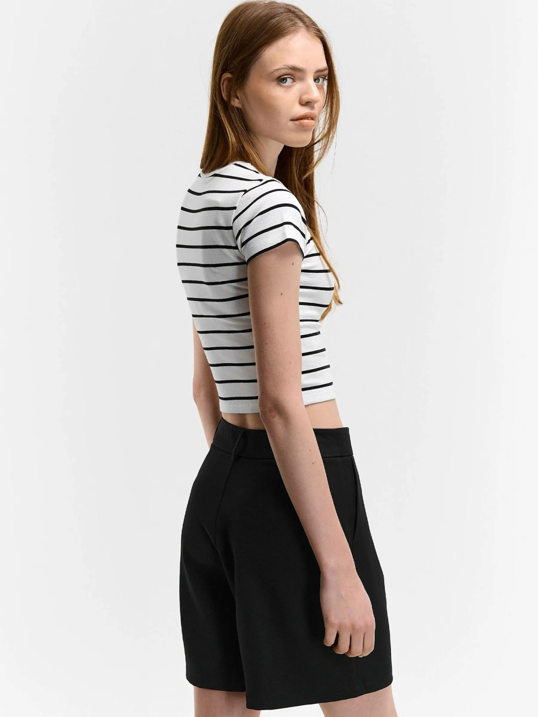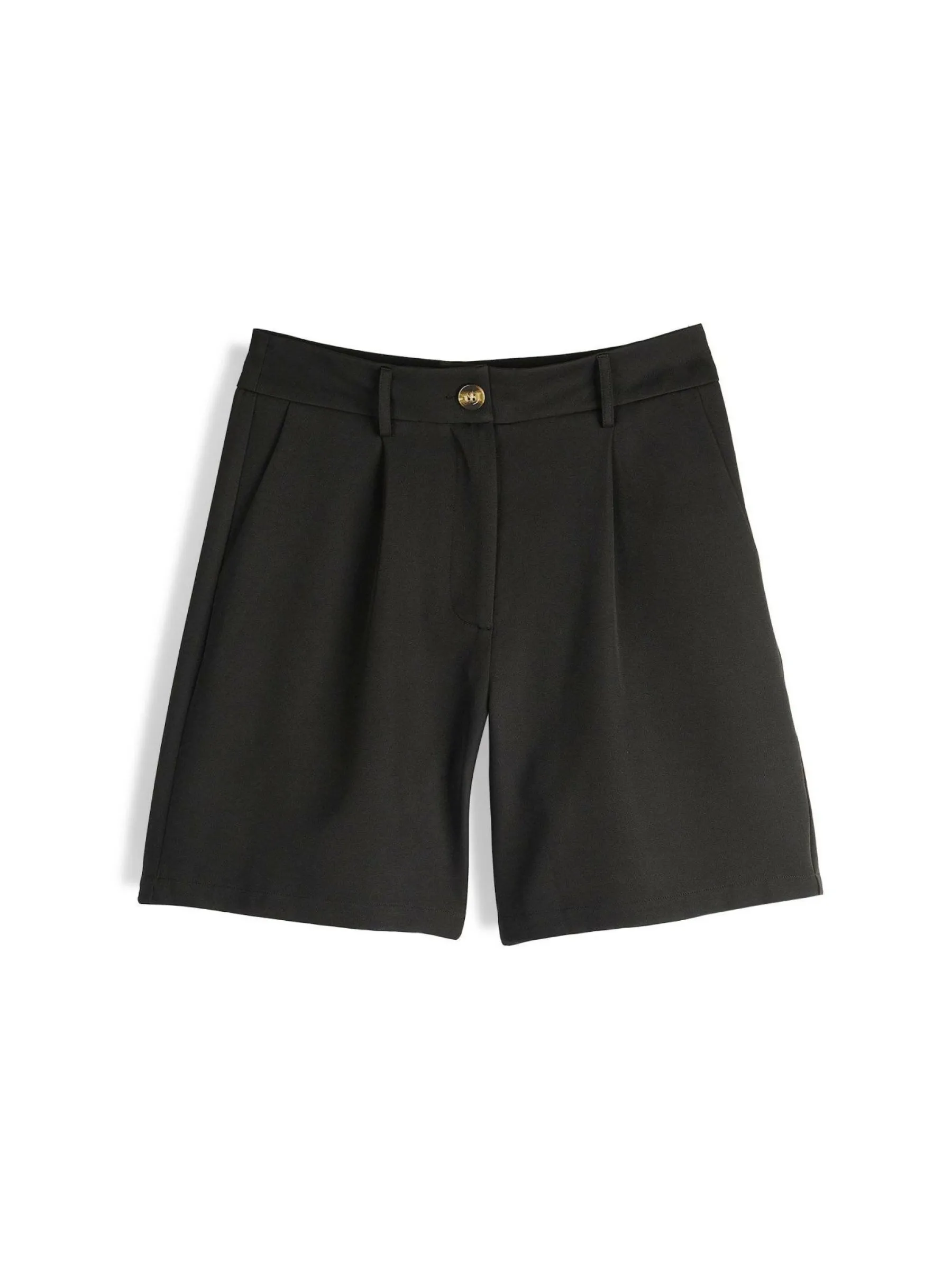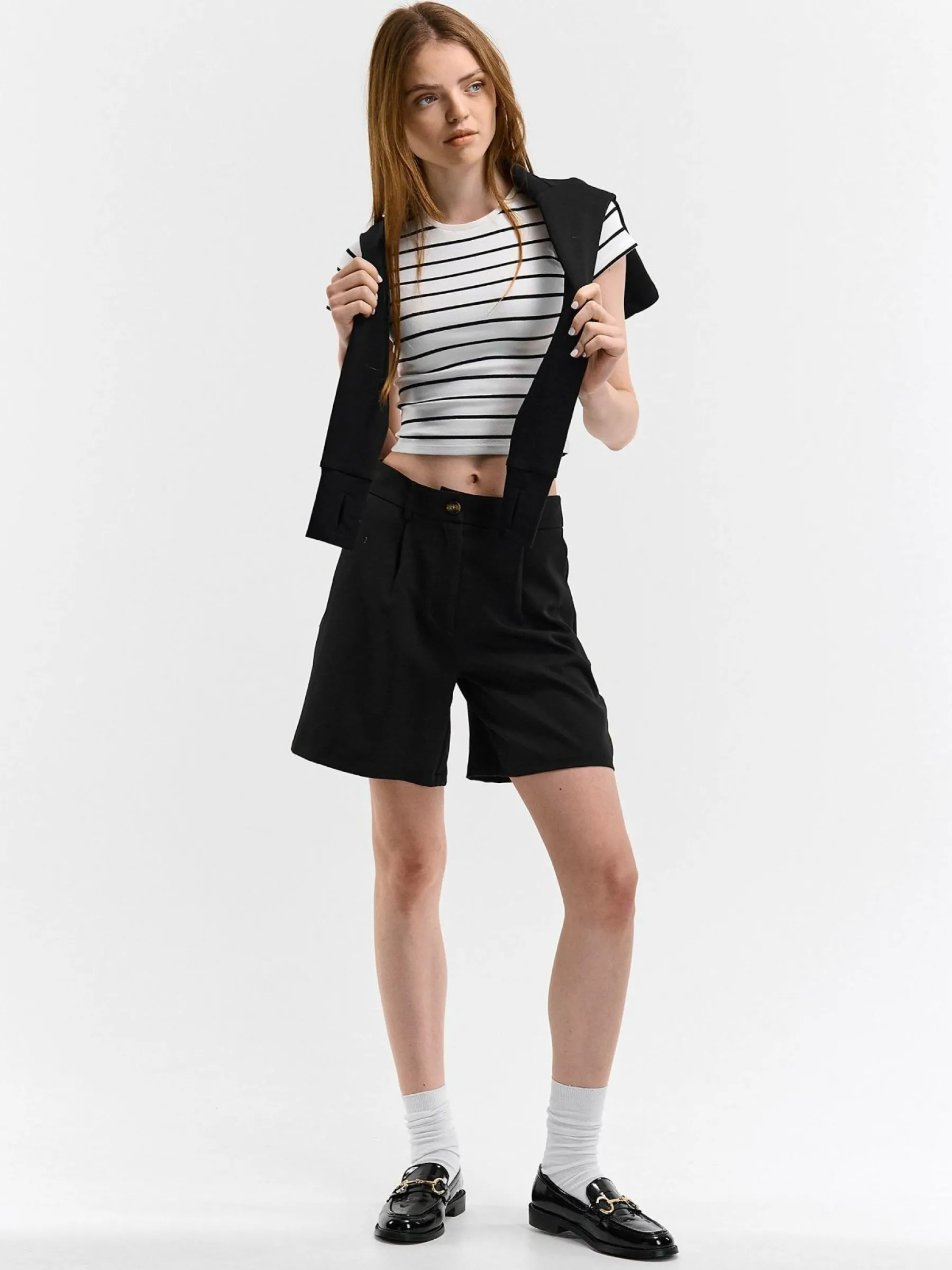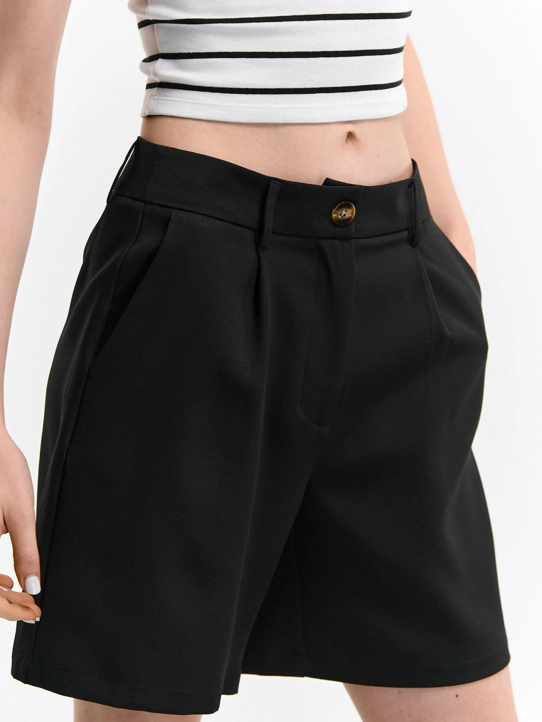 Kolor: czarnyKrój: straightTyp: spodenkiDługość: krótkiPattern style: pojedynczy kolorDetal: na zamek, z kieszeniam…