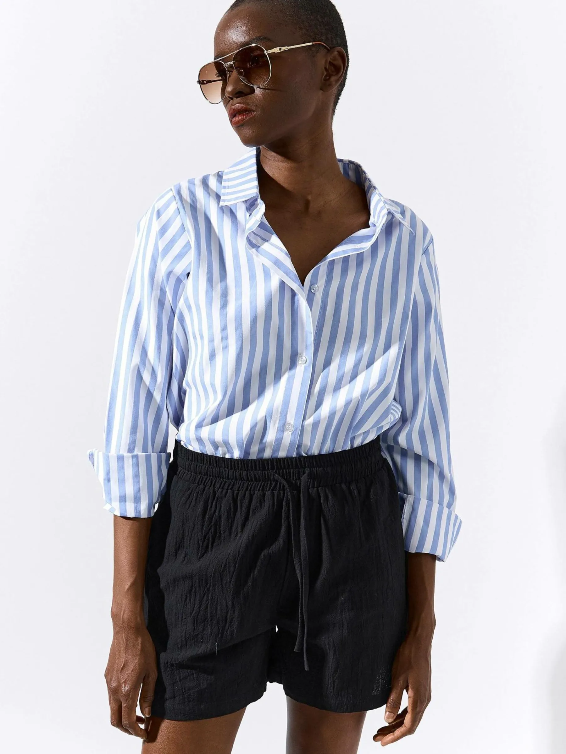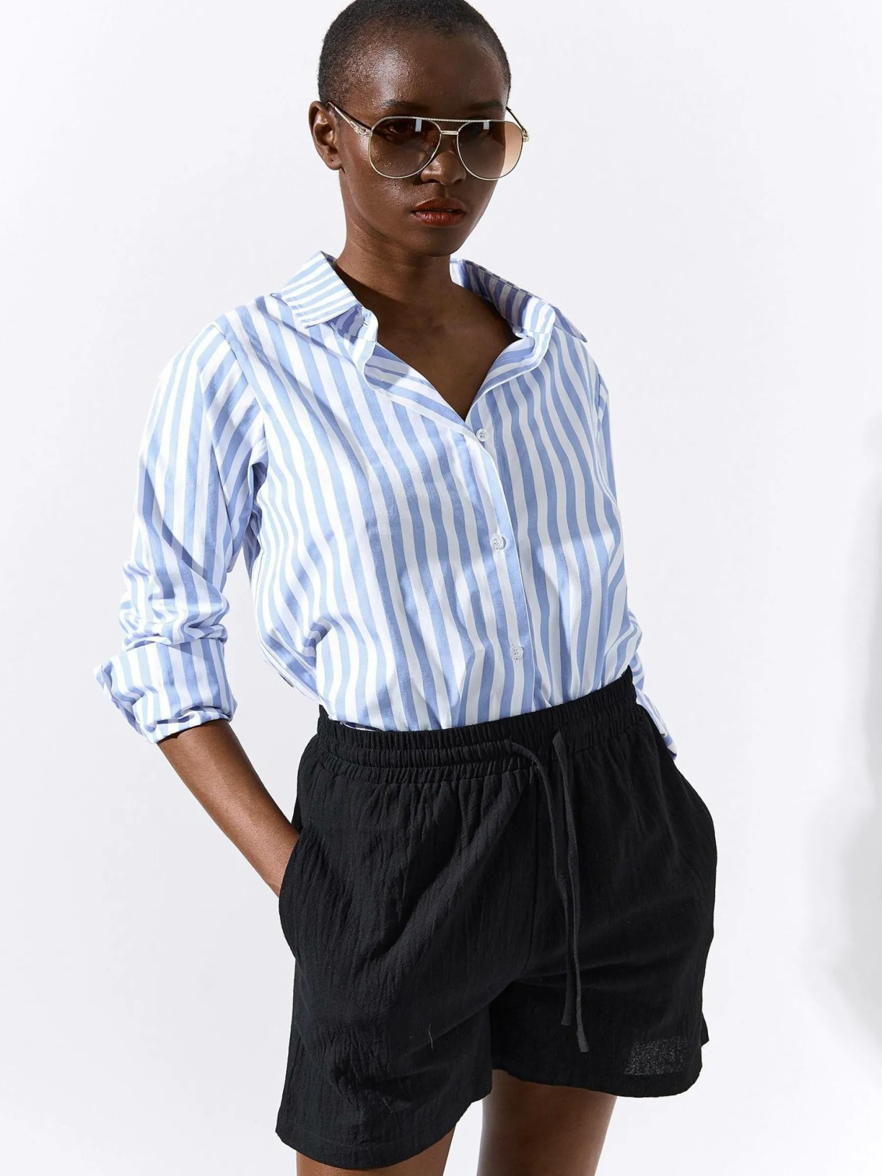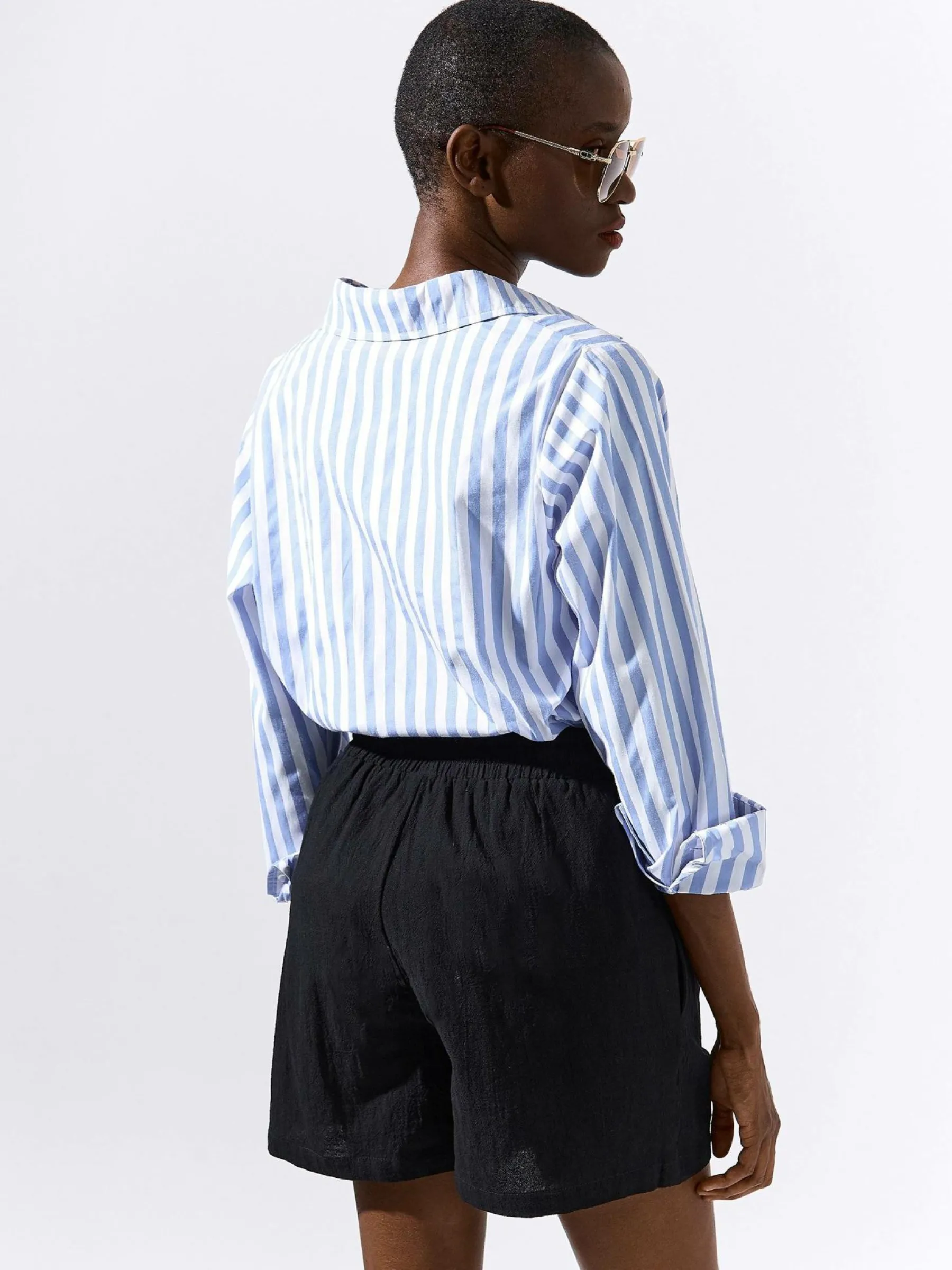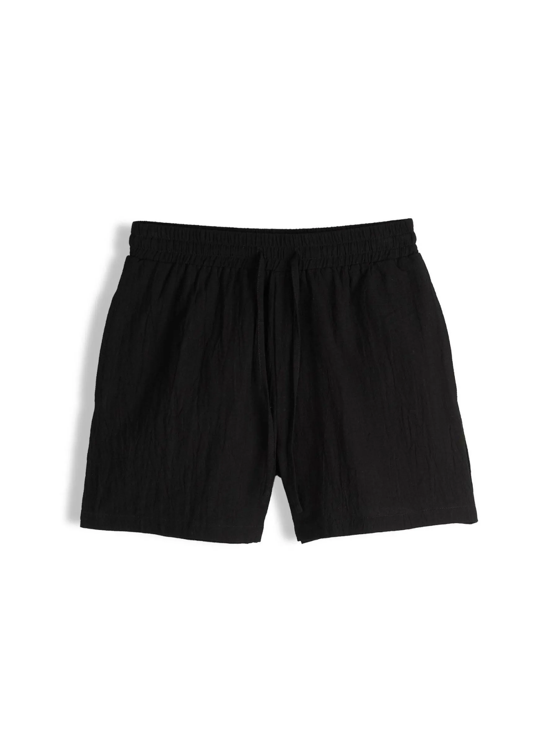 Kolor: czarnyKrój: straightTyp: spodenkiDługość: krótkiPattern style: pojedynczy kolorDetal: ze sznurowaniemMateria…