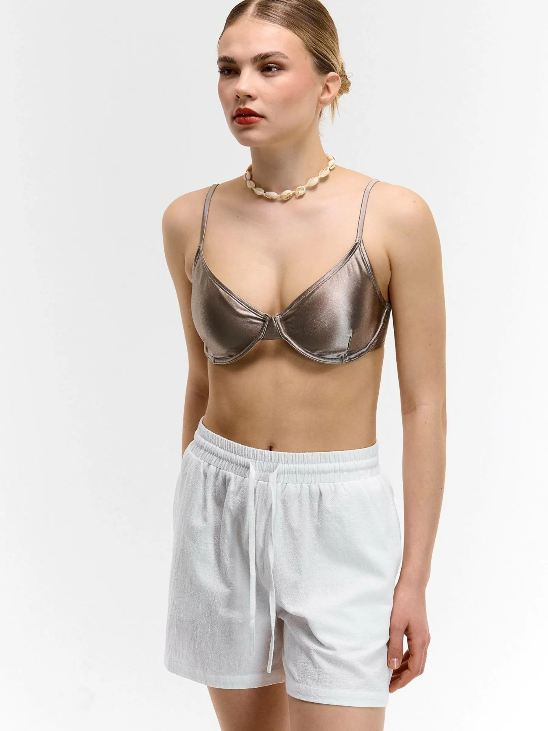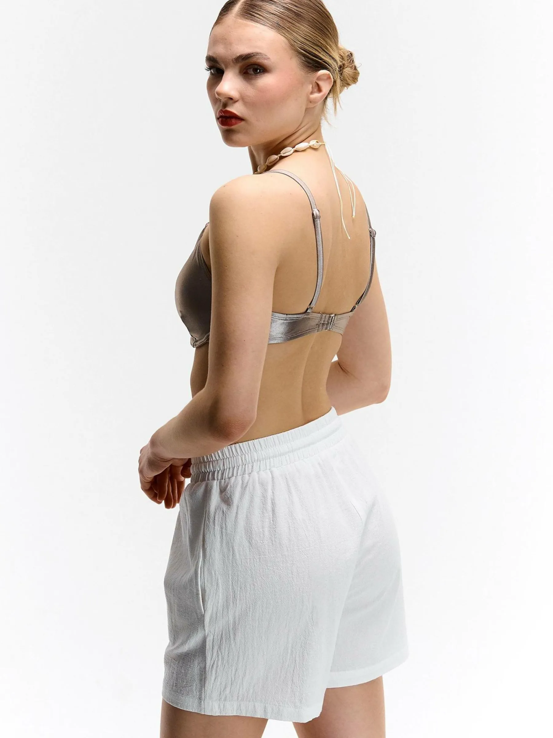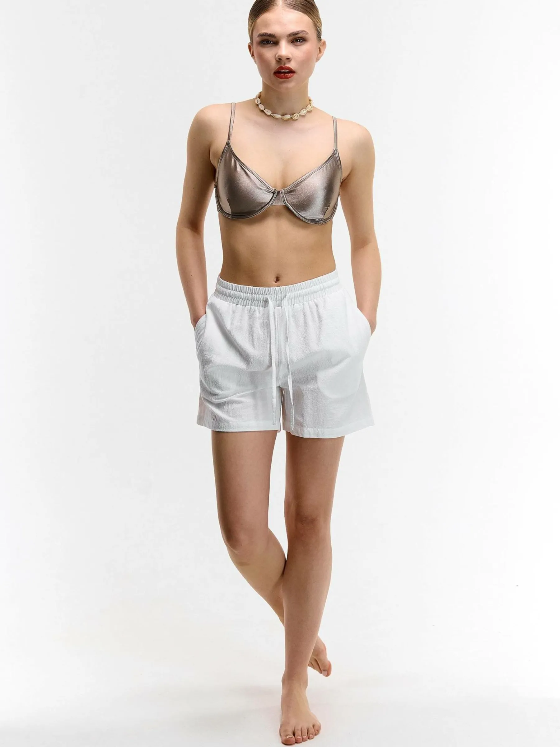 Kolor: białyKrój: straightTyp: spodenkiDługość: krótkiPattern style: pojedynczy kolorDetal: ze sznurowaniemMateria…