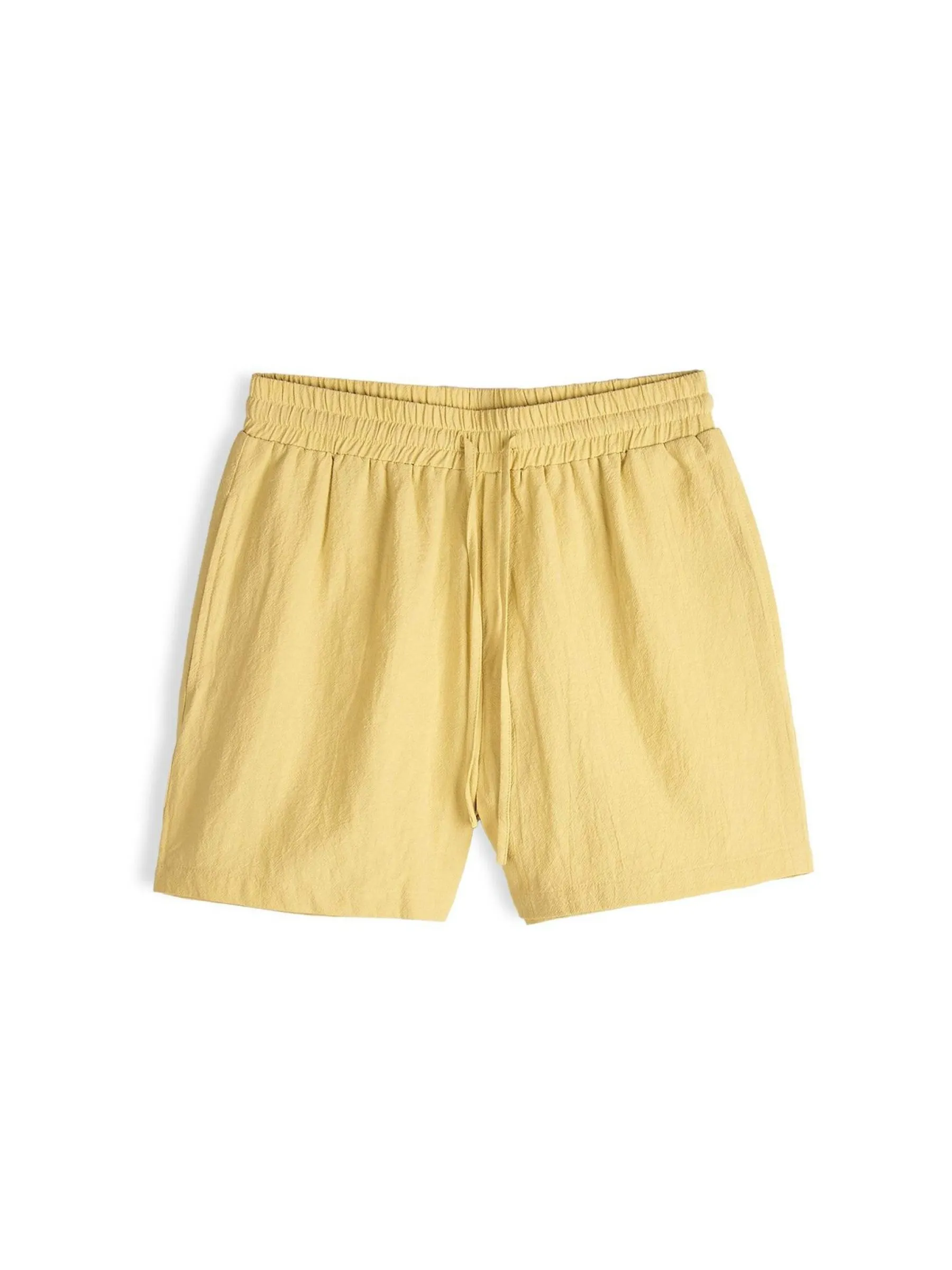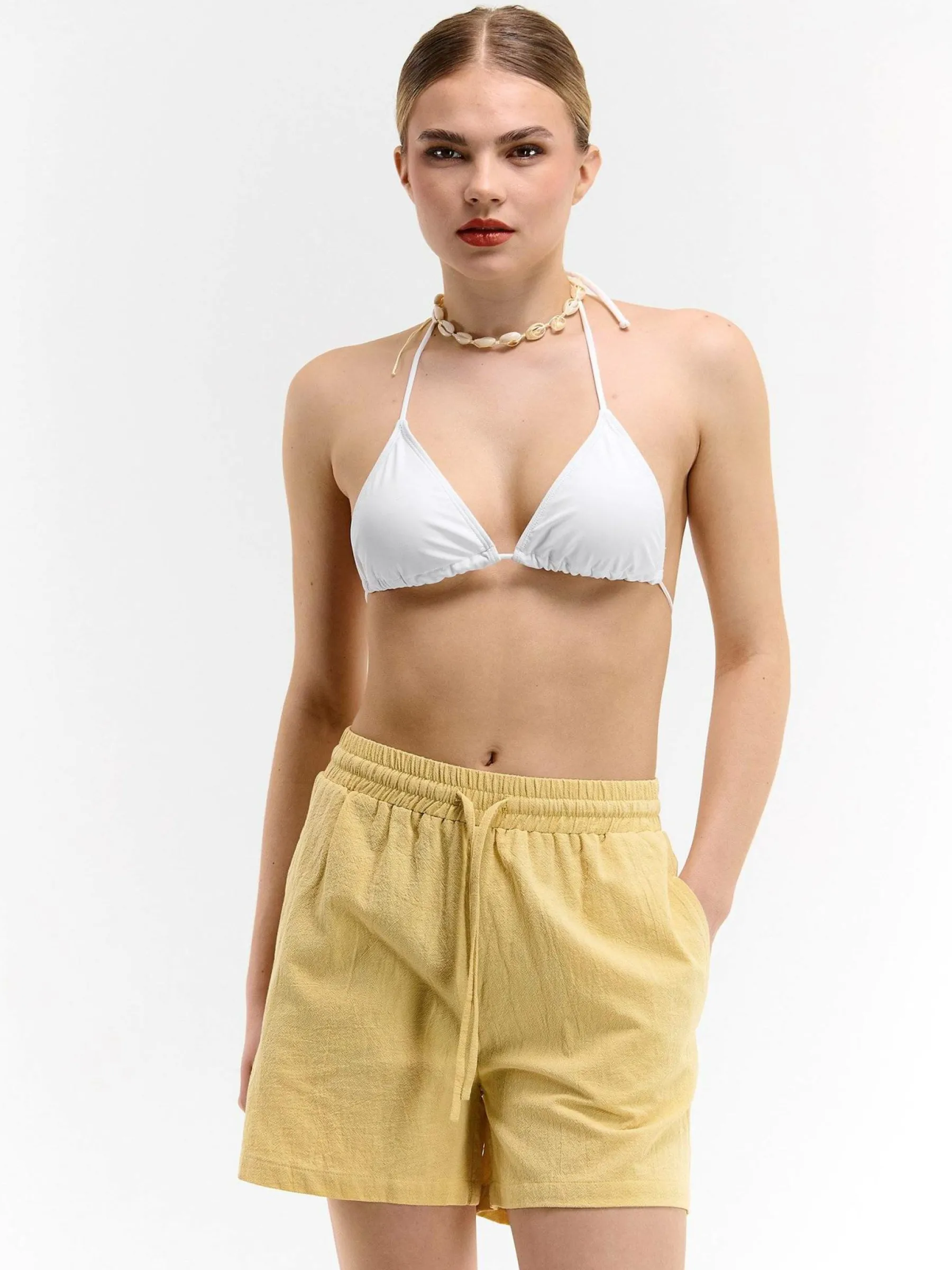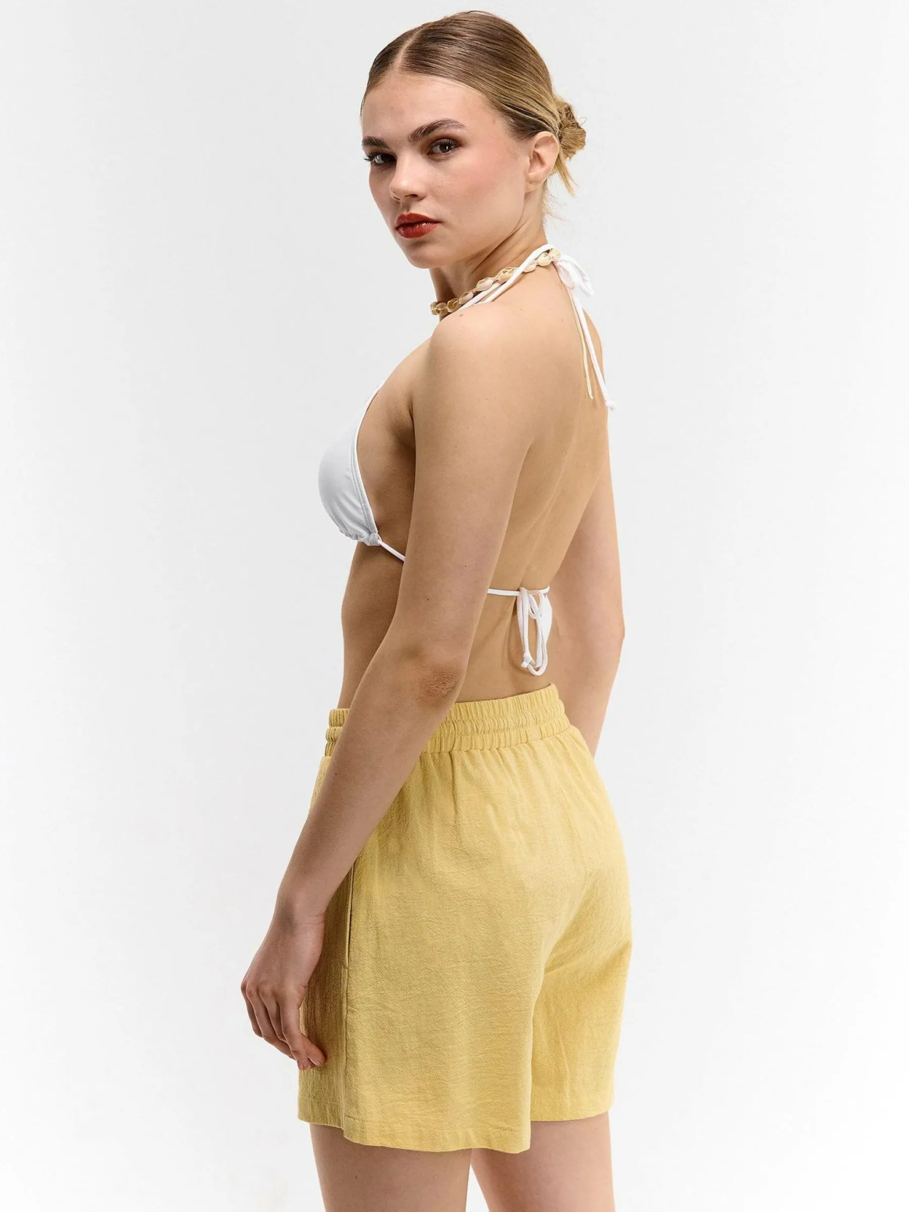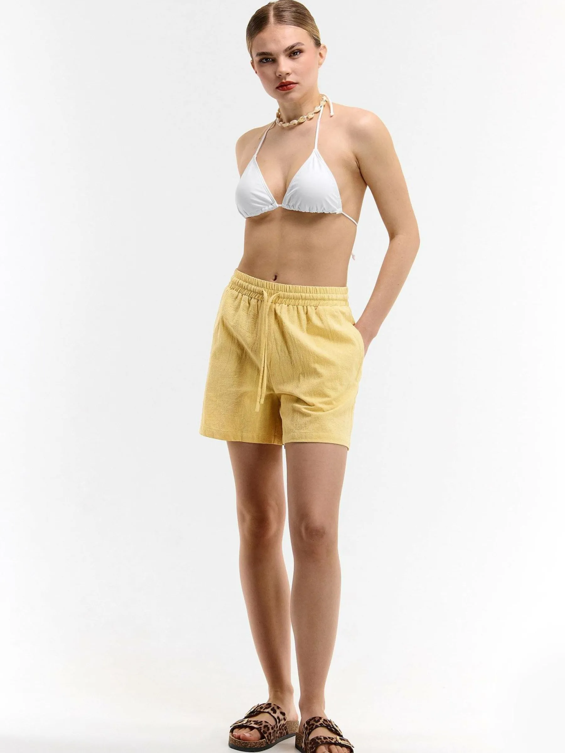 Kolor: żółtyKrój: straightTyp: spodenkiDługość: krótkiPattern style: pojedynczy kolorDetal: ze sznurowaniemMater…